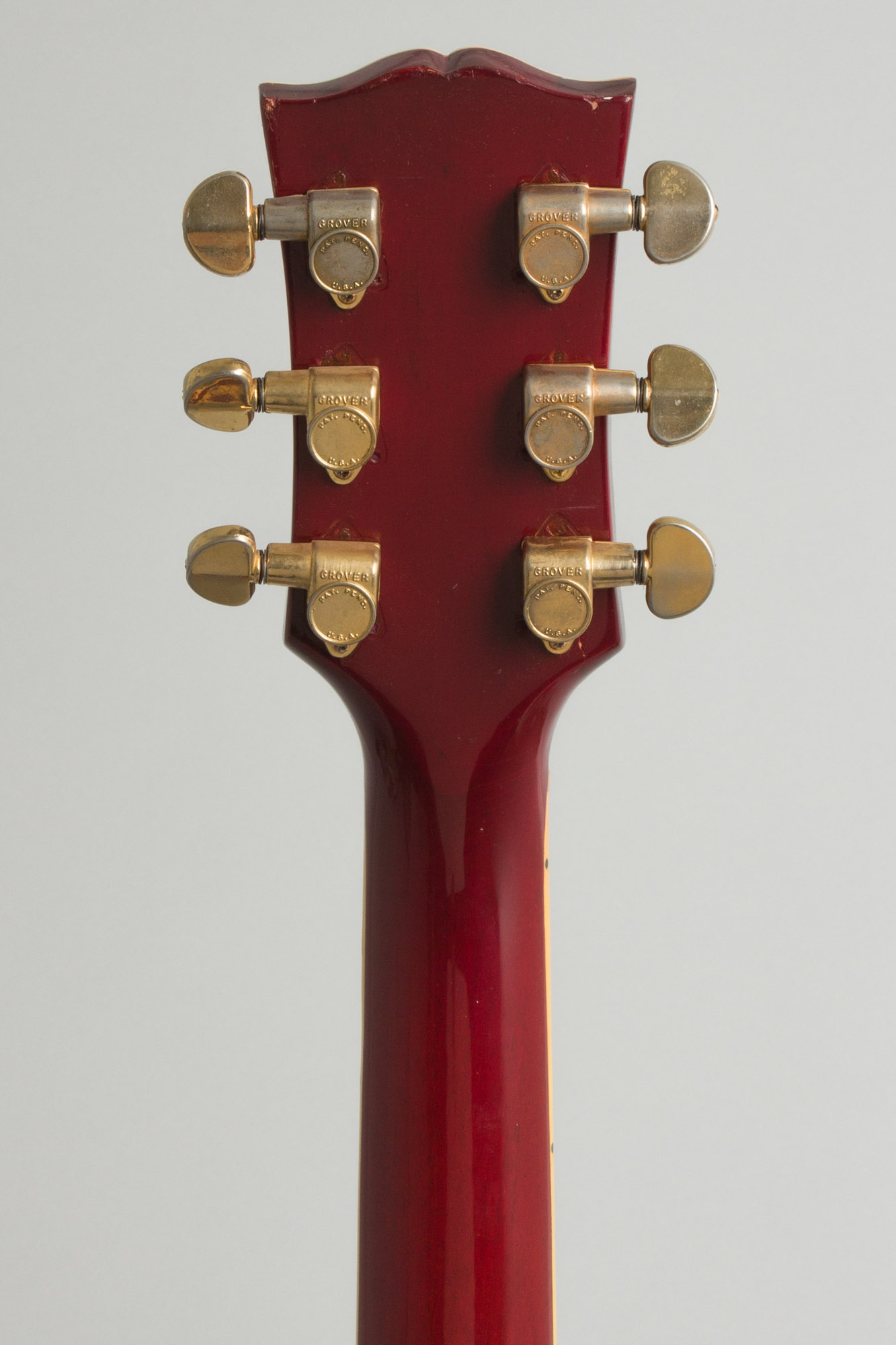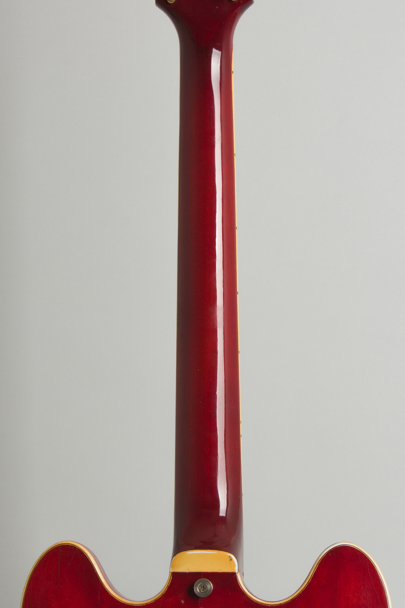 Now nearly 60 years old this ES-355 has definitely had some adventures. The entire back of neck has been overfinished, with an added veneer over the back of the headstock under this finish. There was almost certainly some sort of headstock repair, though any crack would have been higher on the peghead than most. Examining inside the truss rod cavity shows some evidence of work; the rod itself works cleanly. The serial number is missing from the back of the peghead, but is still intact on the label inside the body. There is visible touch up at neck heel, and inside the bass pickup cavity; the neck was almost certainly removed and reset along the way. It does not appear the entire neck was replaced, as the headstock veneer, inlay and binding are consistent with mid-1960s practice. There have been several sets of tuners installed; currently there are Grover Rotomatics from the 1970s with small scars visible on the headstock rear from other machines.