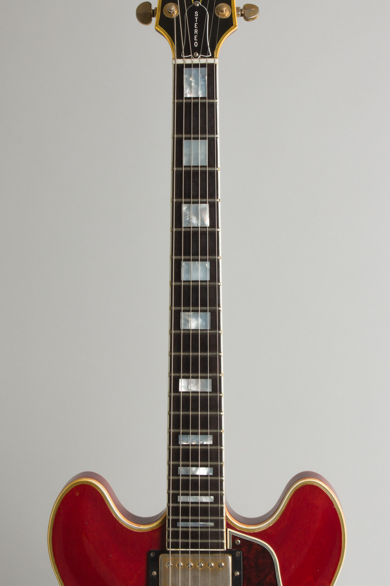 The laminated maple body is finished in a deep rich cherry hue with 7-ply top binding, 3-ply back binding and unbound f-holes. The one piece mahogany neck has a bound ebony fingerboard with mother-of-pearl block inlays. The nut is not the very slim style typical of this period but a full 1 11/16". Although fairly wide this particular neck is also fairly slim back-to-front in the lower positions reminiscent of the 1960-62 style. The headstock face is 5-ply bound with abalone Super 400 style split block inlay and replaced Grover tuners. All the hardware is gold plated, including the stock long Vibrola tailpiece.