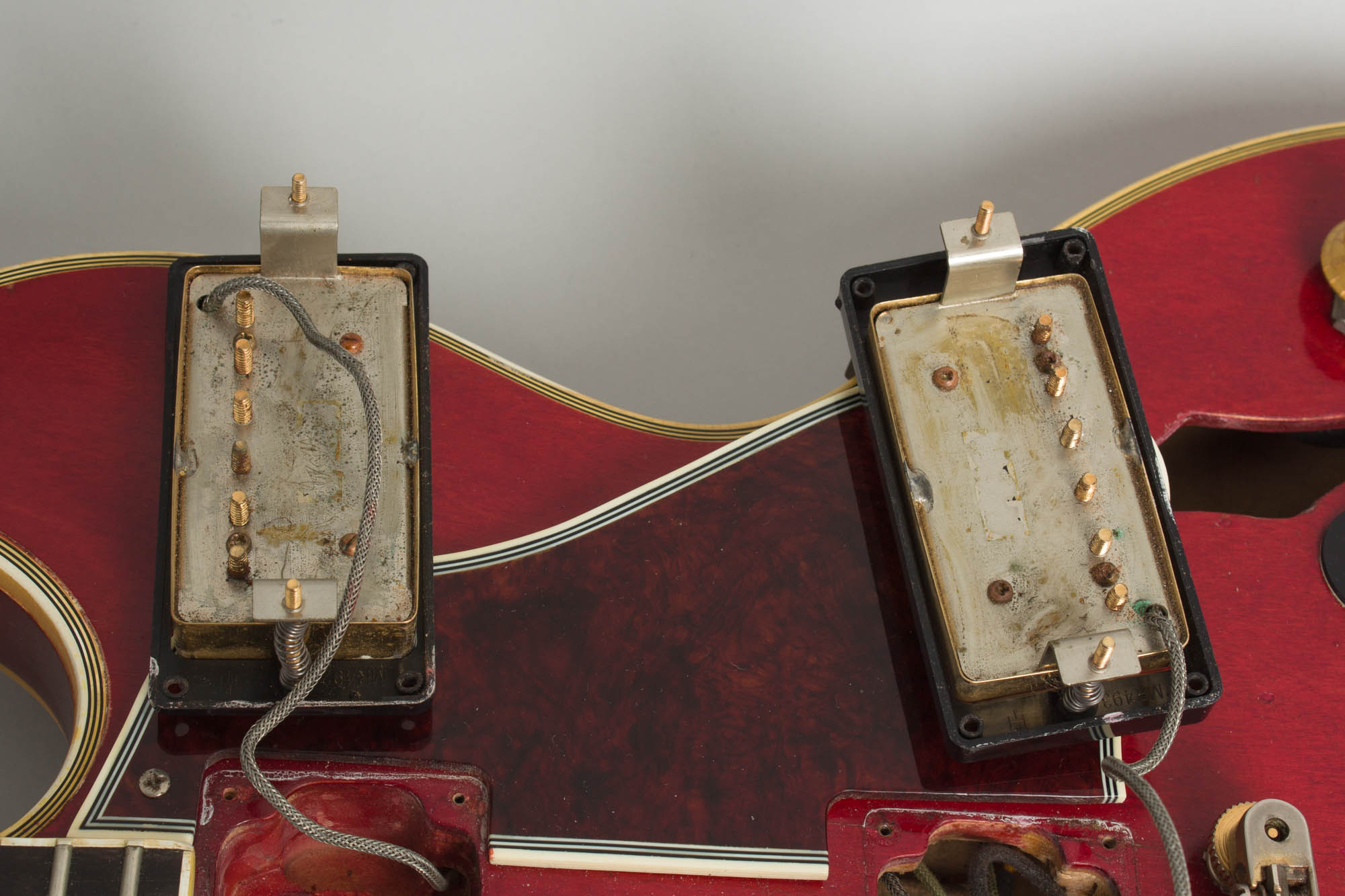 The guitar has been rewired correctly to a mono output, while the original Vari-Tone is still intact and working. The neck pickup has been opened to reverse magnet (required for in-phase operation in mono conversion) and there has been some re-wiring, while the pots and Vari-Tone hardware appear original. The pickups are the original units but both "Patent Number" decals have flaked off. For some reason someone added a small black plastic ring under the switch grommet and a black rubber ring under the Varitone plate. The strap buttons and truss rod cover are more recent.