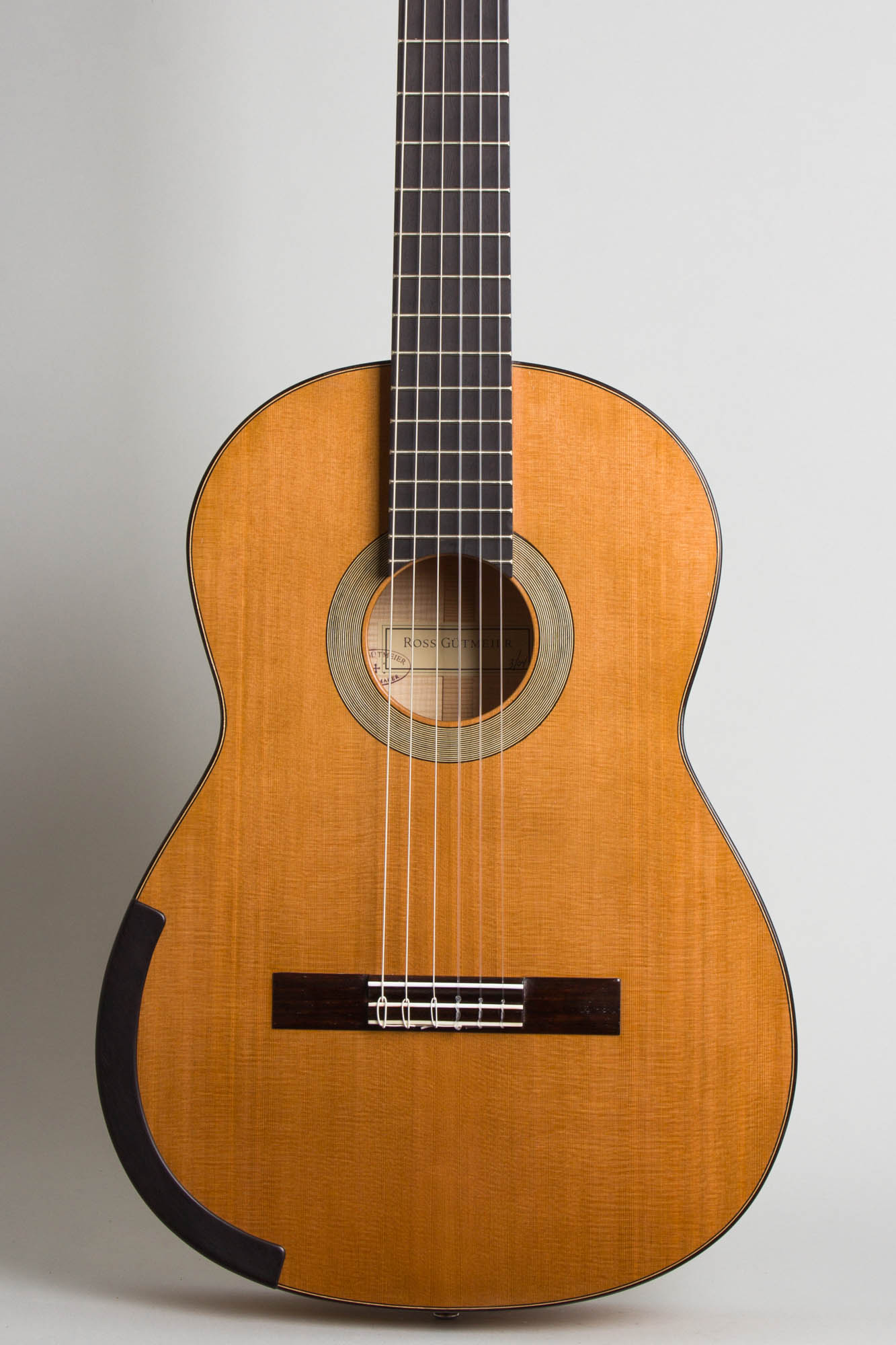 Ross Gutmeier Classical Guitar (2004), made in Baltimore, MD, French polish finish, maple back and sides, spruce top; Spanish cedar neck with ebony fingerboard, black rigid foam case.