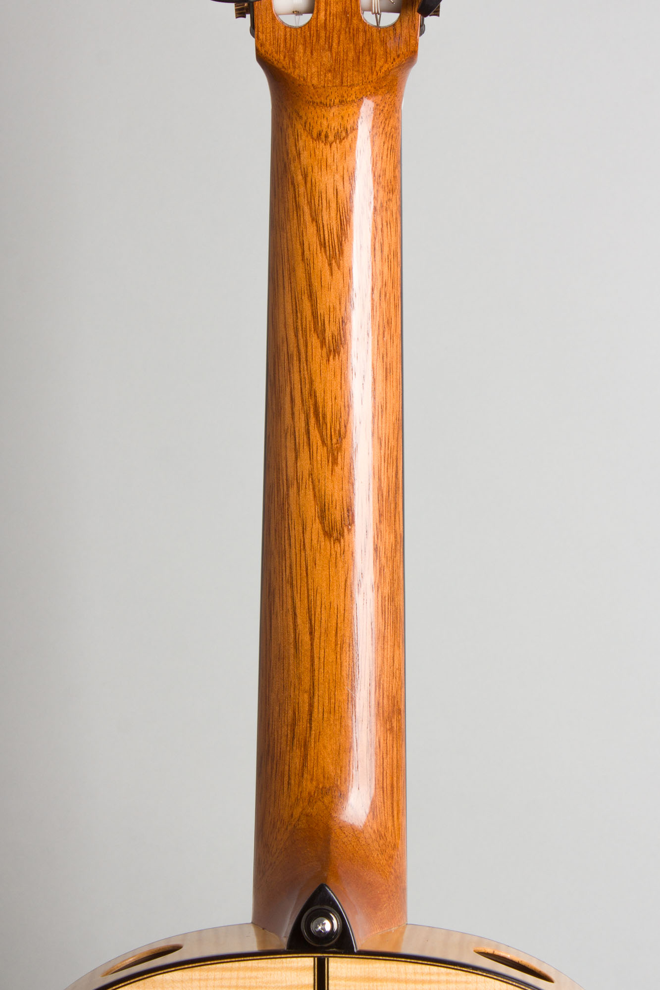 This unusual maple bodied guitar is a one-off design, a very modern instrument in concept combining several late 20th-21st century design elements. The instrument is marked 3/04, completed over 20 years ago in March 2004. It is constructed in the "Millenium" mode with a negative neck angle, as developed by Thomas Humphrey. The very tight grain spruce top braced in the Australian lattice style primarily attributed to Greg Smallman, a very different layout than the traditional fan bracing still used by most makers. Gutmeier spent some time perfecting his take on the lattice bracing; he specifically created this guitar to adapt the basic Smallman lattice-brace system but took it in his own direction, creating a unique piece.