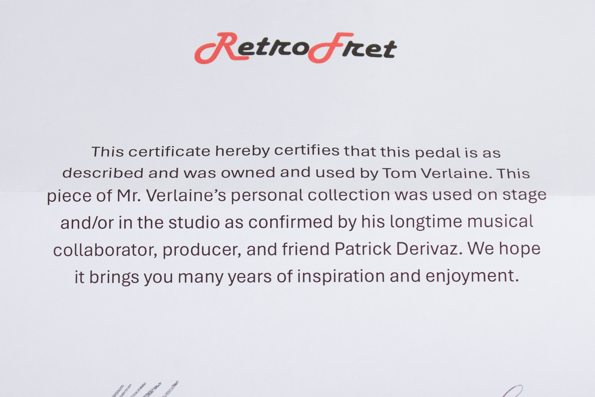 Out of all the pedals we got from the late Mr. Verlaine, this is the mintiest . . . It is in its original packaging after all, seemingly unused. The packaging itself is a little beat up, but the pedal is nearly mint. It is clear that it has been removed and toyed with, and it works perfectly well, but seemed to spend most of its life behind plastic in Verlaine's studio. It with a letter of authenticity signed by Patrick Derivaz, Verlaine's close friend and long time musical collaborator from whom we received the pedal. Overall Excellent + Condition.