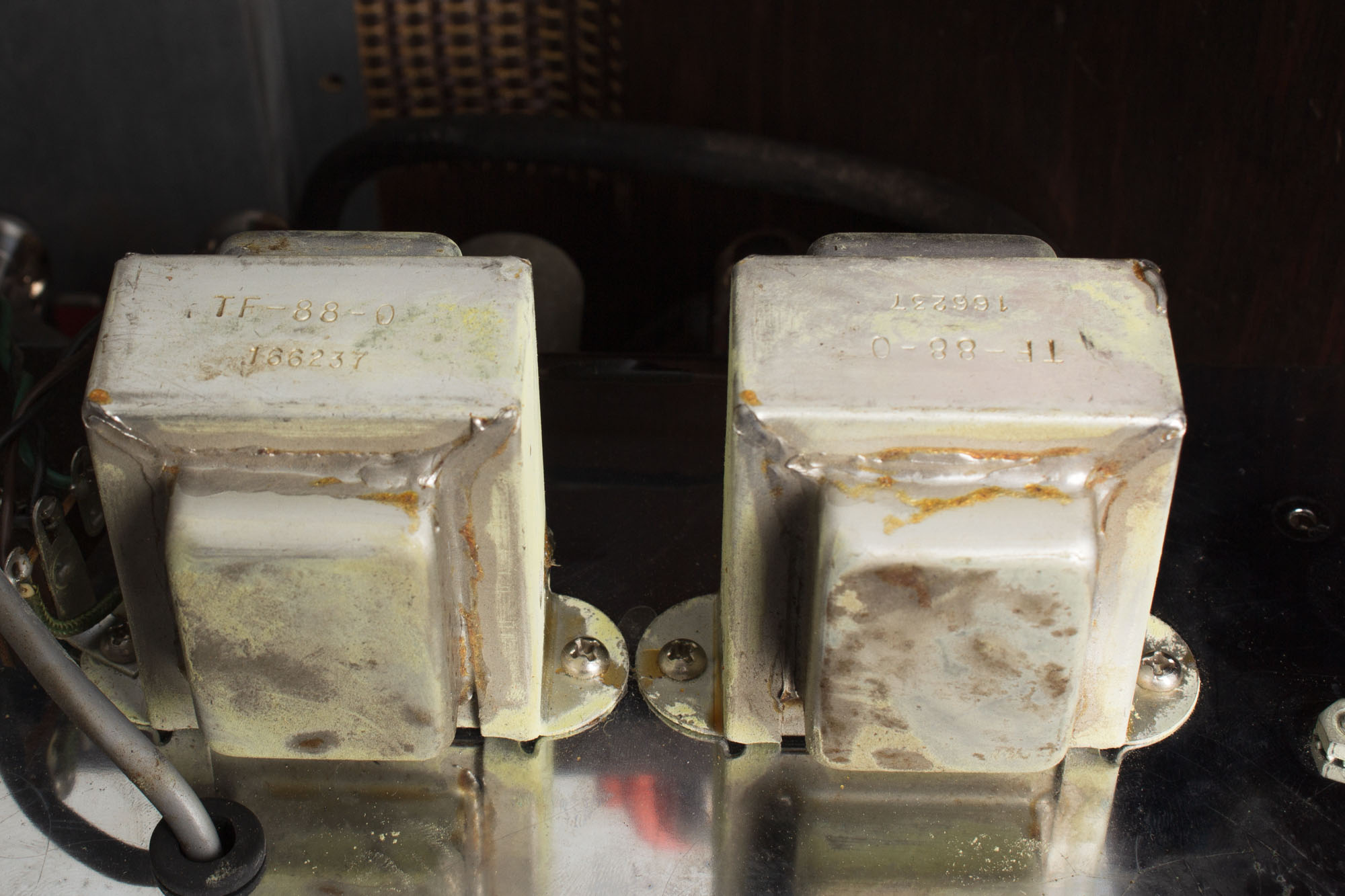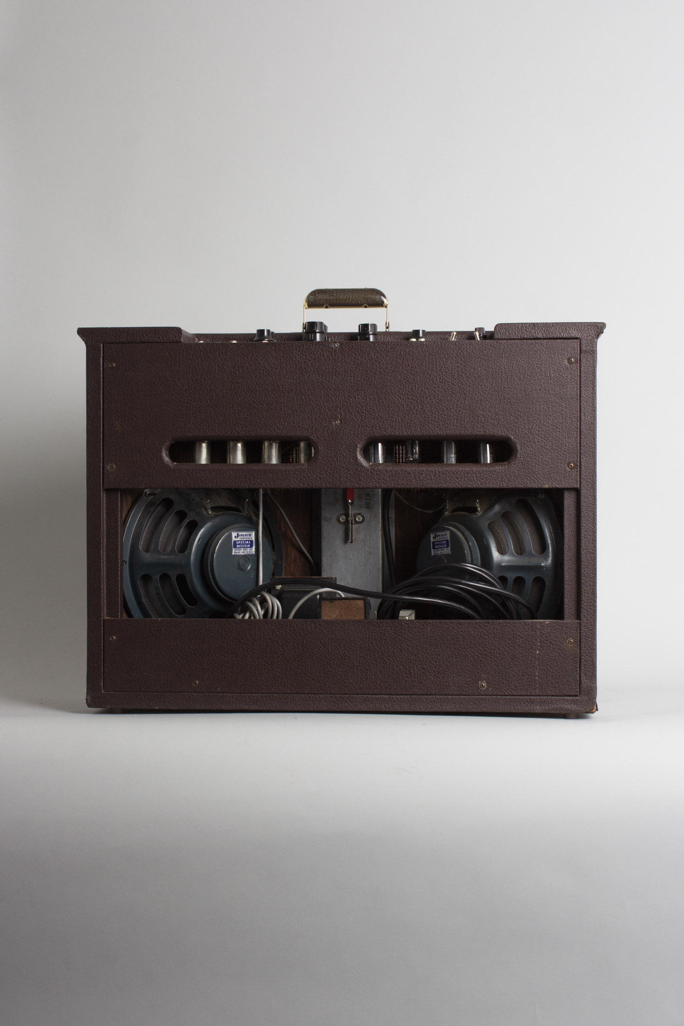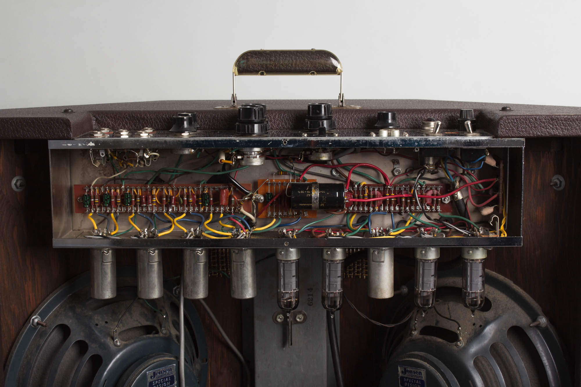 Electrically, the amp is nicely original. The two ceramic 10" Jensen C10Q speakers are both original to the amp and bear the codes 220-210 and 220-205, dating them to the 10th and 5th week of 1962, respectively. Both cones are in fantastic shape and test and sound wonderfully. The original Chicago Electronic Engineering Co.-made power, choke, output and reverb transformers all bear the codes 166-237 and 166-331, dating them to the 37th week of 1962 and the 33rd week of 1963, respectively. The spring cage of the reverb tank has been neatly replaced. Otherwise the amp has seen our typical service and maintenance, including a 3-prong grounded power cord, replacement of all electrolytics, cleaning of all sockets, pots and jacks and output tubes biased to spec.