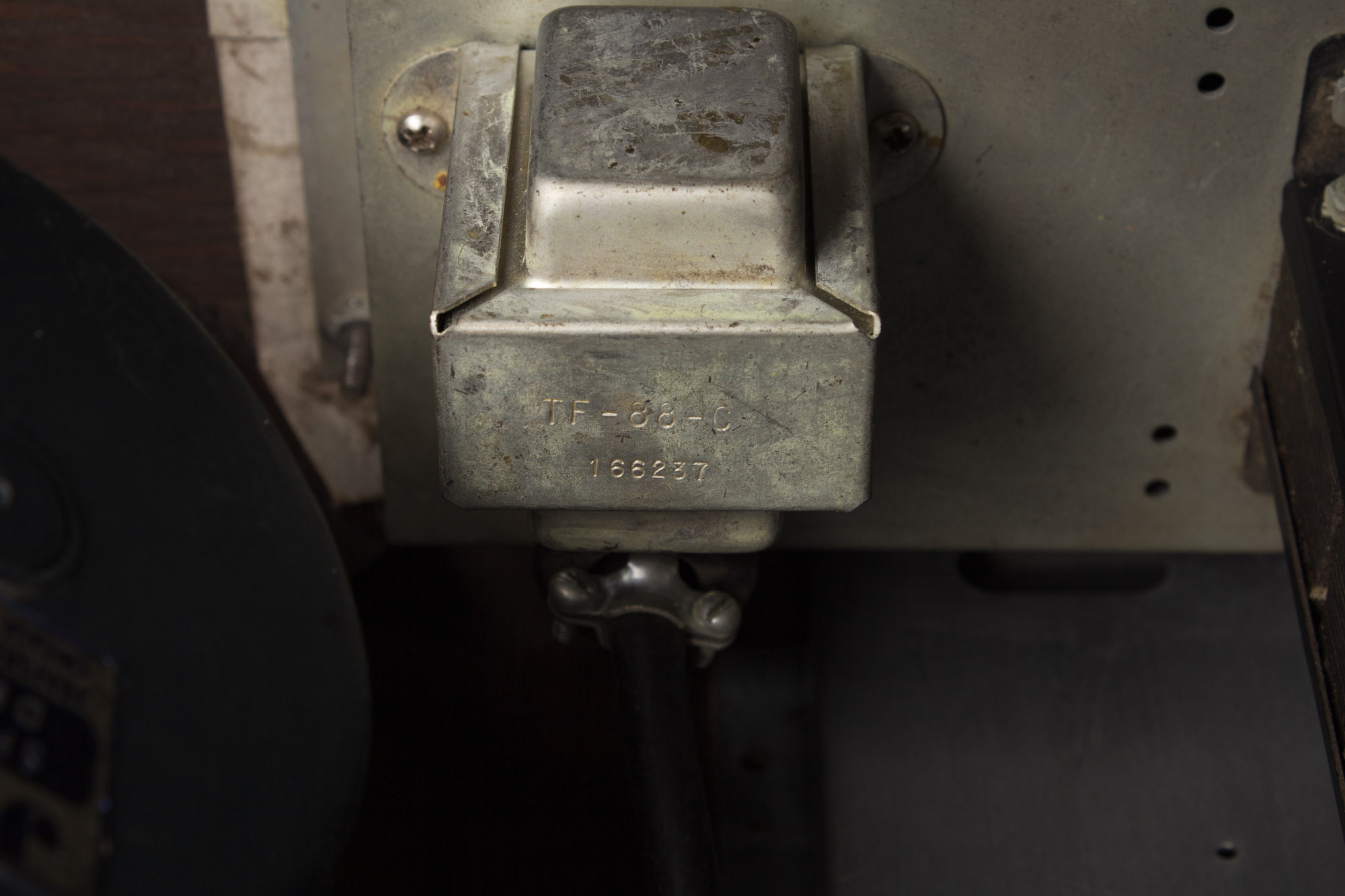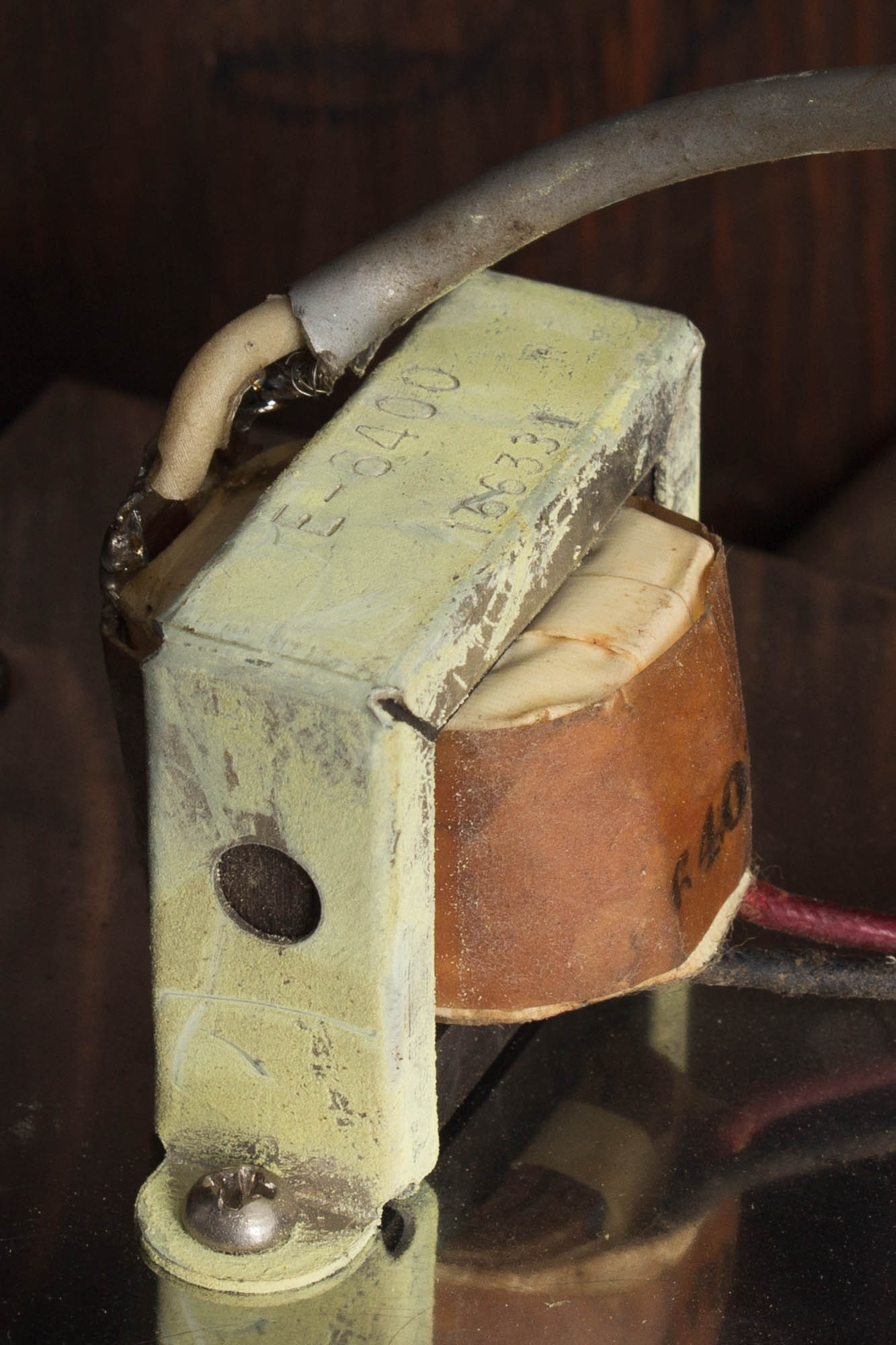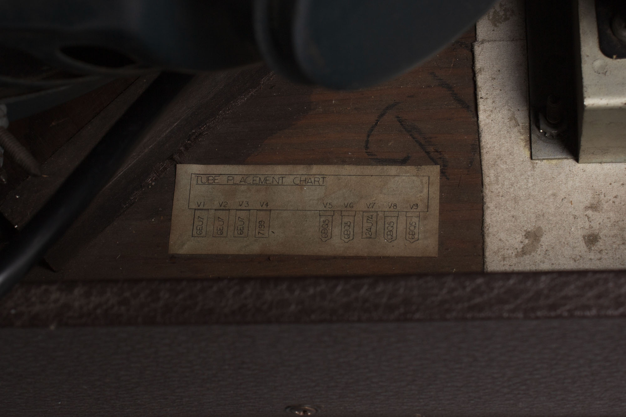 Cosmetically, this GA-79 is in truly wonderful shape for its age. The brown leatherette covering is nicely intact with only occasional signs of wear; a few minor scuffs along lower corners and edges and some staining/discoloration on the top right corner. The control panel is shiny overall, with only minor scratches and a few instances of very small corrosive pitting. Even the stenciled graphics are virtually all intact! The front of the amp still bears its 'Gibson 79 RVT' logo. Both grille cloths are beautifully clean, taut with no notable tearing or fraying. The very sleek acrylic-with-matching-brown-leatherette handle is original as well. The amp otherwise still retains its original tremolo and reverb footswitch.