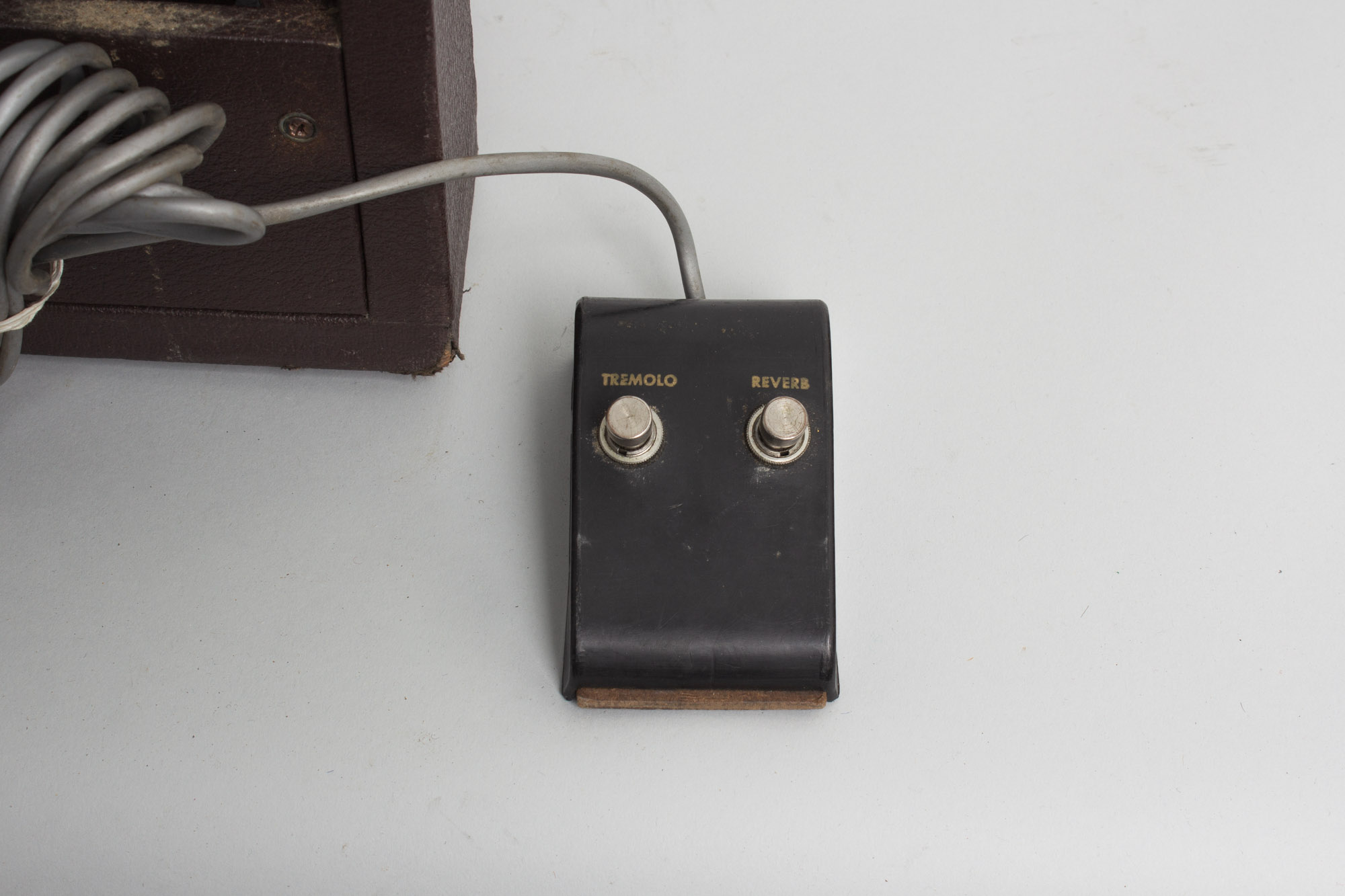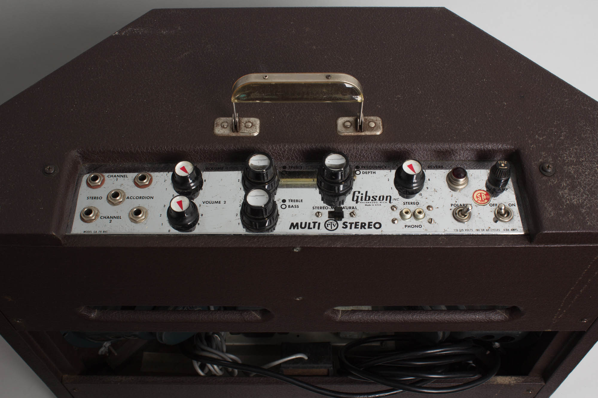 The legend "Multi-Stereo" is printed on the control plate to attest to that, next to an input labeled "stereo-phono". This is a later example from 1963; the initial models, designated GA-79T only had the onboard tremolo effect, and later 'RVT' models included reverb, with a tank just fitted between the two 'V-fronted' speakers.