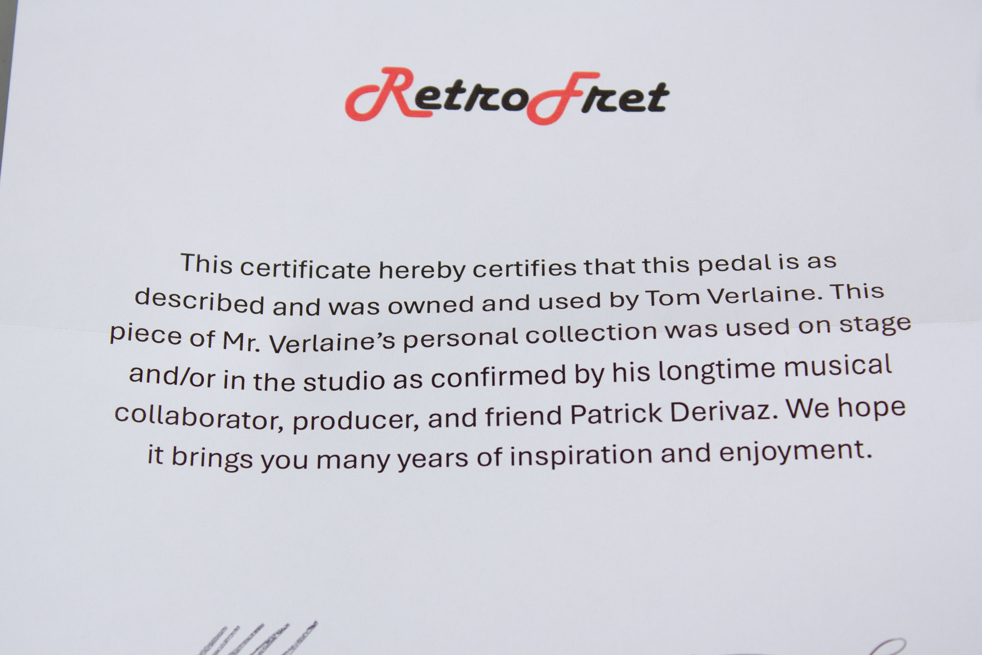 This pedal is in fully functional condition with minimal traces of cosmetic wear from stage and studio use by Mr. Verlaine. The stickers on the back, all four knobs, and the battery compartment are all firmly in tact. It can operate off a either a 9V wall wart power supply or a 9V battery. This pedal resides cozily inside its original box complete with instructions and documents from Digitech both in English and Japanese; also on the exterior of the box and on the back of the pedal are some Japanese price tags from whence it was originally purchased by Tom or otherwise. It also comes with a letter of authenticity signed by Patrick Derivaz, Verlaine's close friend and long time musical collaborator from whom we received the pedal. Excellent + Condition.