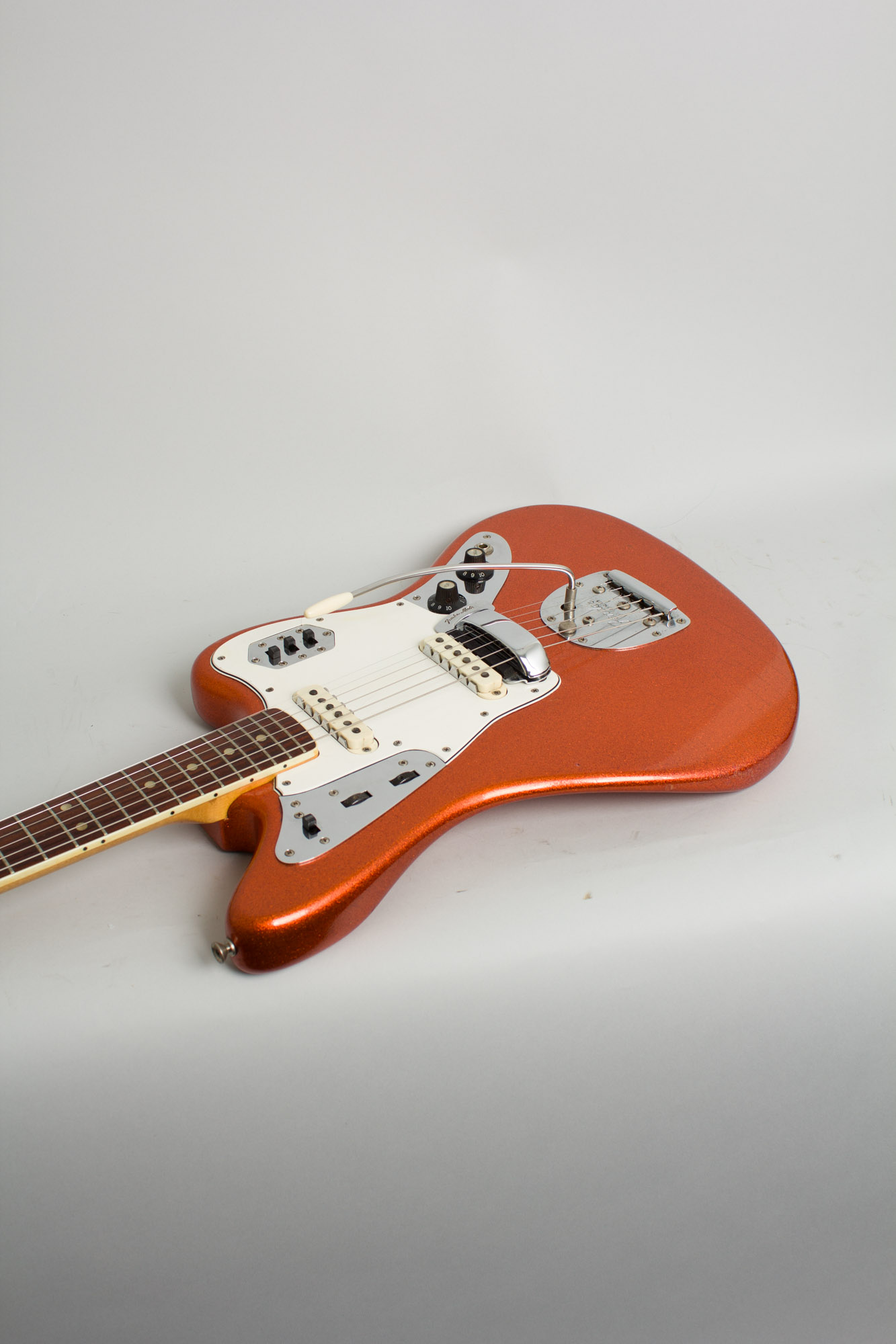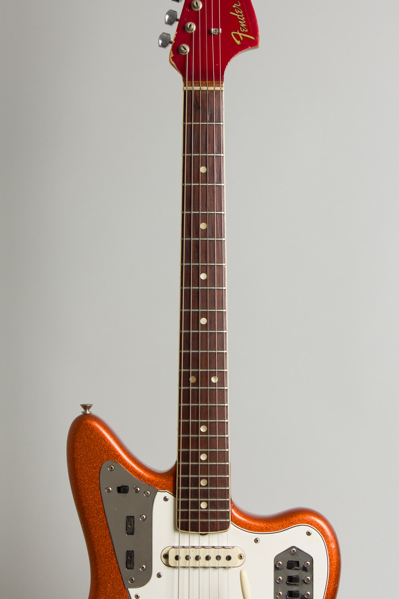 Fender Jaguar Model Solid Body Electric Guitar (1966), made in Fullerton, California, serial # 158769, Orange Sparkle over Candy Apple Red finish, alder body, maple neck with rosewood fingerboard, original black tolex hard shell case.