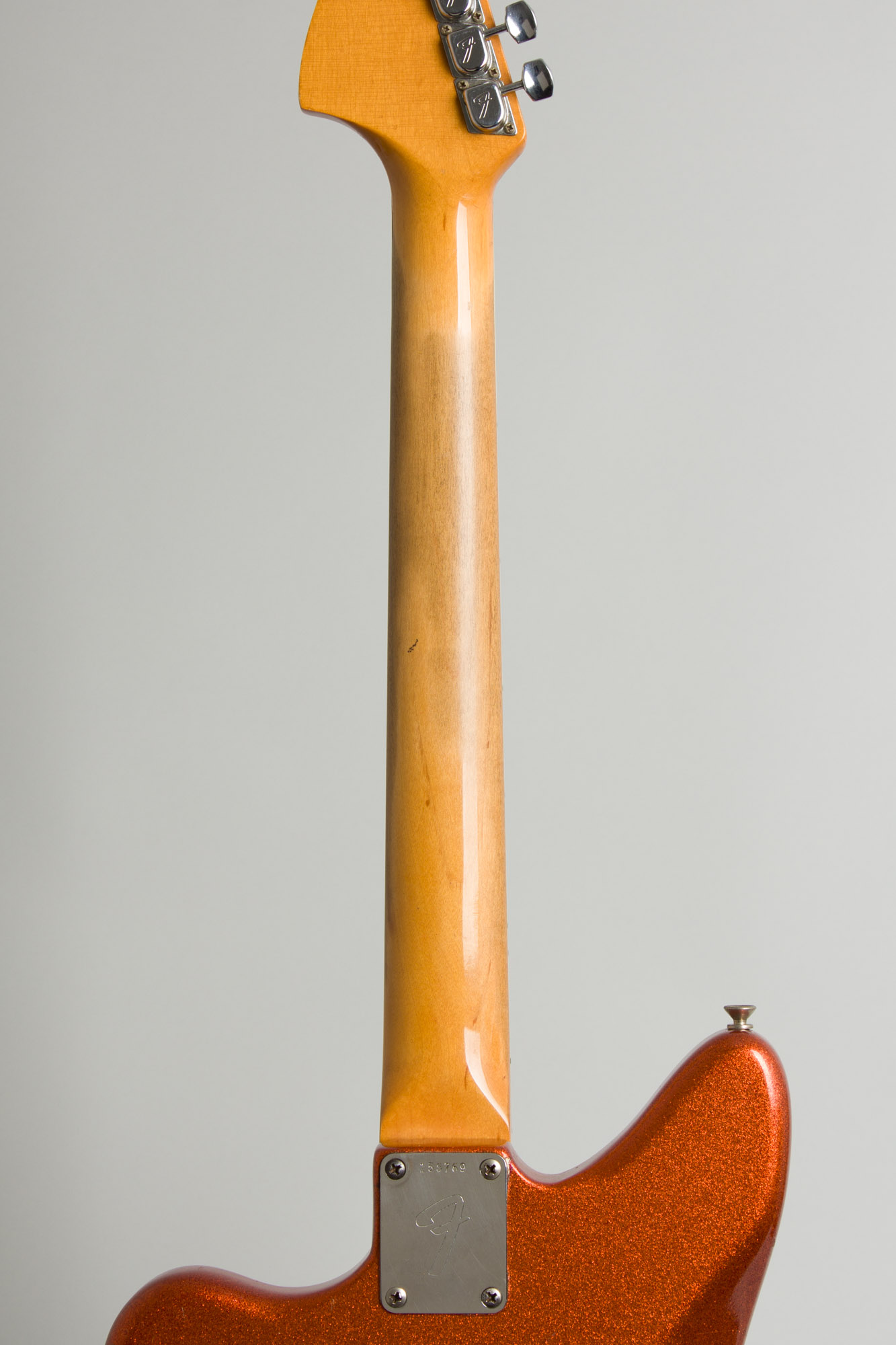 OK, here is a 1960s Hot Rod Weird-Oh, as 1960s California as a custom woodie! This early 1966 Jaguar started life as an already pretty flashy guitar, finished in Candy Apple Red with a matching headstock. Early on (possibly immediately) the body was overfinished in a super striking Tangerine Sparkle metallic finish making for a very unique look! Fender DID fulfill customer orders for this type of finish on a very limited basis; this one is definitely period BUT we cannot verify it as a Fender-ordered job, so it is not priced in the $50K+ range as one of those would be!
