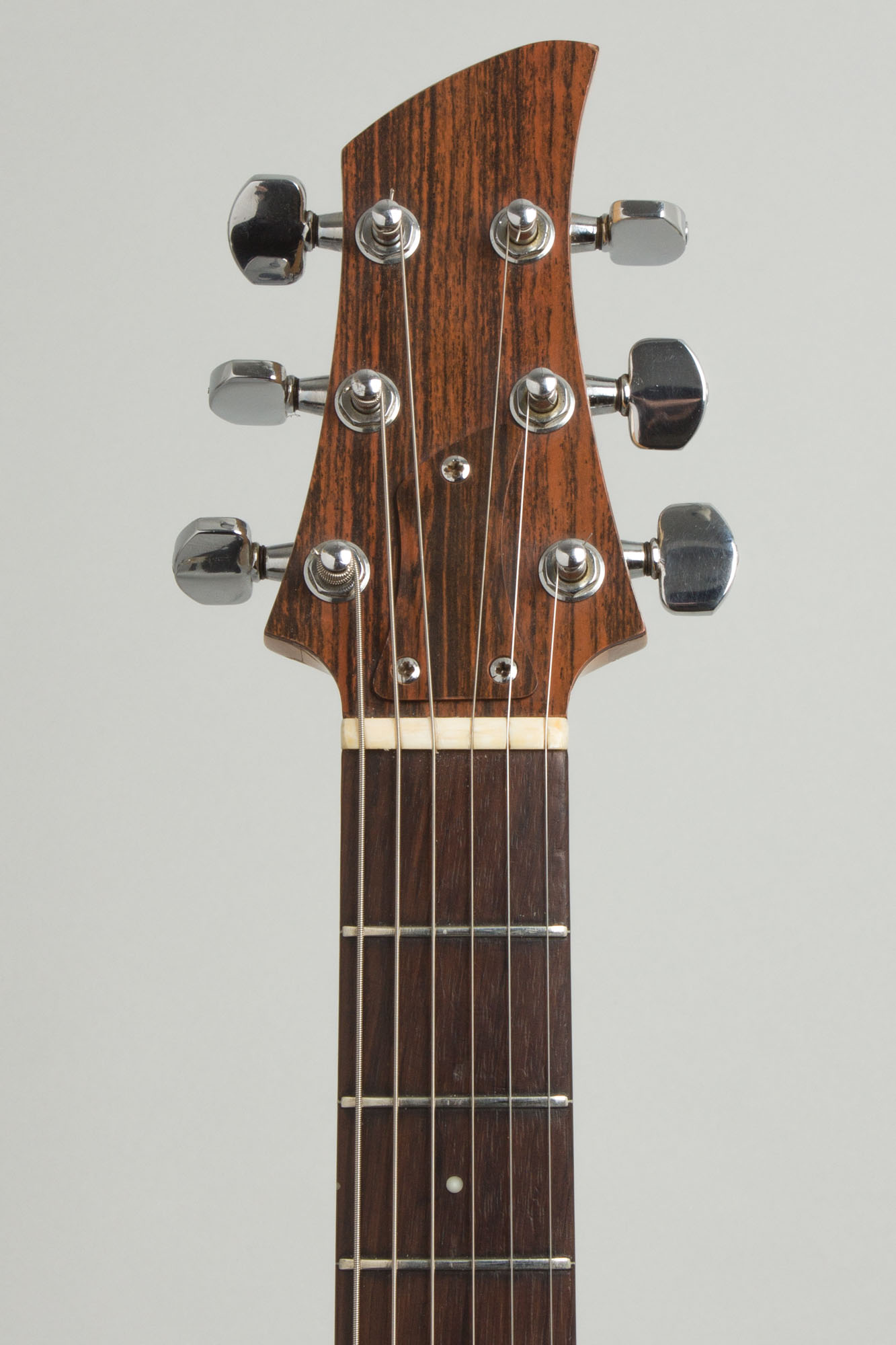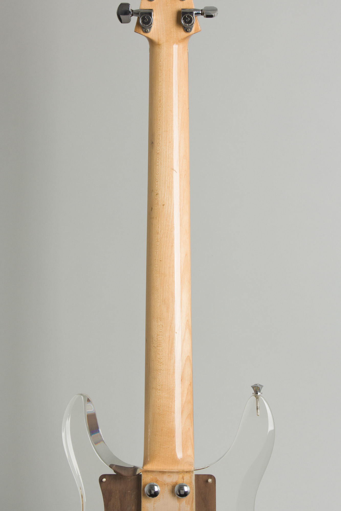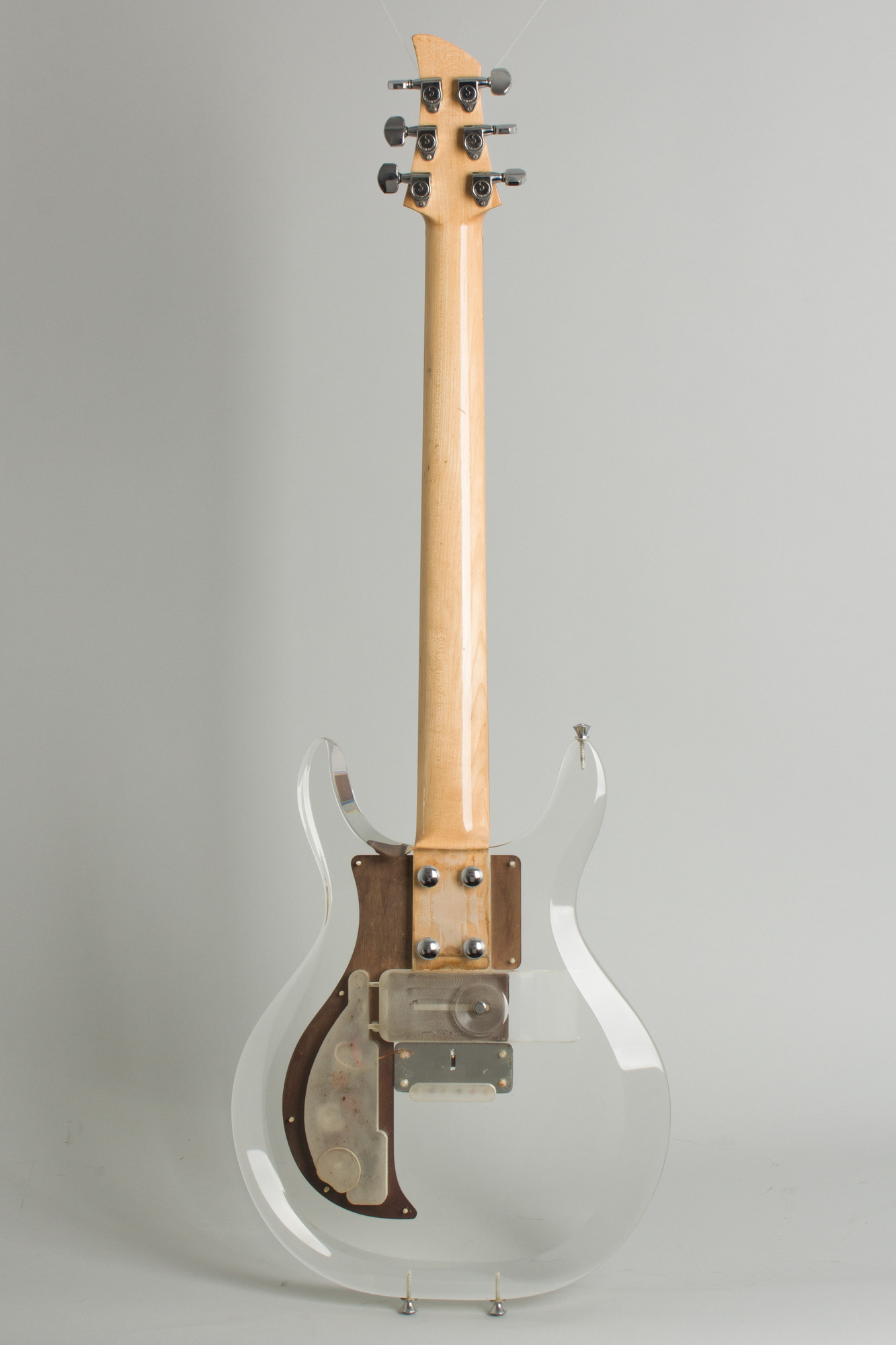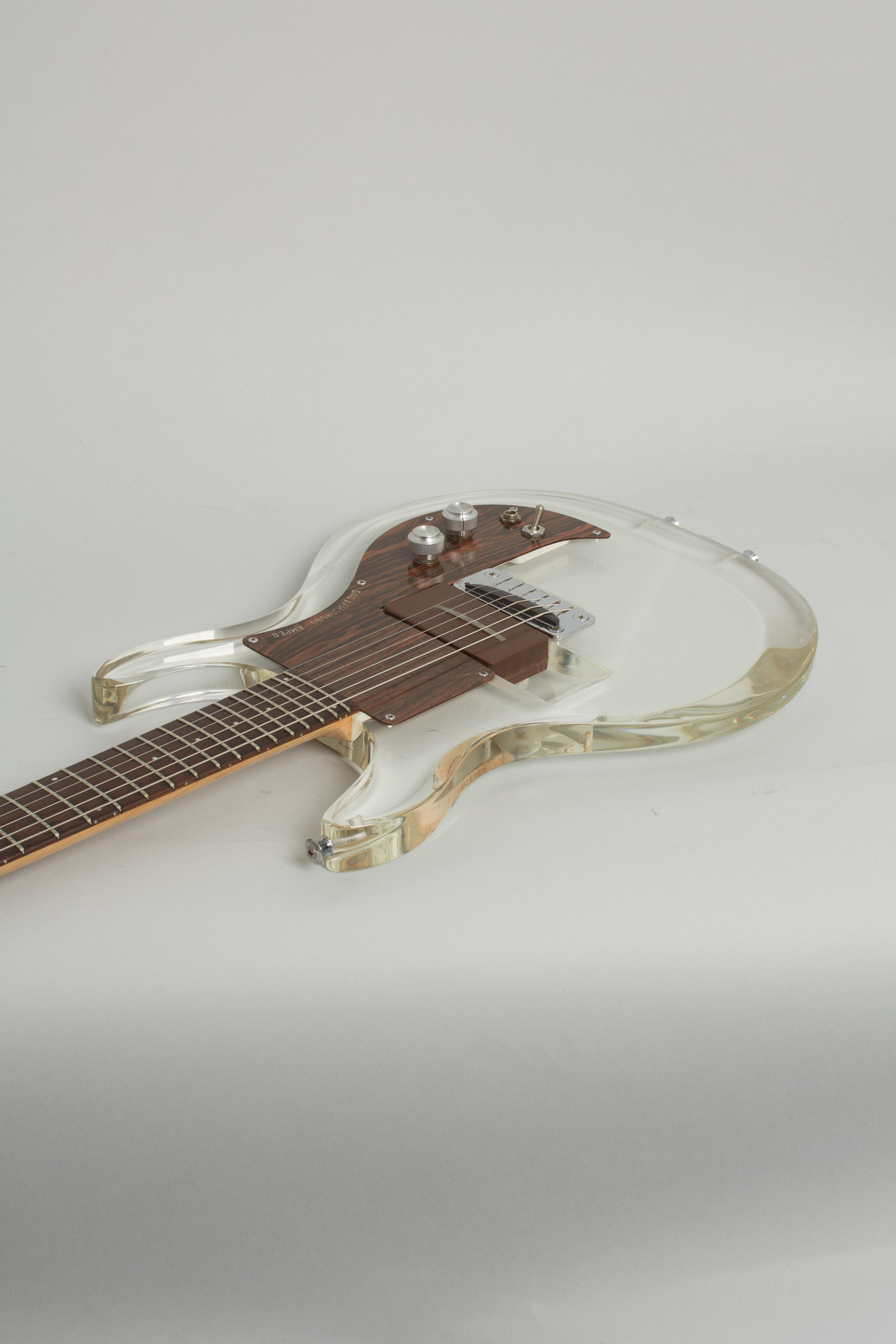 The most radical element (the body) is cut from a block of transparent Lucite. The deep double cutaway offers access to all 24 frets, inspired by the Danelectro Longhorn. The edges were contoured to reduce weight and make it comfortable to play. The design has other kinship with Danelectros. The chrome bridgeplate was similar, but bolted solidly to the body with a similar one-piece rosewood saddle. A whimsical touch is a wood-grained Formica pickguard and headstock facing -- a visual pun on a plastic guitar!