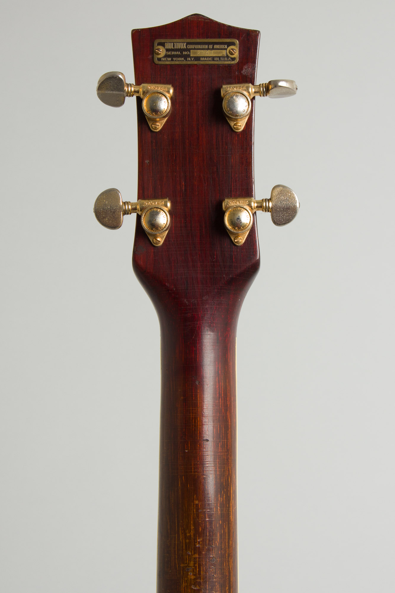 Although touted in the catalog with "Here at long last, a quality electric bass at low cost" these were not particularly cheap. This Model E741 with gold-plated hardware and the "Ruby Special" Cherry mahogany finish listed originally at $179.50 plus $37.50 for the hardshell case. This one was made in late 1959 or early 1960; the pots have stamped codes dating them to the 43rd week of 1959.