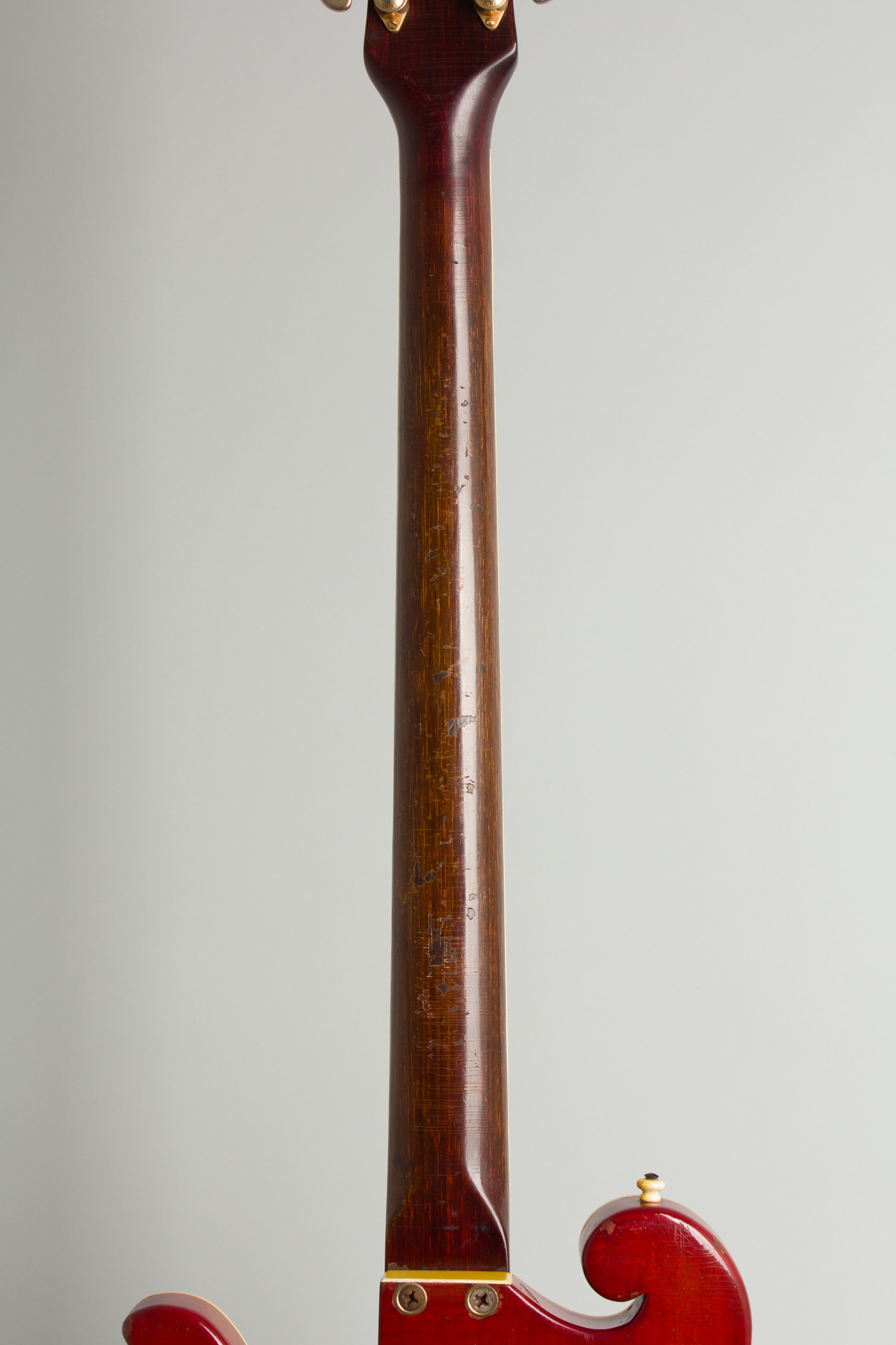 Premier scroll instruments were cataloged into the mid-'60s, but later examples were assembled with different necks and imported parts having neither the quality or class of the first models. Mark Sandman of Morphine famously played a battered example of these, while the only known player of an original early model we can spot was Chris Darrow alongside David Lindley in the legendary psychedelic band Kaleidoscope. This unique and striking bass is certainly a special piece; it feels a bit like "A Beacon from Mars" to quote their greatest LP title!