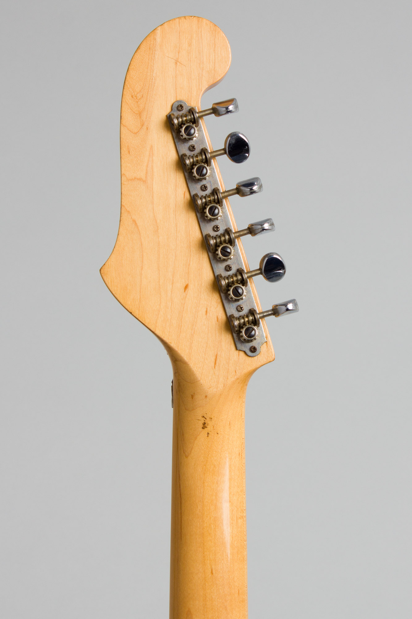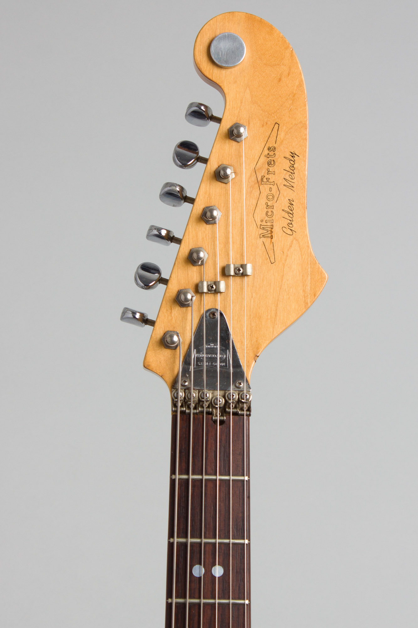 Micro-Frets was launched in 1967, by the following year the small factory was producing a fairly extensive line of utterly unique semi-solid electric guitars. Collectors have identified three major stages in their evolution from the earliest models through the company's demise in 1975, dubbed type 1, 2 and 3 depending on the construction and fittings. This instrument is a "Type 1-B" Golden Melody, a semi-hollow body guitar with a two-piece maple sandwich body routed from the inside, with both halves clipped together but without the "Tempered Masonite" center gasket used on the earliest models. Micro-Frets serial numbers appear to start at either 1000 or 1100; in either case at #1411 this is a fairly early model, somewhat rarer than later pattern guitars.