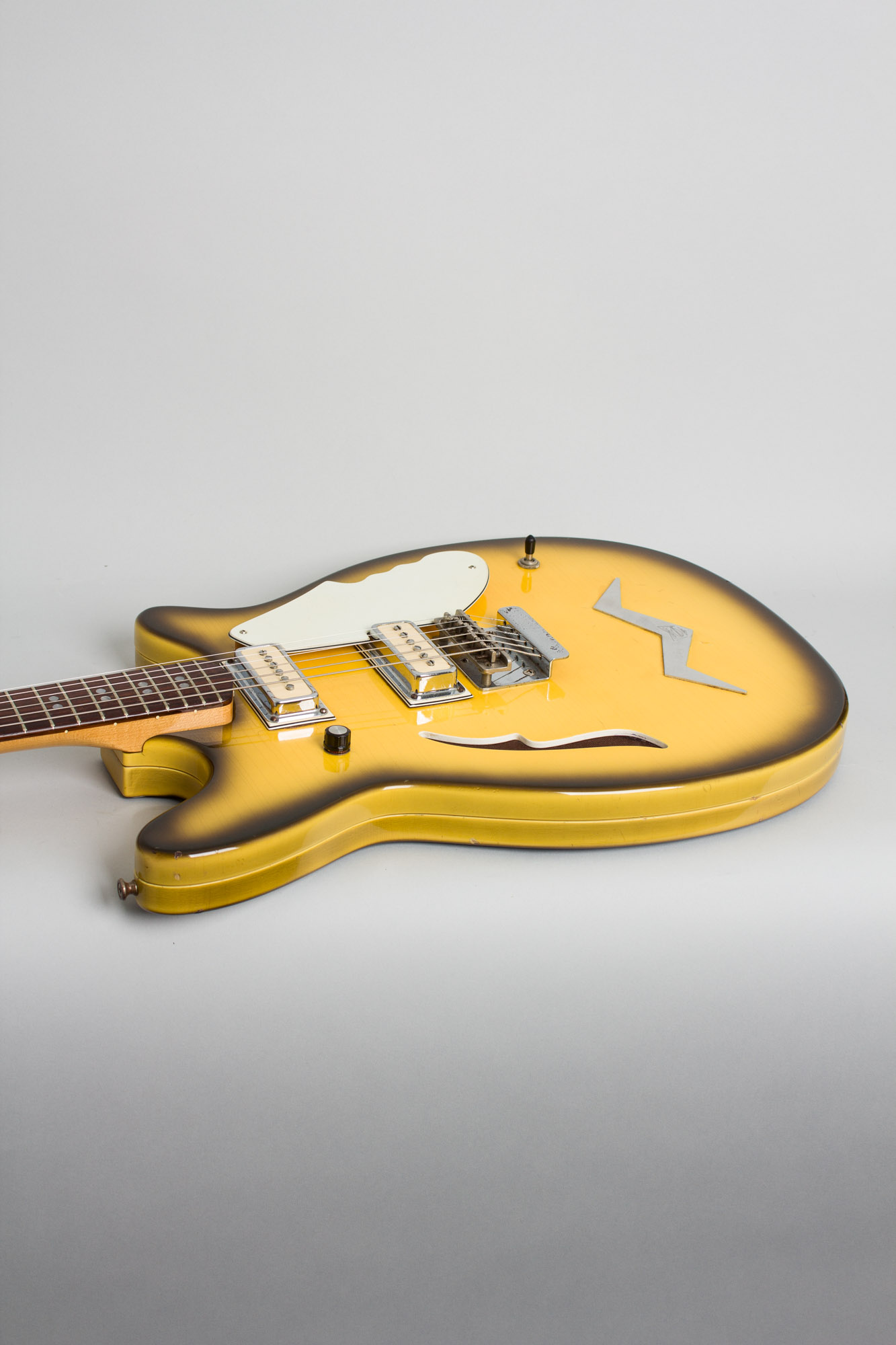 Micro-Frets Golden Melody Model Semi-Hollow Body Electric Guitar (1969), made in Fredrick, Maryland, serial # 1411, Black-Yellow sunburst finish, maple body, maple neck with rosewood fingerboard, original black tolex hard shell case.