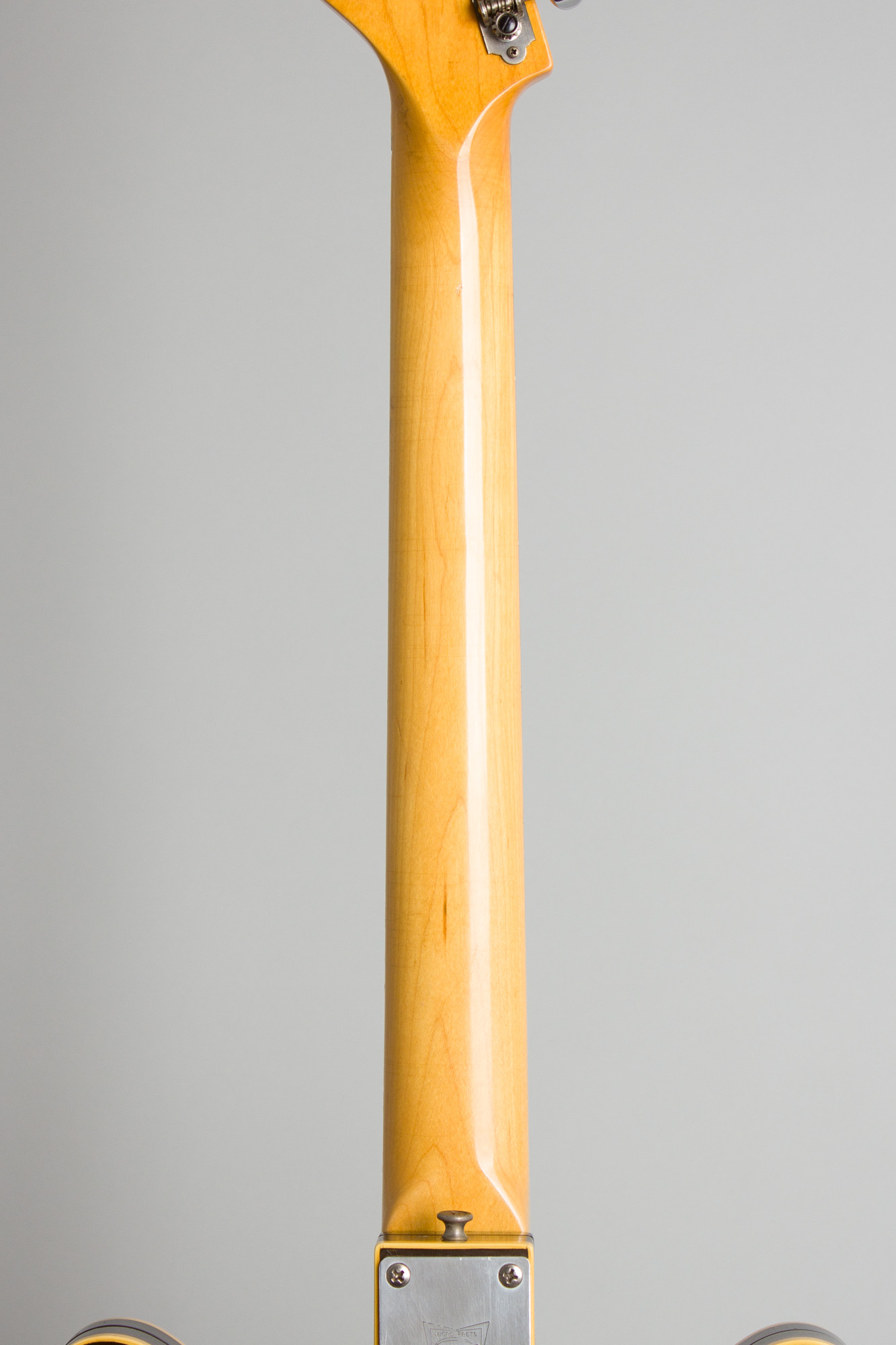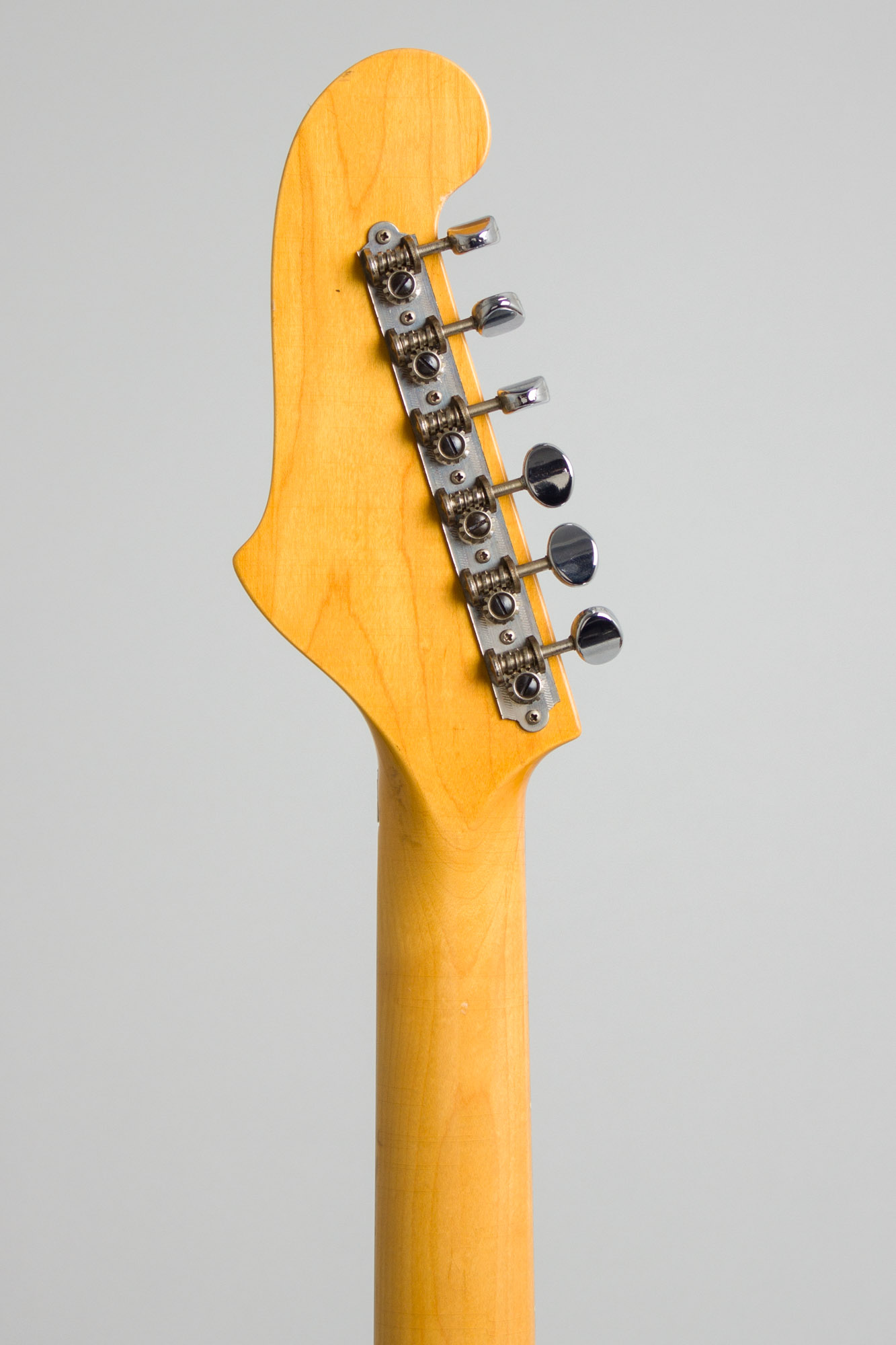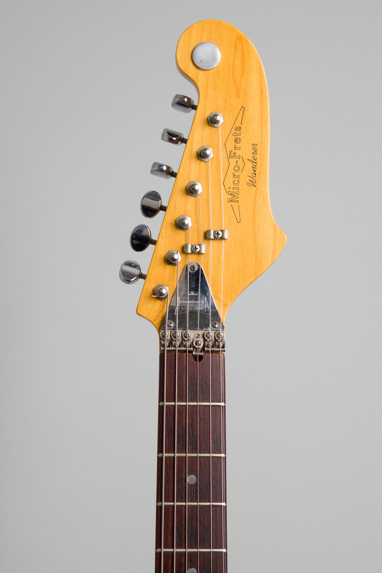 Micro-Frets was launched in 1967, by the following year the small factory was producing a fairly extensive line of utterly unique semi-solid electric guitars. Collectors have identified three major stages in their evolution from the earliest models through the company's demise in 1975, dubbed type 1, 2 and 3 depending on the construction and fittings. This instrument is a "Type 1-B" Wanderer, a semi-hollow body guitar with a two-piece maple sandwich body routed from the inside, with both halves clipped together but without the "Tempered Masonite" center gasket used on the earliest models. Micro-Frets serial numbers appear to start at either 1000 or 1100; in either case at #1560 this is a fairly early model, somewhat rarer than later pattern guitars.