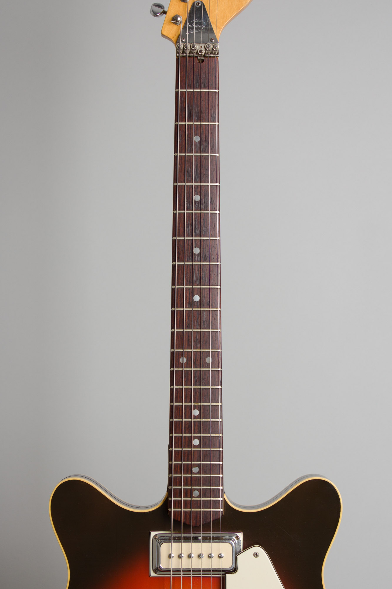 The maple body is finished in a sort of Fender-y three-color sunburst. The spray work on this guitar is neater than some Micro-frets we have had, with very vibrant look to the 'burst. The two interlocking maple body halves are bound at the edges with a single stylized F-hole filled in with fabric. Two tone and a master volume for the twin pickups are carried laterally on the top-mounted pickguard, which is bi-level in the Rickenbacker mode with a triple laminate upper section; earlier "Style 1 " models had 4 of these rotary knobs. A selector switch is mounted to the body behind this. The pickups themselves are DeArmond single-coil units with adjustable poles; the next year Jones would perfect his own pickups with help from Bill Lawrence.