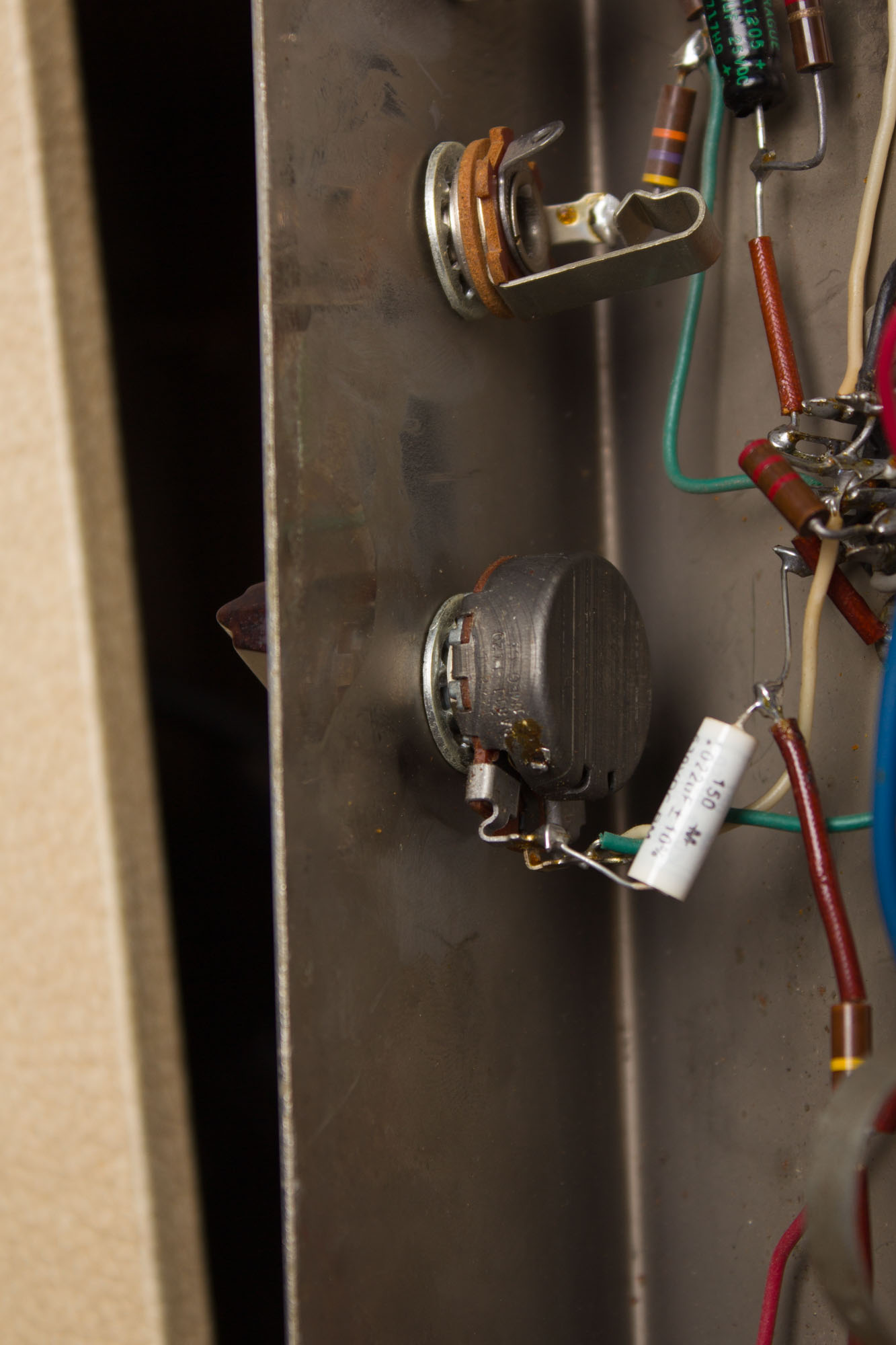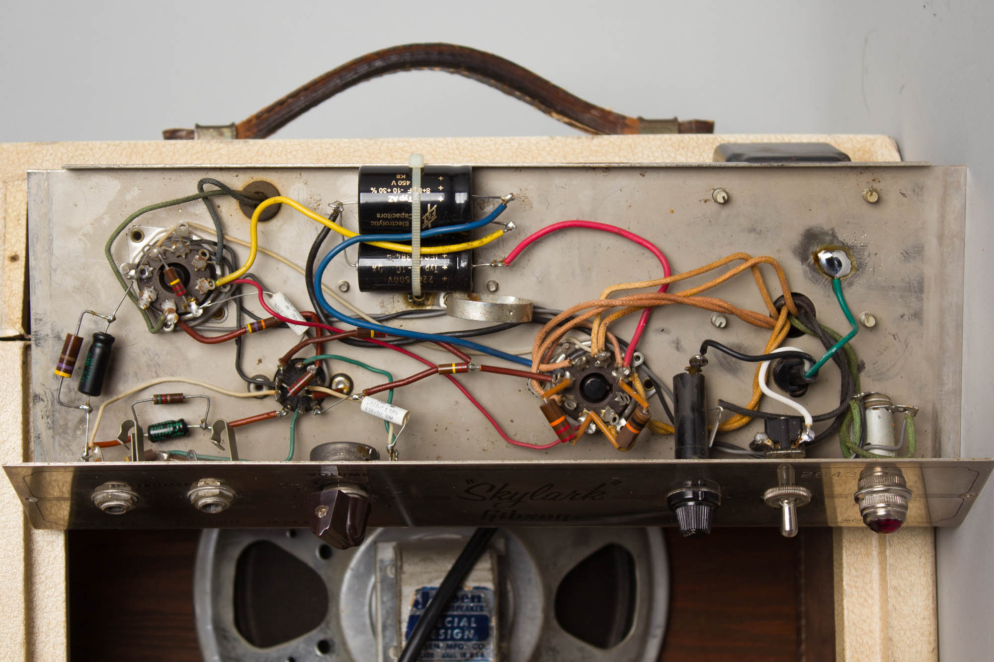 Like the Fender Champ, the Skylark sports a single volume control and two instrument inputs, though, unlike that competitor it is provided with the luxury of a wholly separate power switch! The tubes are the expected compliment of a 12AX7, a single 6V6 and a 5Y3, in this case all Gibson-branded RCA made.