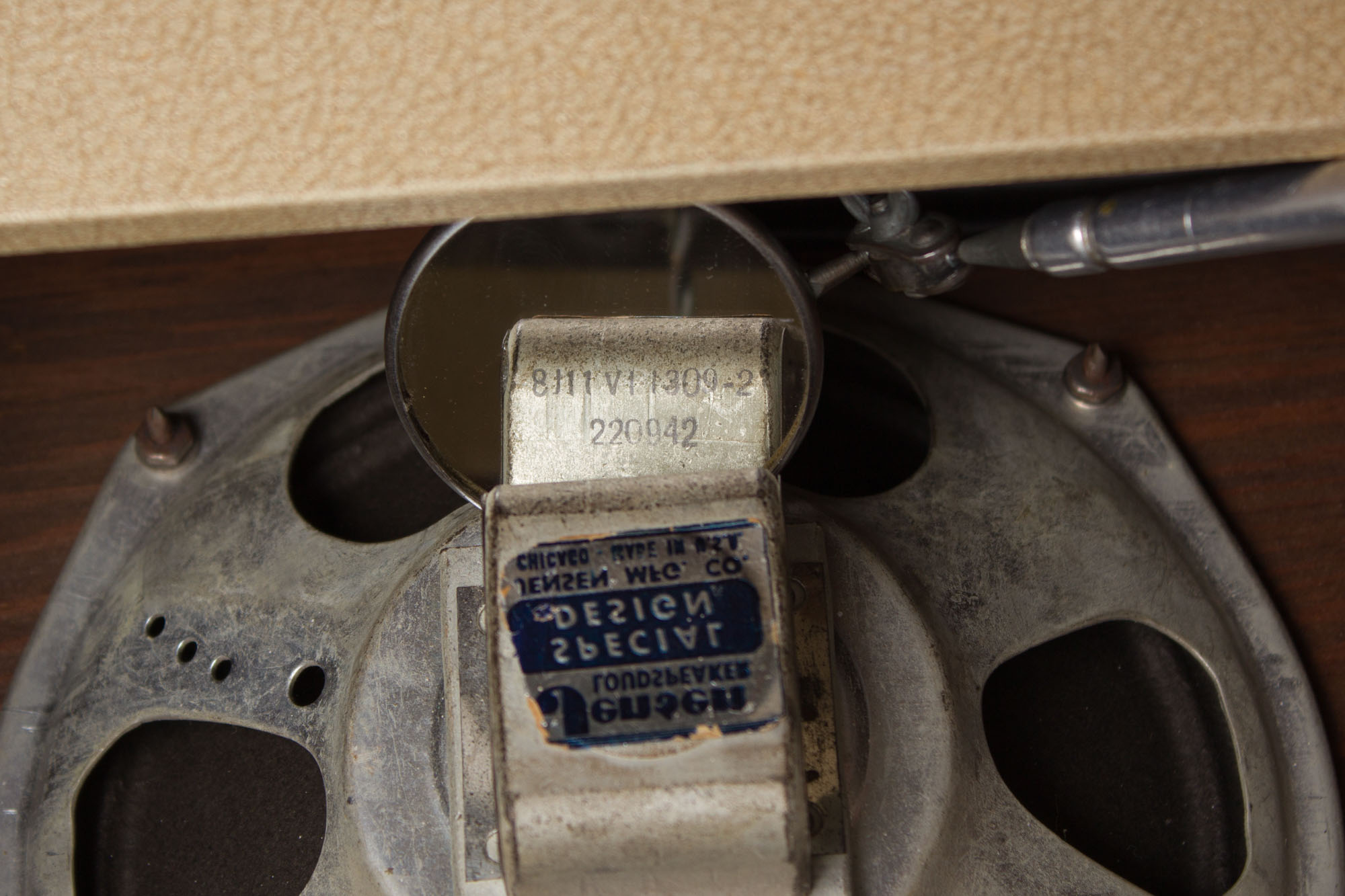 Electrically, the amp is nicely original. The original 8" Jensen speaker bears the code 220-942, dating it to the 42nd week of 1959. Both the power and output transformers are original to the amp, marked 996-607 and 549-6005, dating them to the 7th and 5th week of 1960, respectively. The amp has otherwise received our standard maintenance and servicing, including replacement of all electrolytic capacitors, a 3-prong grounded power cord as well as all jacks, sockets and pots cleaned and output tubes biased to spec.