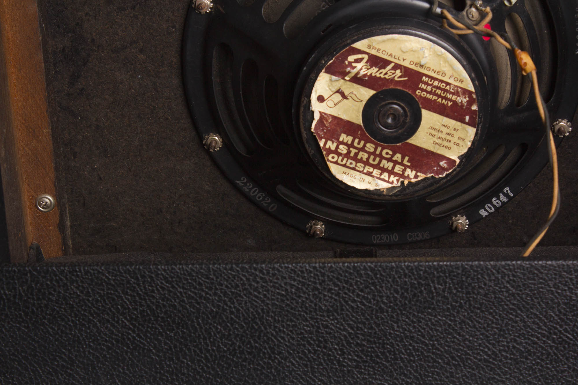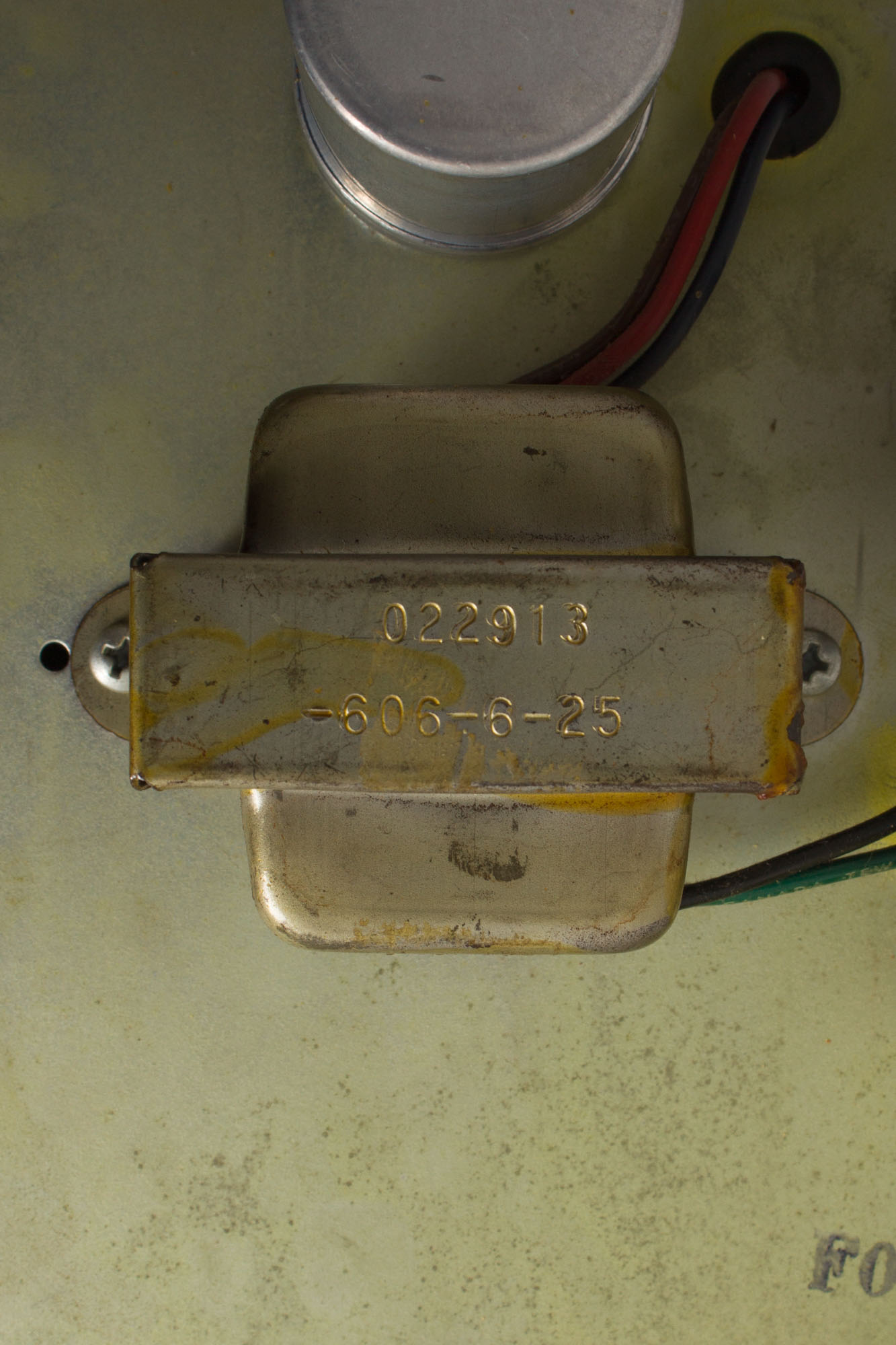 Internally this amp is nicely original. The original 10" ceramic Jensen C10R speaker bears the code 220-620, dating it to the 20th week of 1966. The power, output and reverb transformers are all original and marked 606-614, 606-625 and 606-431, dating them to the 14th, 25th weeks of 1966 and 31st week of 1964, respectively, the latter reverb transformer most likely being a period replacement. Visible pot codes all date to '66 as well. The amp has seen our typical servicing and maintenance, including replacement of all electrolytic capacitors, install of a 3-prong grounded power cord, cleaning of all sockets, pots and jacks and biased to spec.