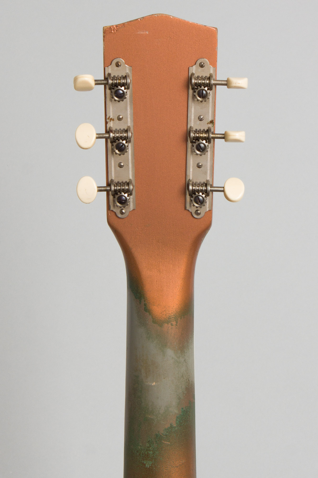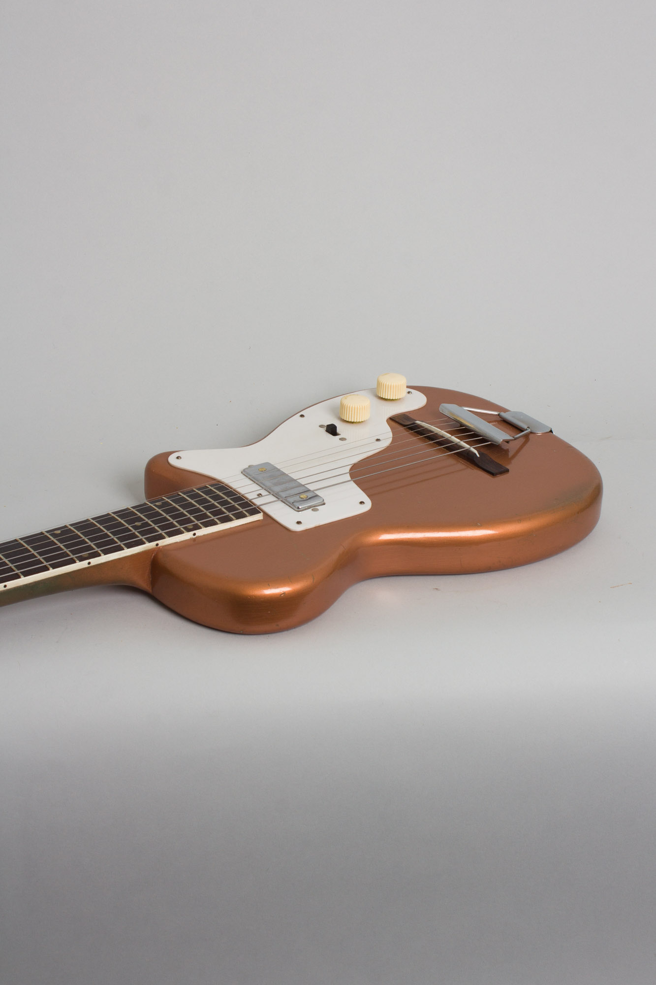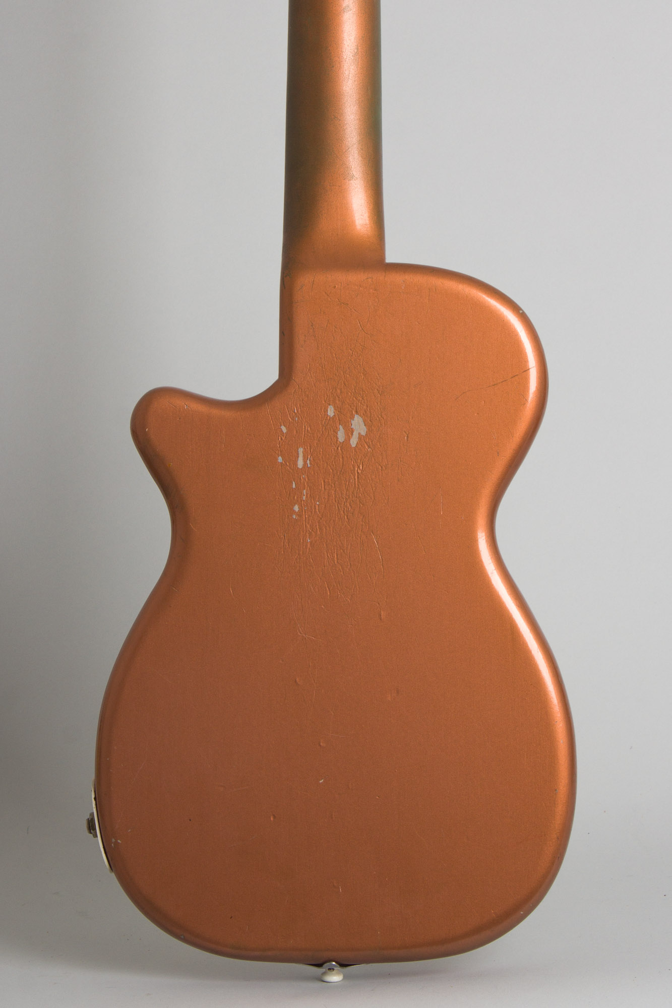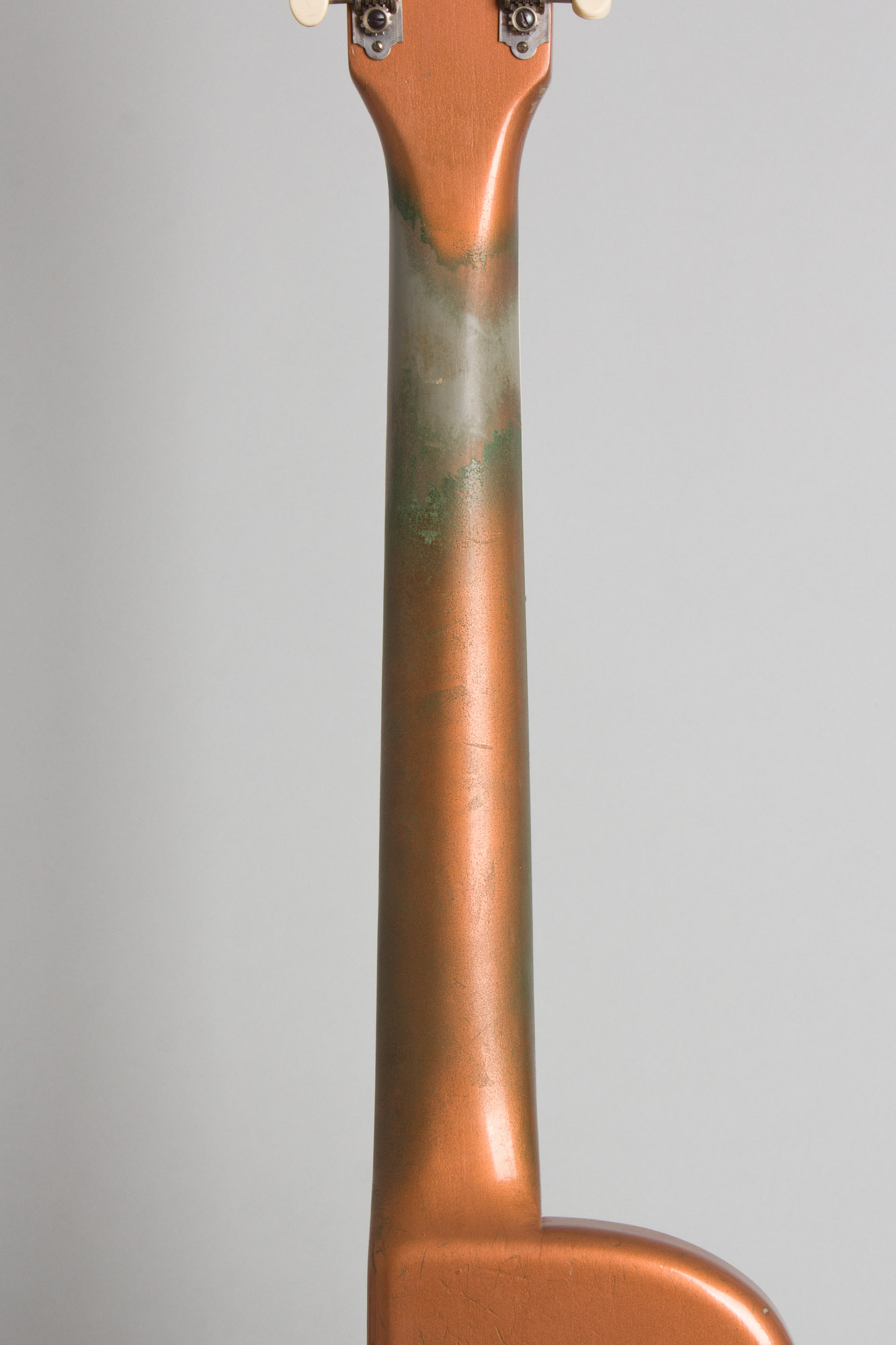 The copper metallic lacquer finish is better preserved than many examples, and does not appear to have faded too much. Overall it shows light play wear with dings, chips, and scrapes, most notably to a section of the back. The back of the neck has a section down to the undercoat in the lower positions and discoloration along most of its length, typical of these as the metallic overcoat usually wears quickly from contact with the hand. A few areas on edges of the body are lightly discolored a bit from arm contact, but not worn through to the primer.