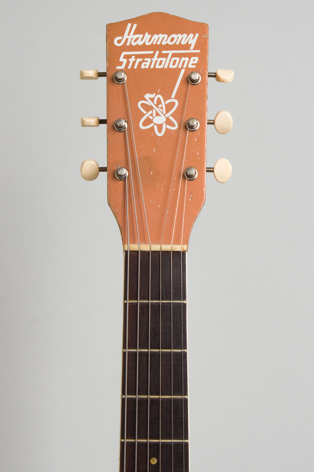 Harmony H-44 Stratotone Model Solid Body Electric Guitar (1956), made in Chicago, copper lacquer finish, hardwood body and neck, rosewood fingerboard, original tan chipboard case.
