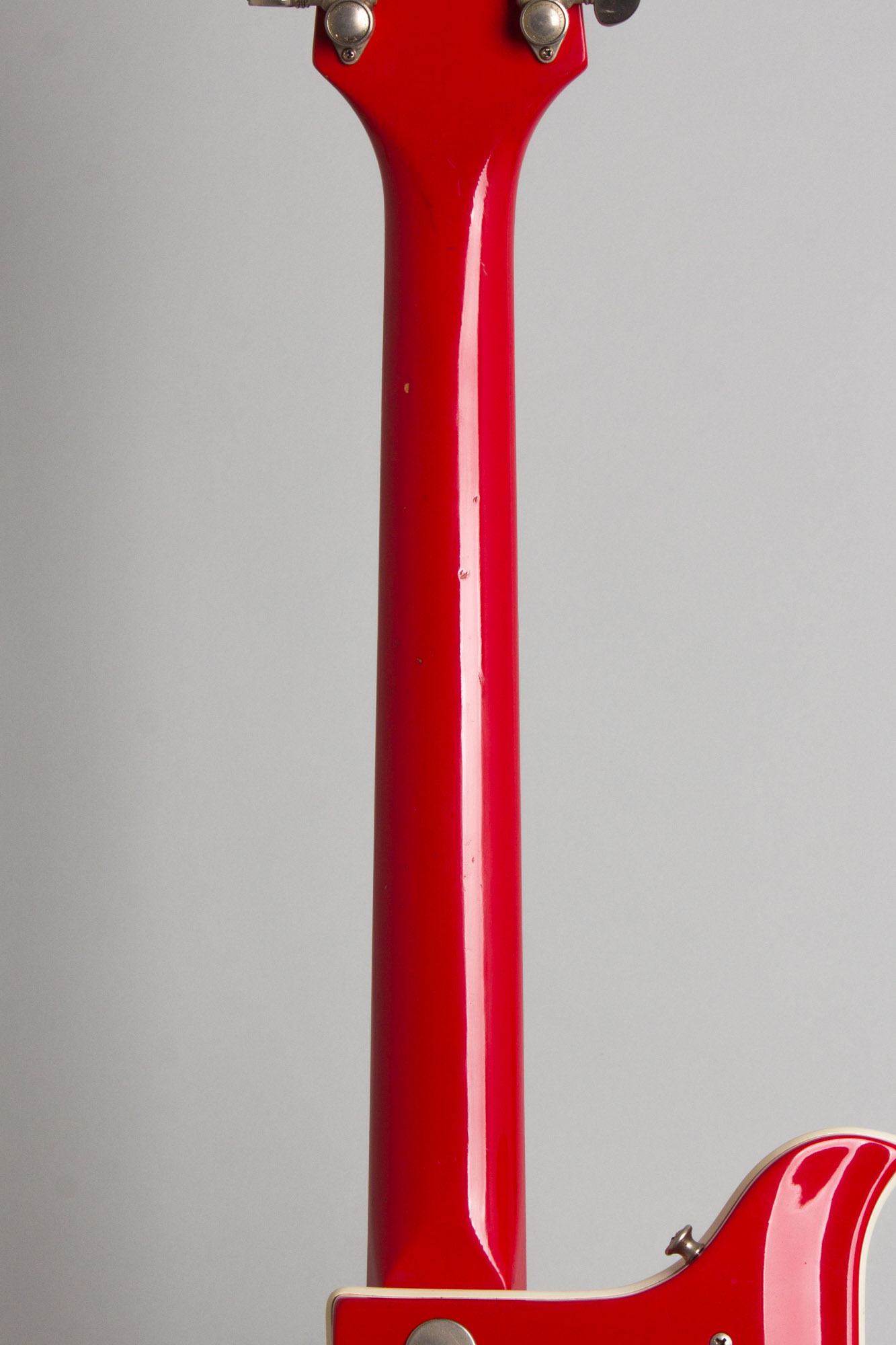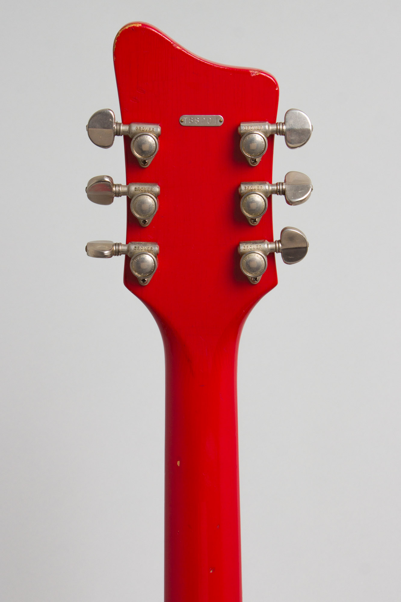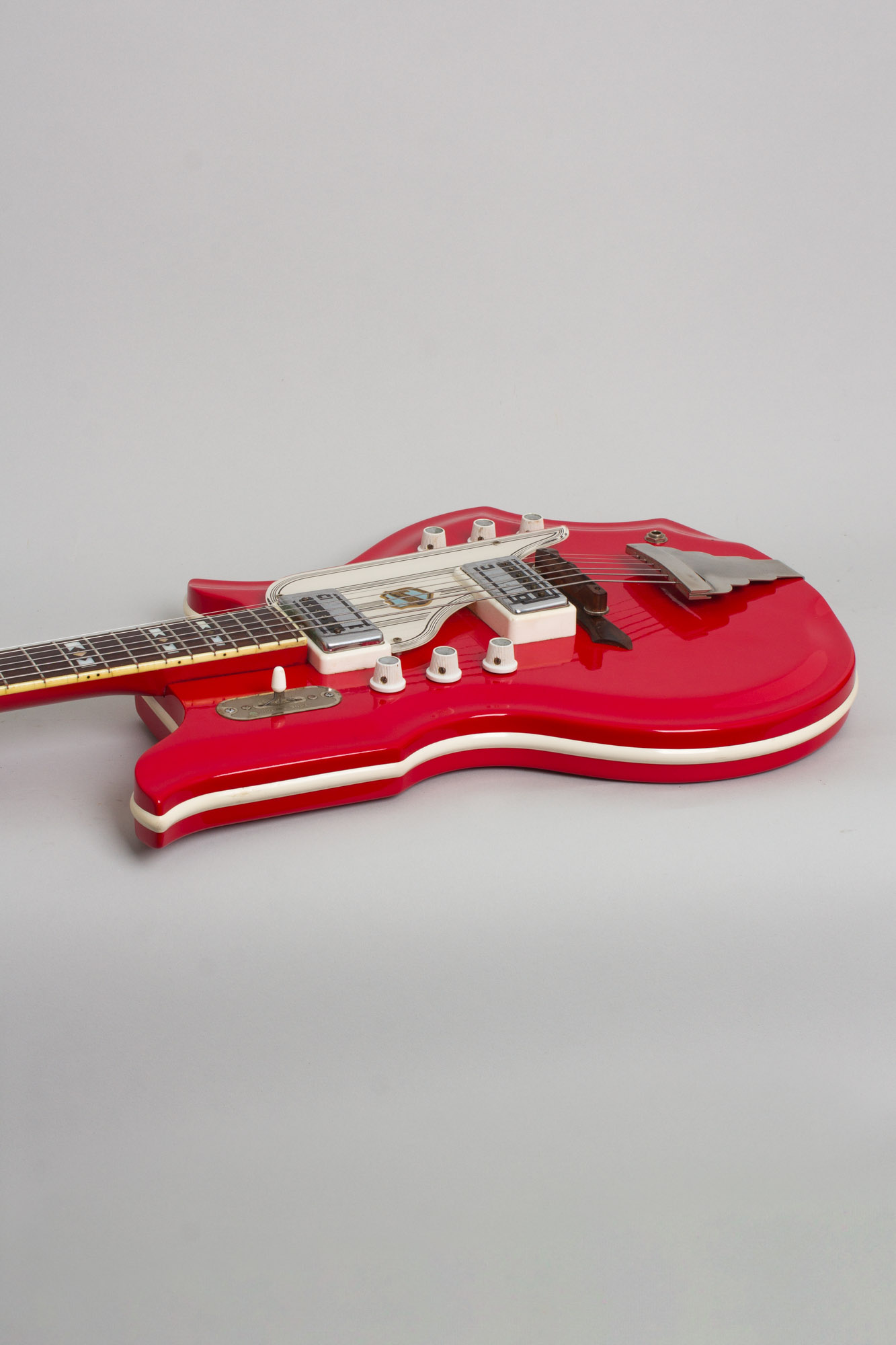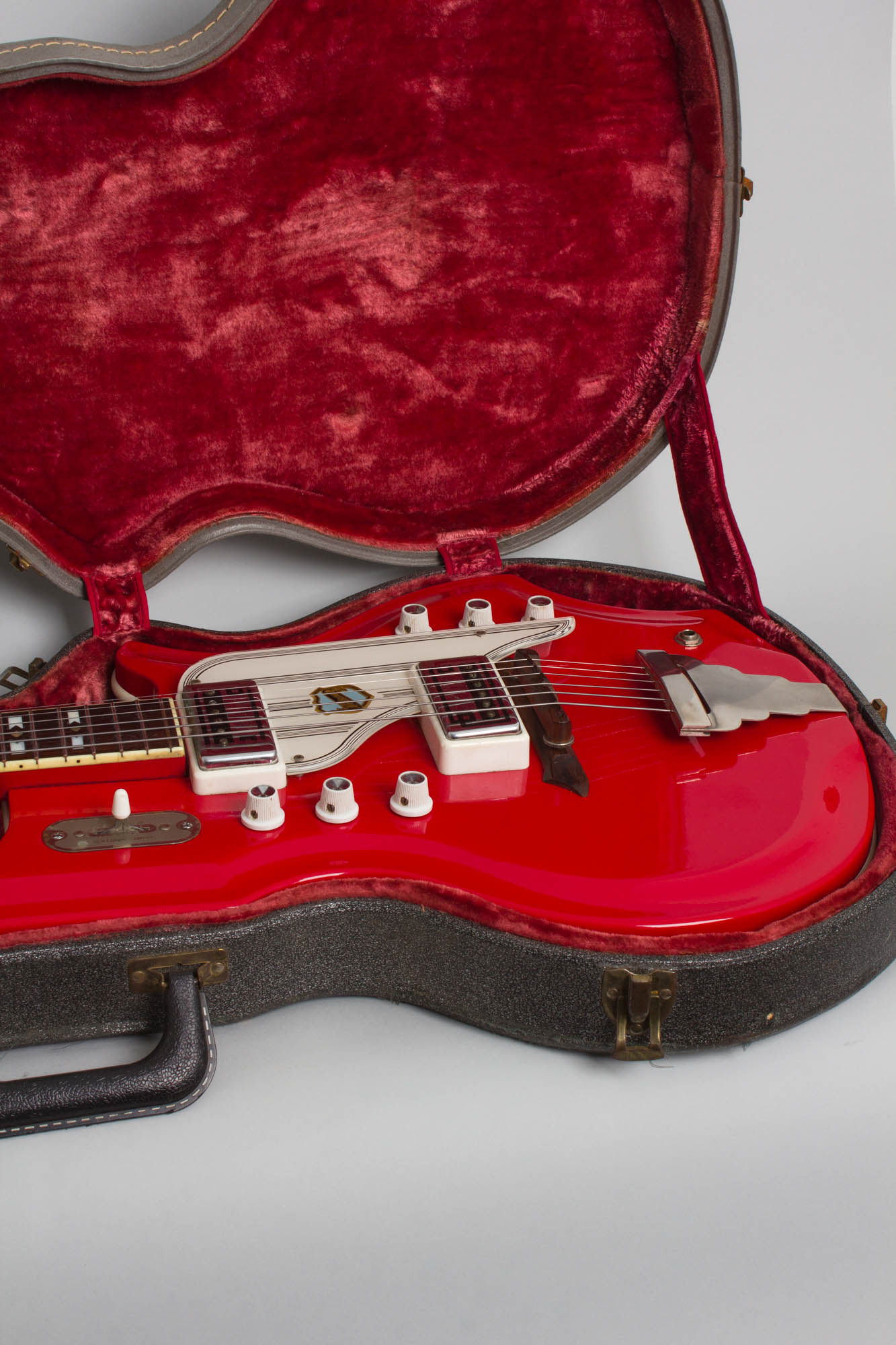 The "Glenwood" models were the top-of-the-line in this series; this Model 95 debuted in 1962 with a striking red finish and white accents on the sculpted "map" shaped body, which is more elaborately sculpted on this series than the lower priced models. The maple neck has fancy split-diamond and block fret markers on the bound fingerboard and stock Grover Rotomatic tuners on the white-faced "Gumby' headstock. This model was priced in April 1962 at $265 plus $49.50 for the hardshell case. The Model 98 was the only instrument priced above it at $295 with a white-finished body and an additional "Silver sound" pickup built INTO the bridge.