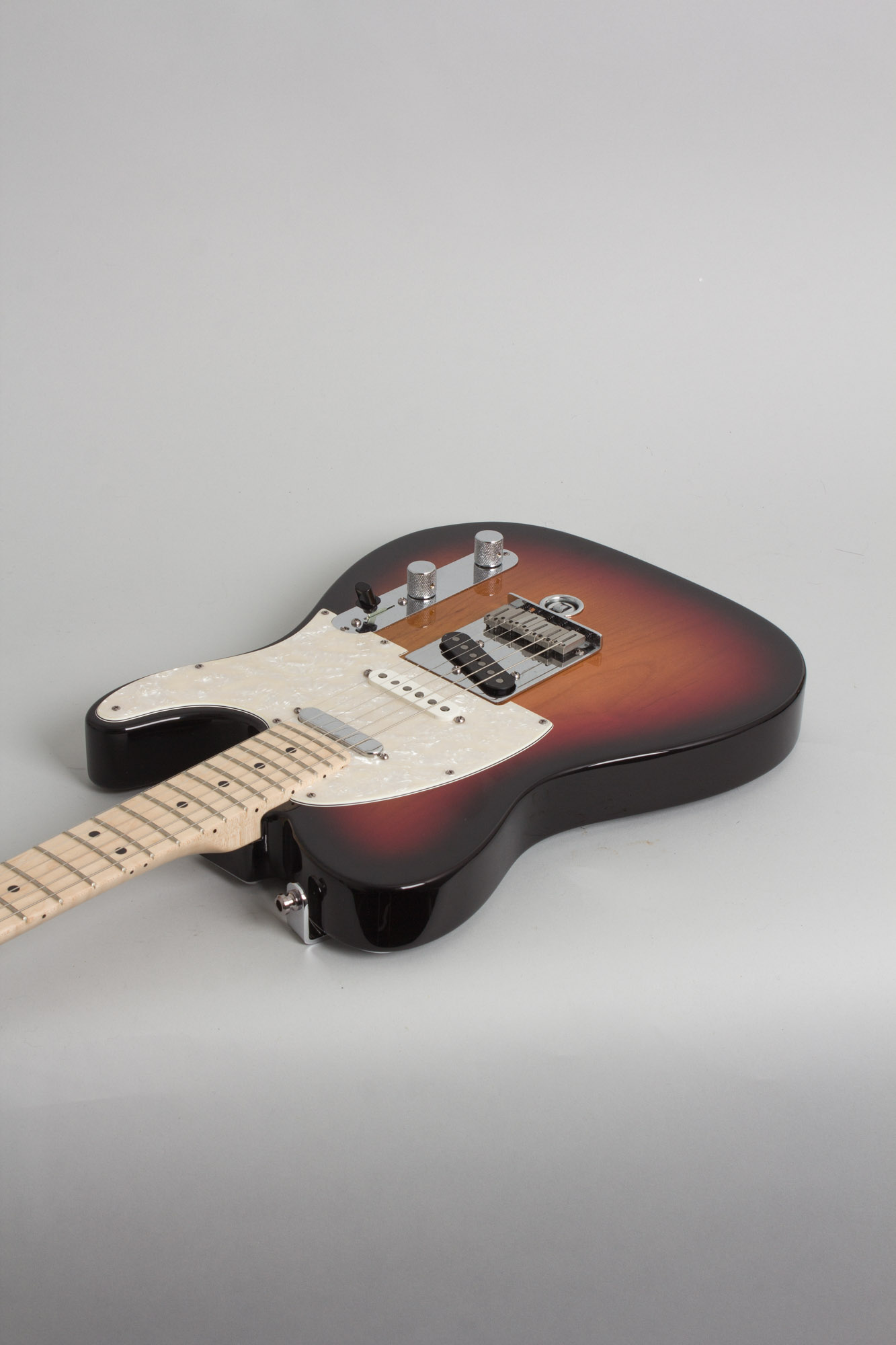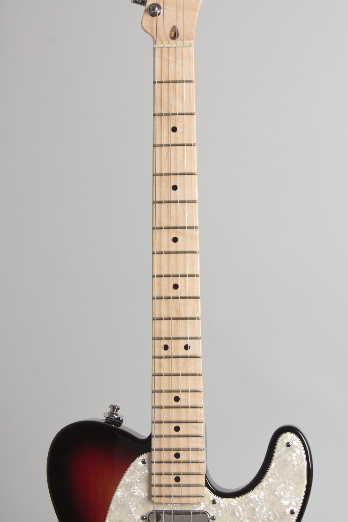 The pickups are American Standard Single-Coil Tele units with a Custom Shop Texas Special Single-Coil Strat in the middle position. These are set up with standard Strat 5-Position pickup switching and the traditional Telecaster master volume and tone knobs. The maple fingerboard neck has a 9.5" radius with a satin urethane finish and medium jumbo fretwire. The body is finished in sunburst with a snazzy pearloid pickguard.