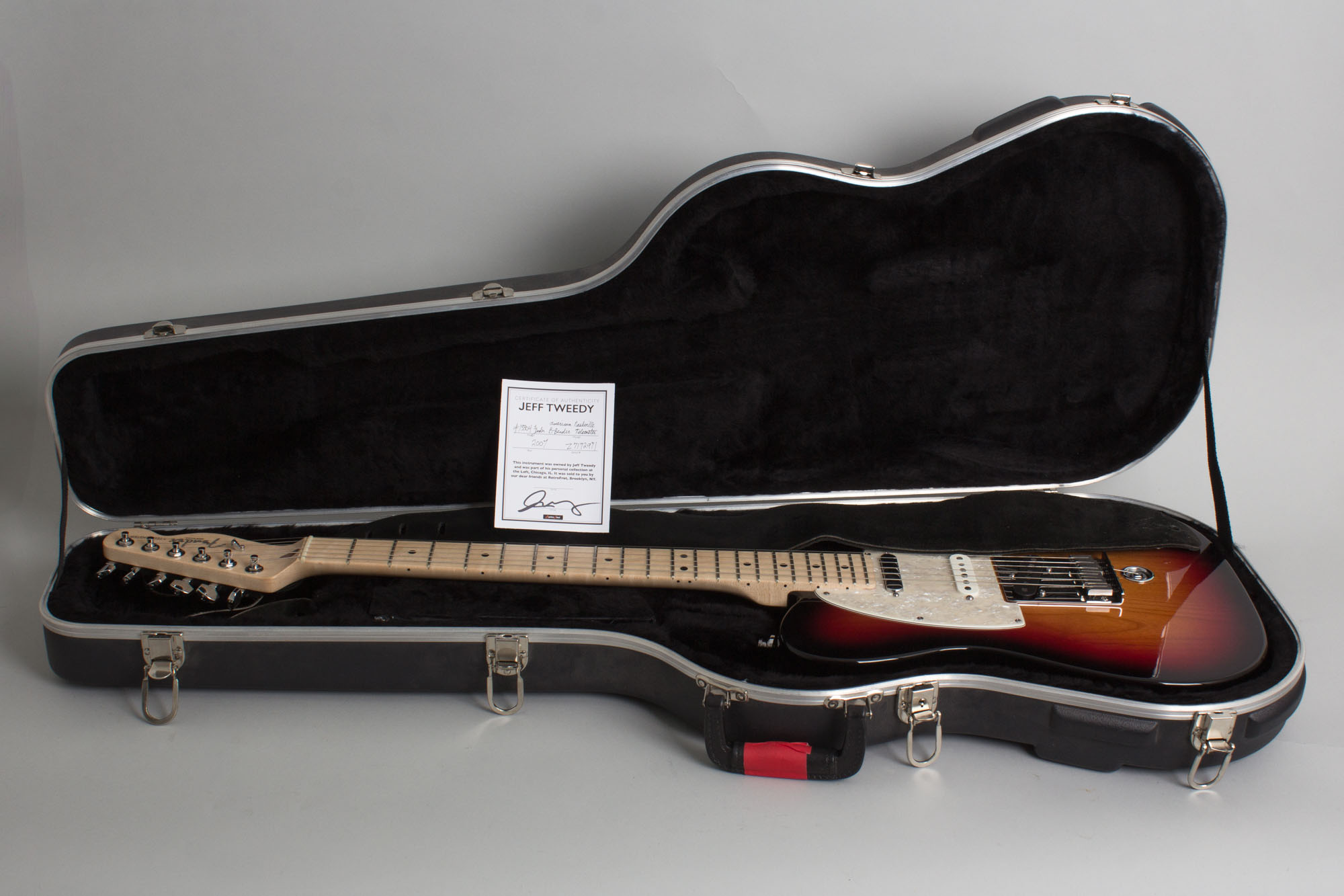 This guitar shows virtually no signs of use with no notable dings, dents, or scratches and the chrome plating on the B-Bender shines like it just came out of the box. It plays very nicely, sounds great, and functions exactly as it should and still has all its case candy with an additional wide black leather strap from Mr. Tweedy. The Fender molded hardshell case bears the markings of the Wilco Loft on the edge and inside is a certificate of authenticity further validating the provenance of this piece. And most importantly, it is undeniably a whole lot of fun if you are in need of an instant dose of twang. Overall Excellent + Condition.