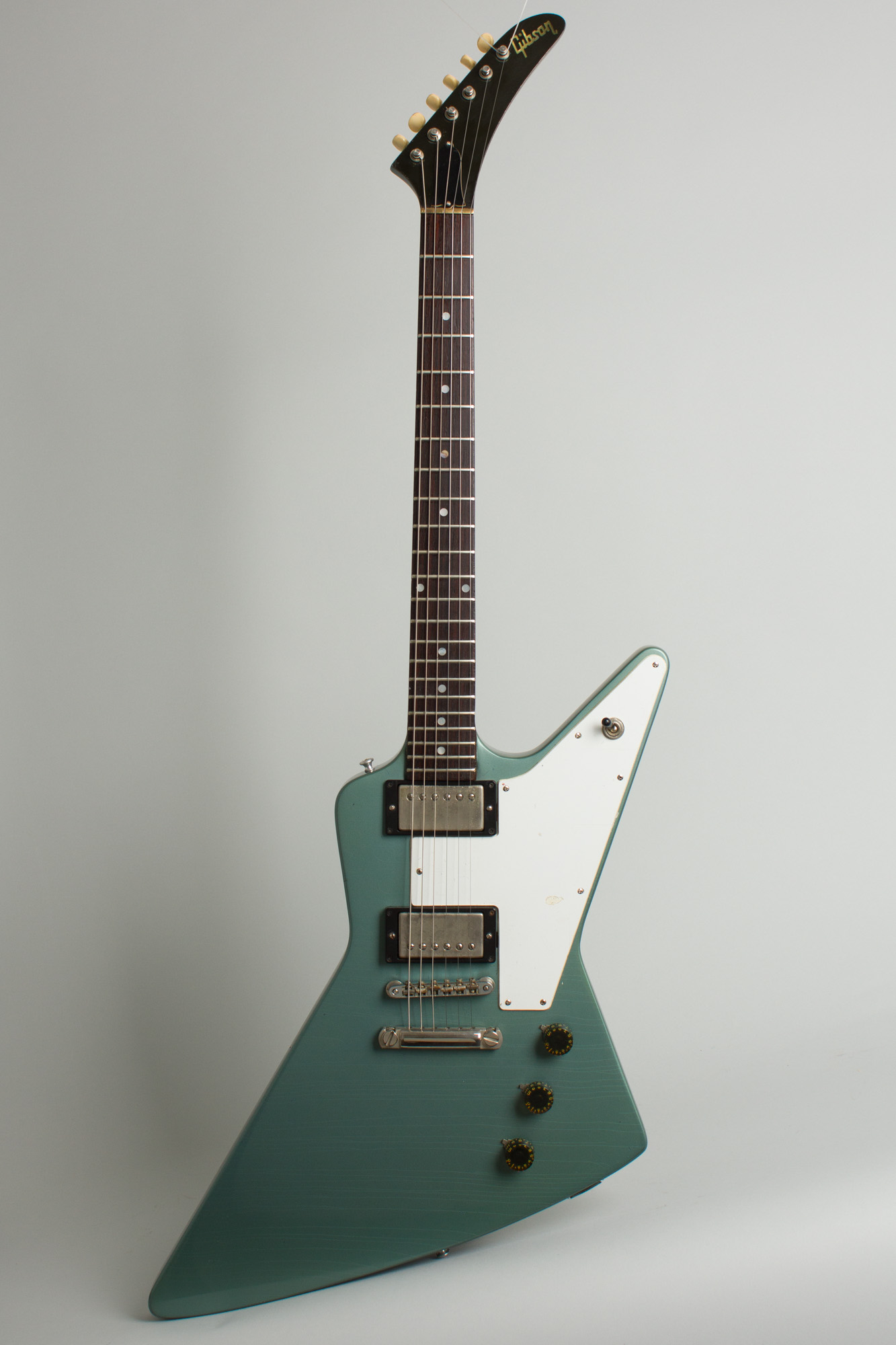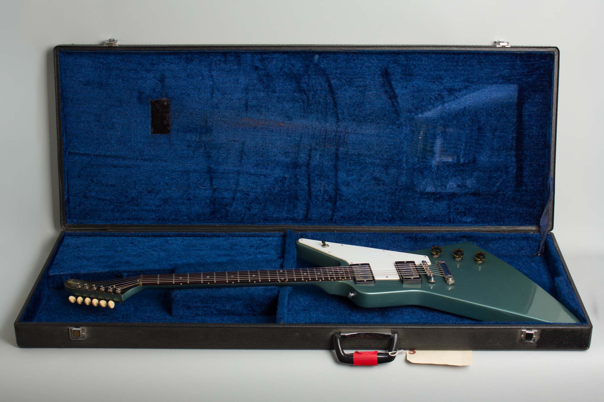 Gibson Explorer Owned by Jeff Tweedy of Wilco Model Solid Body Electric Guitar (1976), made in Kalamazoo, Michigan, serial # 00233175, Pelham Blue Re- finish, mahogany body and neck, rosewood fingerboard, black hard shell case.