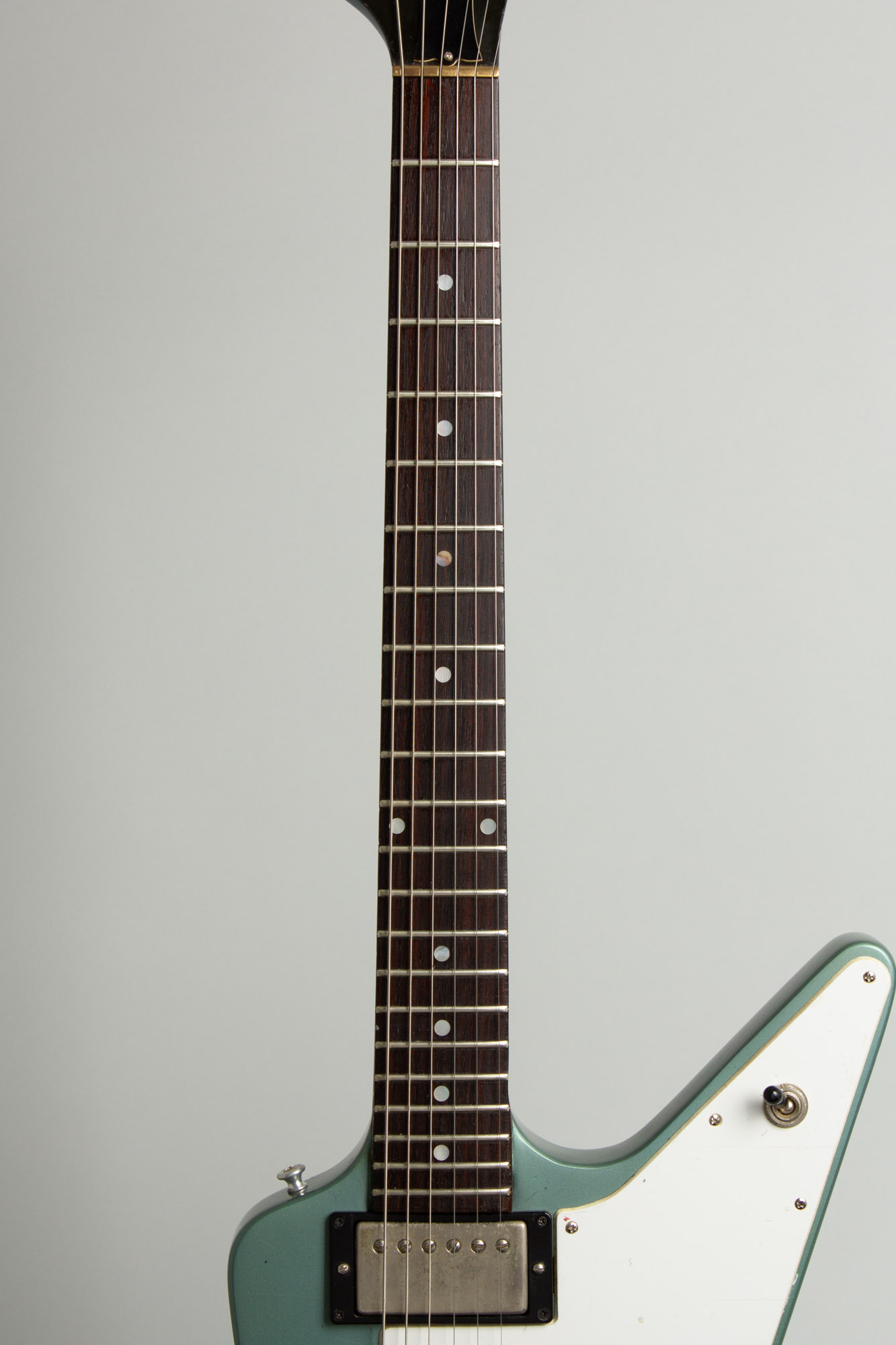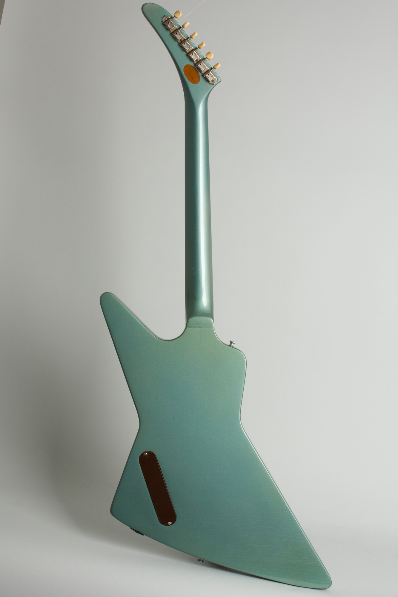 This superbly striking angular blue beast is an original 1976 "Limited Edition" Gibson Explorer, refinished but still identifiable by the inset decal serial number inset on the back of the long drooping headstock. Some time back this formerly natural finished Explorer was totally re-done in a lovely metallic blue shade somewhere between Gibson's Pelham Blue and Fender's Ice Blue Metallic. This was a very professional job and the serial number on the back of the headstock was neatly masked off and preserved. This is an attractive and unusual color for this model and beyond that it comes direct from the Wilco loft in Chicago.