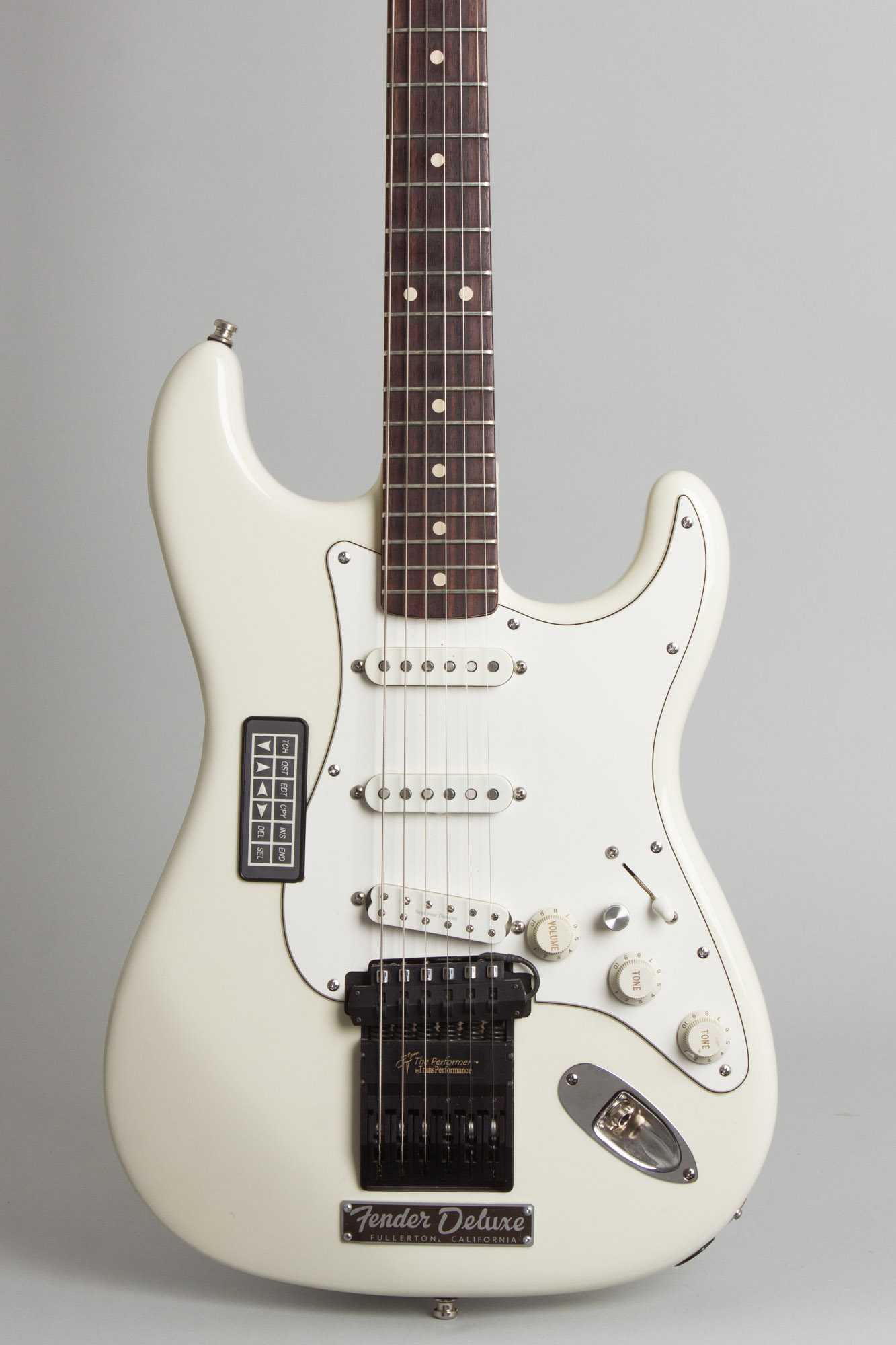 Transperformance Modified Fender Stratocaster Owned by Jeff Tweedy of Wilco Model Solid Body Electric Guitar, c. 2000s, made in Fort Collins, Colorado, Olympic White lacquer finish, alder body, maple neckwith rosewood fingerboard, brown tolex hard shell case.