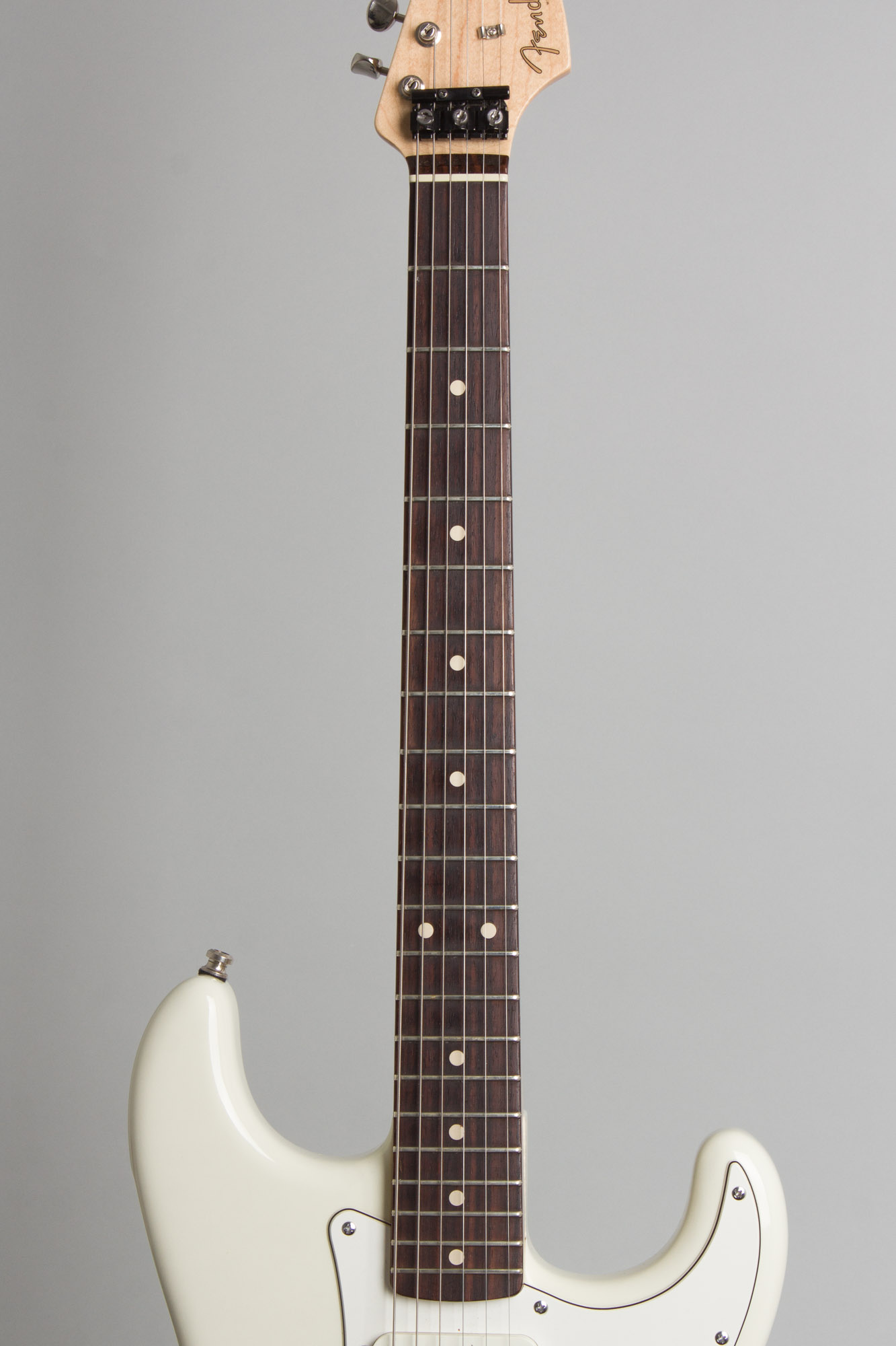 This unusual Stratocaster is in overall very clean shape cosmetically with only a few dings and scratches here and there: a very faint amount of buckle rash that does not eat through the Olympic White lacquer and some chipping at the very top of the heel from where the neck has been popped off likely more than a few times during the modifications. The stock American Fender body retains the original finish; the guitar was upgraded with a Fender Custom shop neck which still has its original frets and tuners.