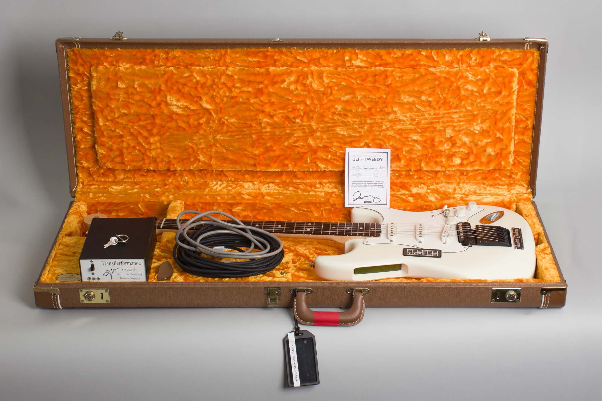 The 12V power supply for the Transperformance system and all necessary cables are crammed in a clean Fender-style brown G&G hardshell case. There is a tag on the case that this current case was actually a spare case donated to this guitar by the Wilco Loft. The typical Wilco Loft markings are on the bottom edge and within the case is a certificate of authenticity from the Wilco Loft validating this provenance. This is a one-of-a-kind souped up Strat for a futuristic player, requiring a full commitment to its possibilities. Excellent - Condition.