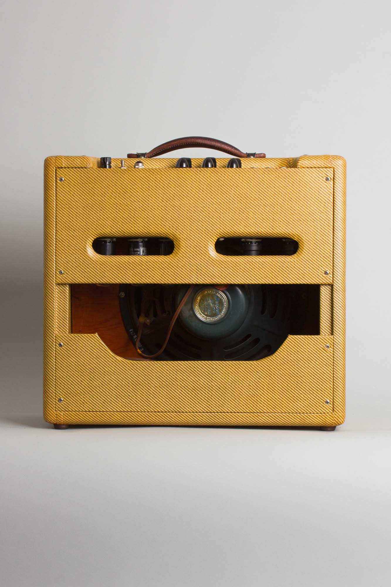 The cathode-biased push-pull 6V6 power section yields around 10-12 watts of power into a single Jensen 12" speaker. The addition of a separate on/off switch not incorporated into a pot was the most notable change this model offered from the preceding 5B3 Deluxe, which was effected during 1953. The Deluxe has remained a classic for recording since the '50s and in our lower volume age has effected a return as a gigging amp as well, although this one is so clean it would be a brave soul who gigs it!