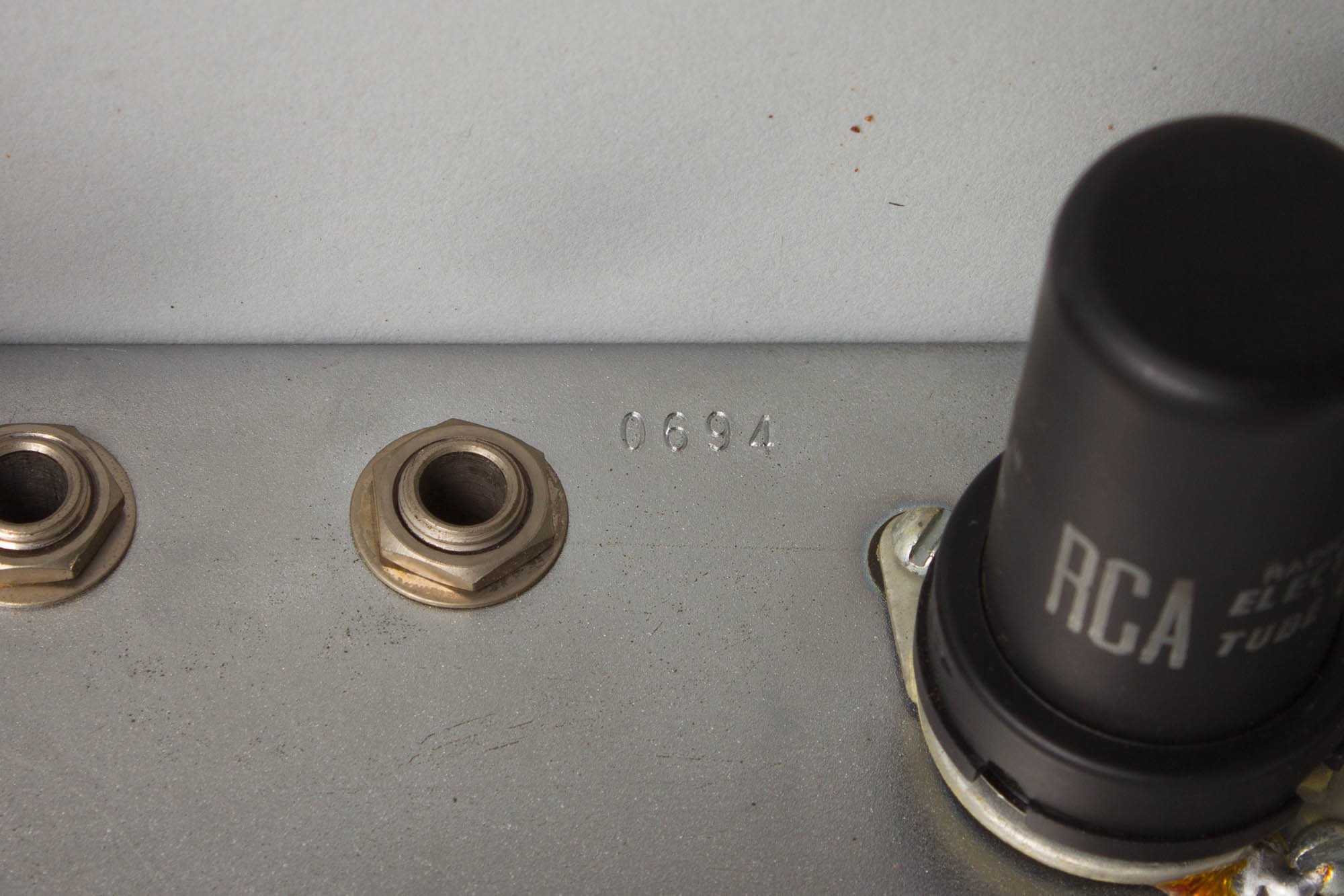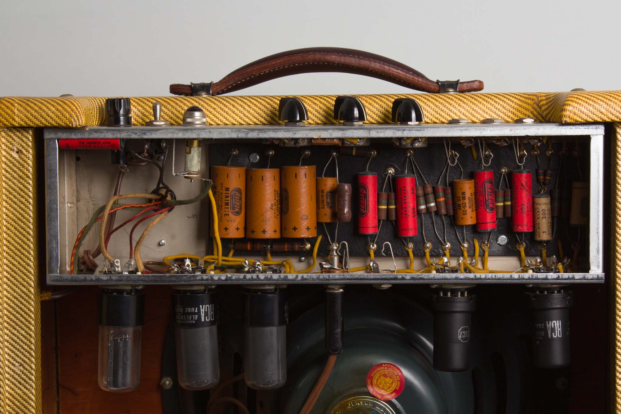 Electrically, the amp is original and completely untouched, featuring the original power and output transformers, both made by Triad and marked 6452 and 71-246, respectively. The original Jensen P12R speaker is in outstanding condition and is dated 220 242 (42nd week of 1952). All three pots are original and date to the 16th week of '53. The amp retains what is likely the original set of RCA tubes. The chassis was lovingly wired up by Julia, bearing her handwritten name on the masking tape tag inside.
