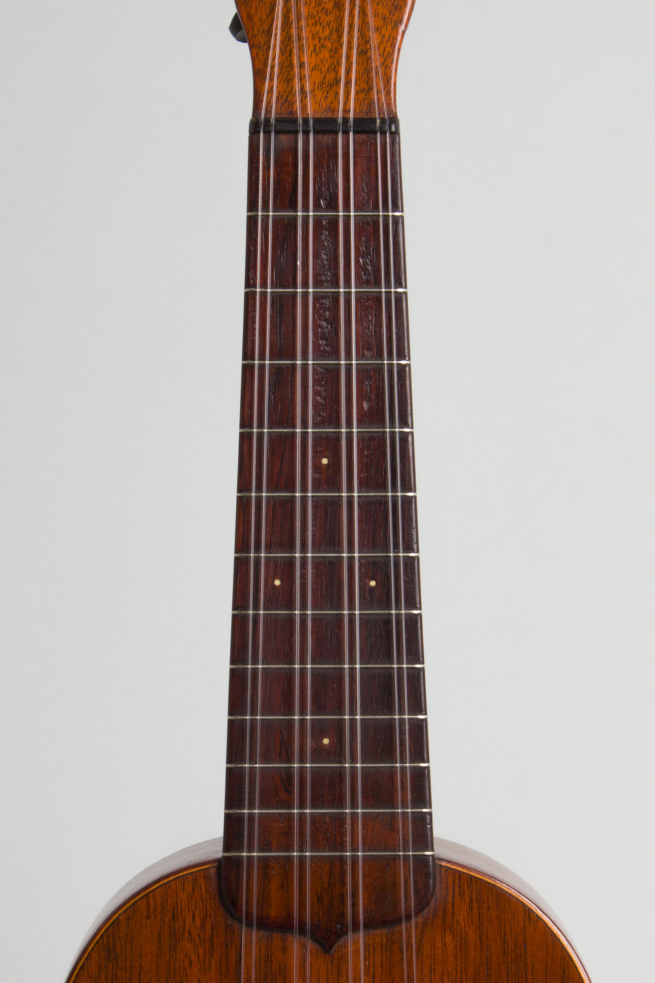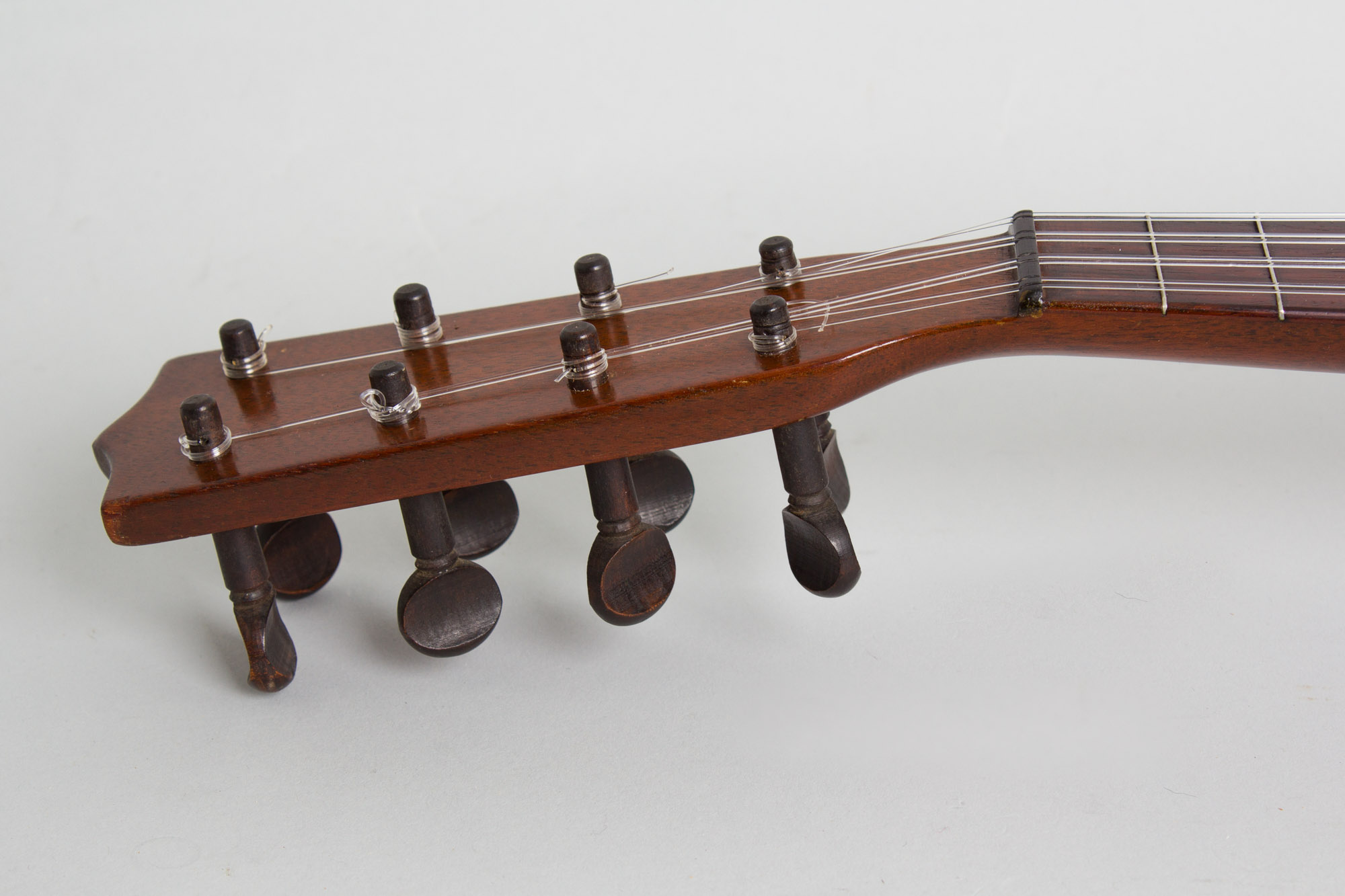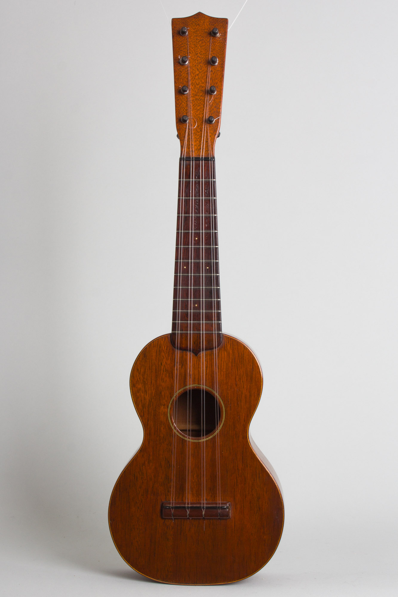 The eight-string Taropatch (originally called the "Taro Patch fiddle") was one of the early Hawaiian forms of the ukulele, persisting in the islands even after the familiar 4-string uke was popularized. Comparatively few versions were ever made on the mainland, but the instrument was offered as part of C. F. Martin's early ukulele line from 1916 through 1931. With eight gut strings on a longer scale neck the Taropatch was considered harder to play (and tune!) than the simple uke, and thus ordered in vastly smaller numbers. Eventually Martin adapted this body form into the 4-string concert uke, which pretty much replaced it in the company's line.