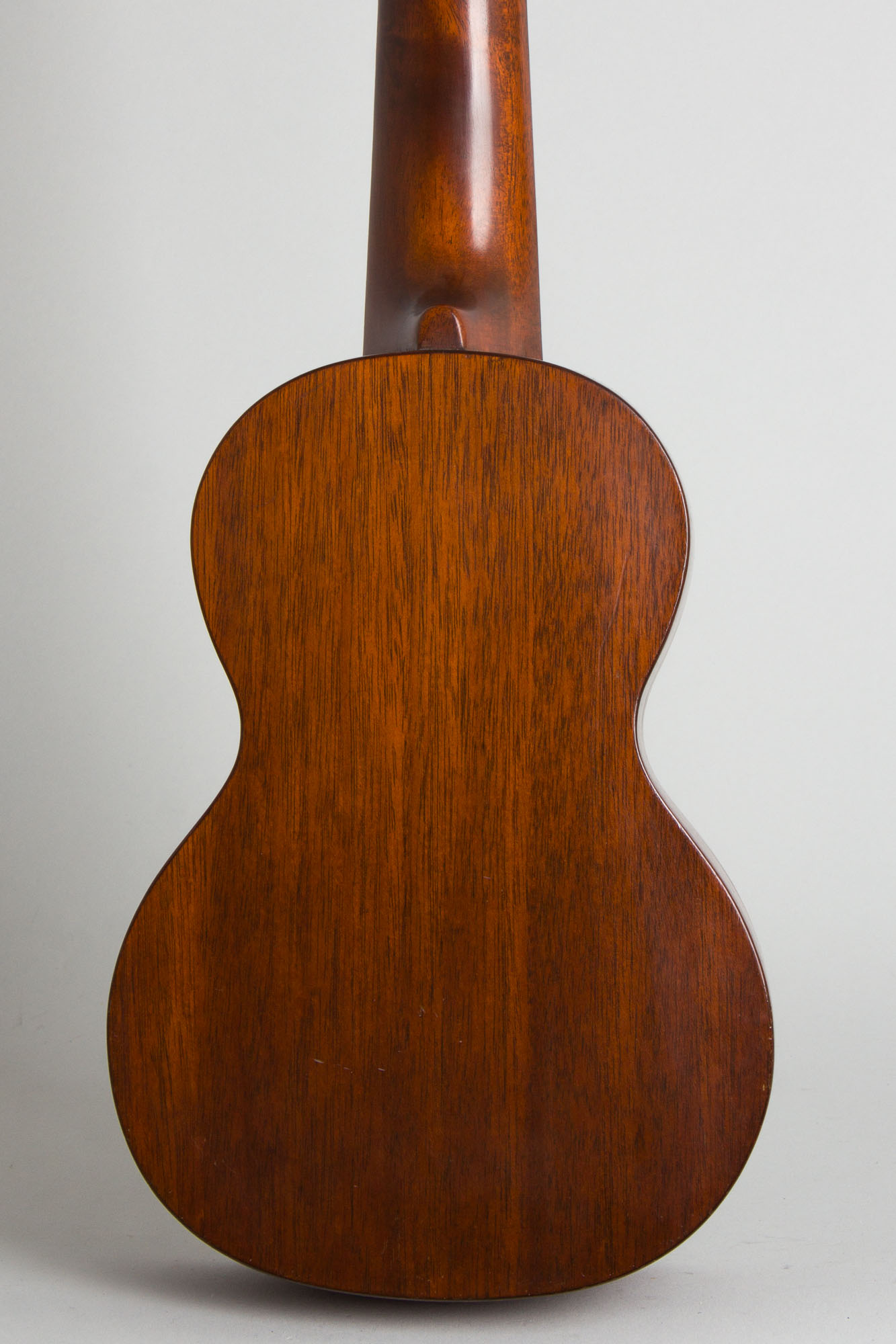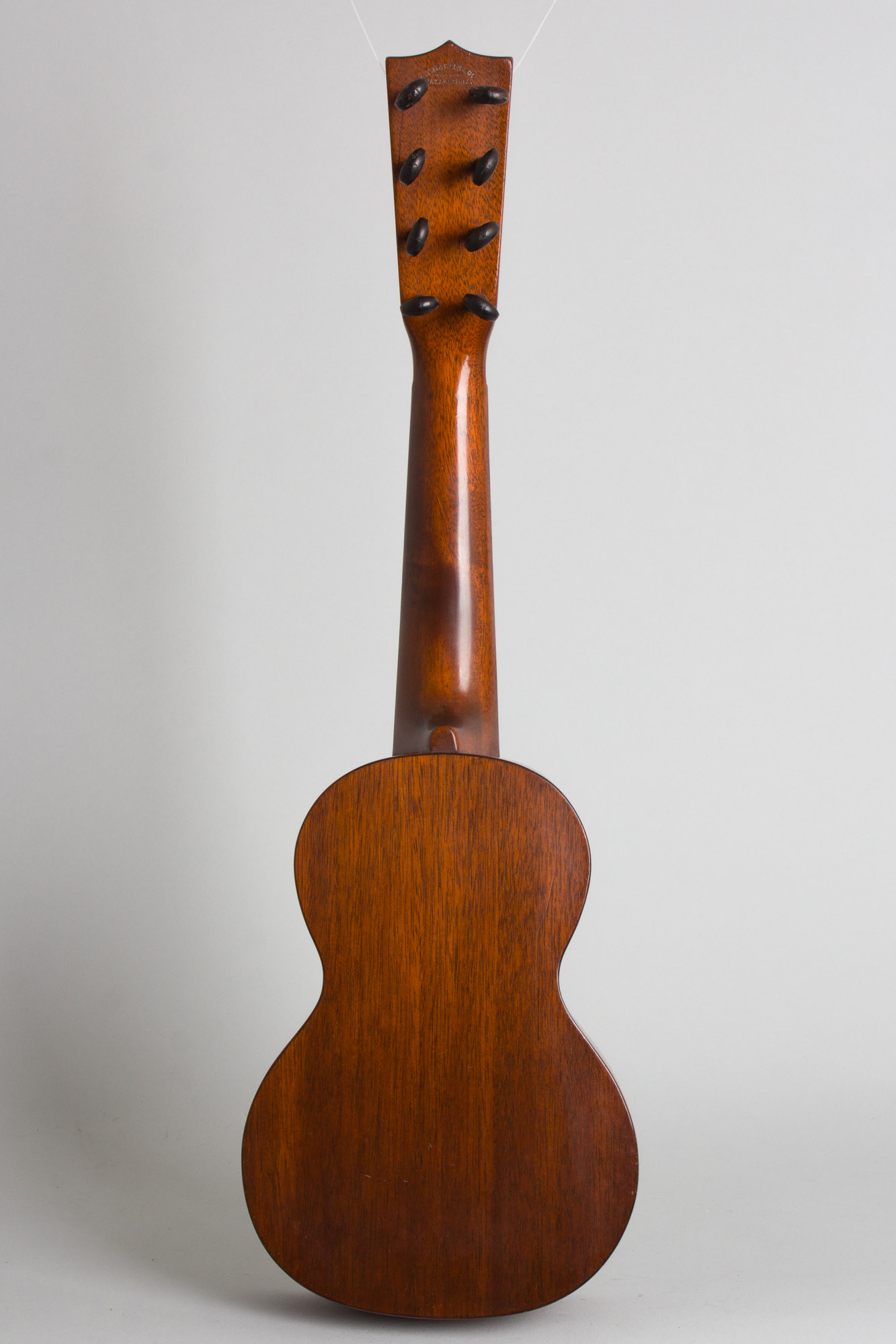 The Martin Taropatch was offered as a stock model in mahogany in Styles 1, 2 and 3 and also in Koa at a slight upcharge. Even this basic model 1920s Style 1 is a fairly rare instrument, one of aroud 1100 ever made. Style 1 Taropatches were listed in the catalog until 1931 but few were actually built after 1927; the combination of wooden pegs and beck binding neatly dates this one to 1926, the next-to-last year when 177 were shipped. This is a lovely find and a fine playing instrument; while more awkward to tune than a 4-string uke it rewards the player with a distinctive chorused double-strung sound that has a real archaic island character.