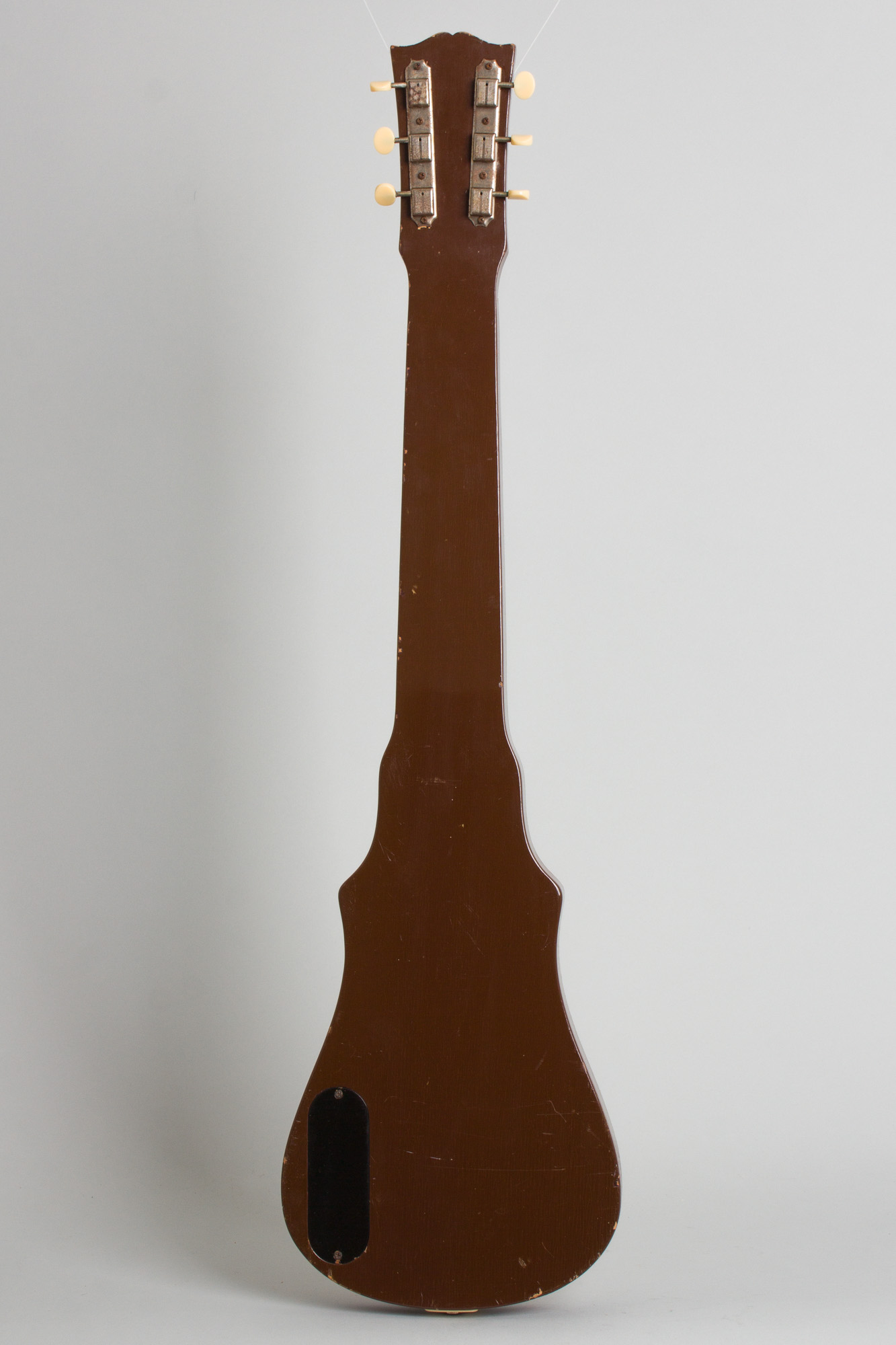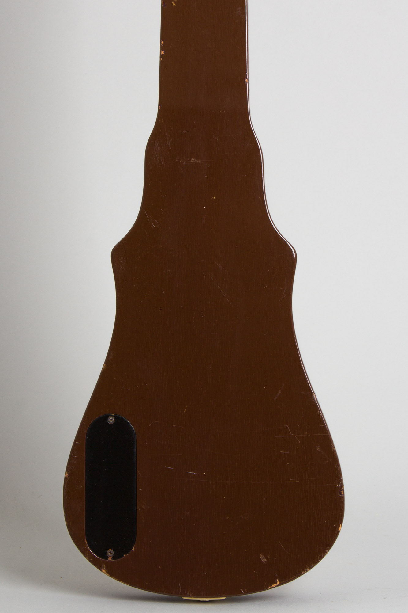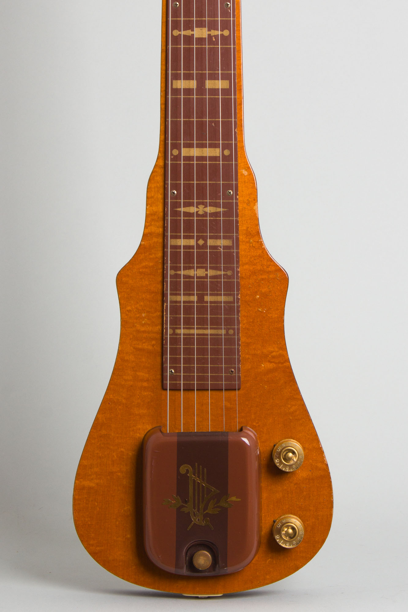 This is a great sounding if somewhat worn-in original example of one of Gibson's most obscure postwar lap steels, the Royaltone. This original version of the model was only built from 1950-52, and only around 600 were ever made. The stepped hardwood body has a nice figured maple cap on the top (prefiguring the Les Paul?) but the back and sides are finished in a non-descript brown. The cool back-painted Lucite bridge cover is a typically Gibson touch in this period. The standard Gibson headstock has a decal logo and mounts the earliest Kluson Deluxe tuners. The Royaltone is equipped with an early P-90 pickup giving a typically "Gibson-esque" character to the tone, not as bright as period fender and Rickenbacker instruments. This is a cool Kalamazoo rarity and still a fun steel to play.