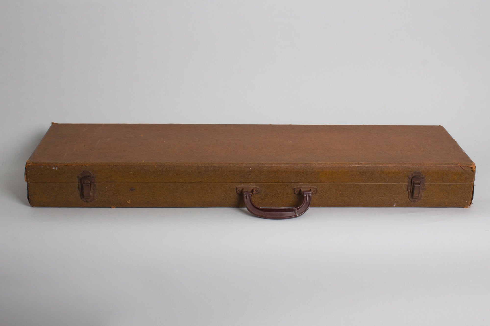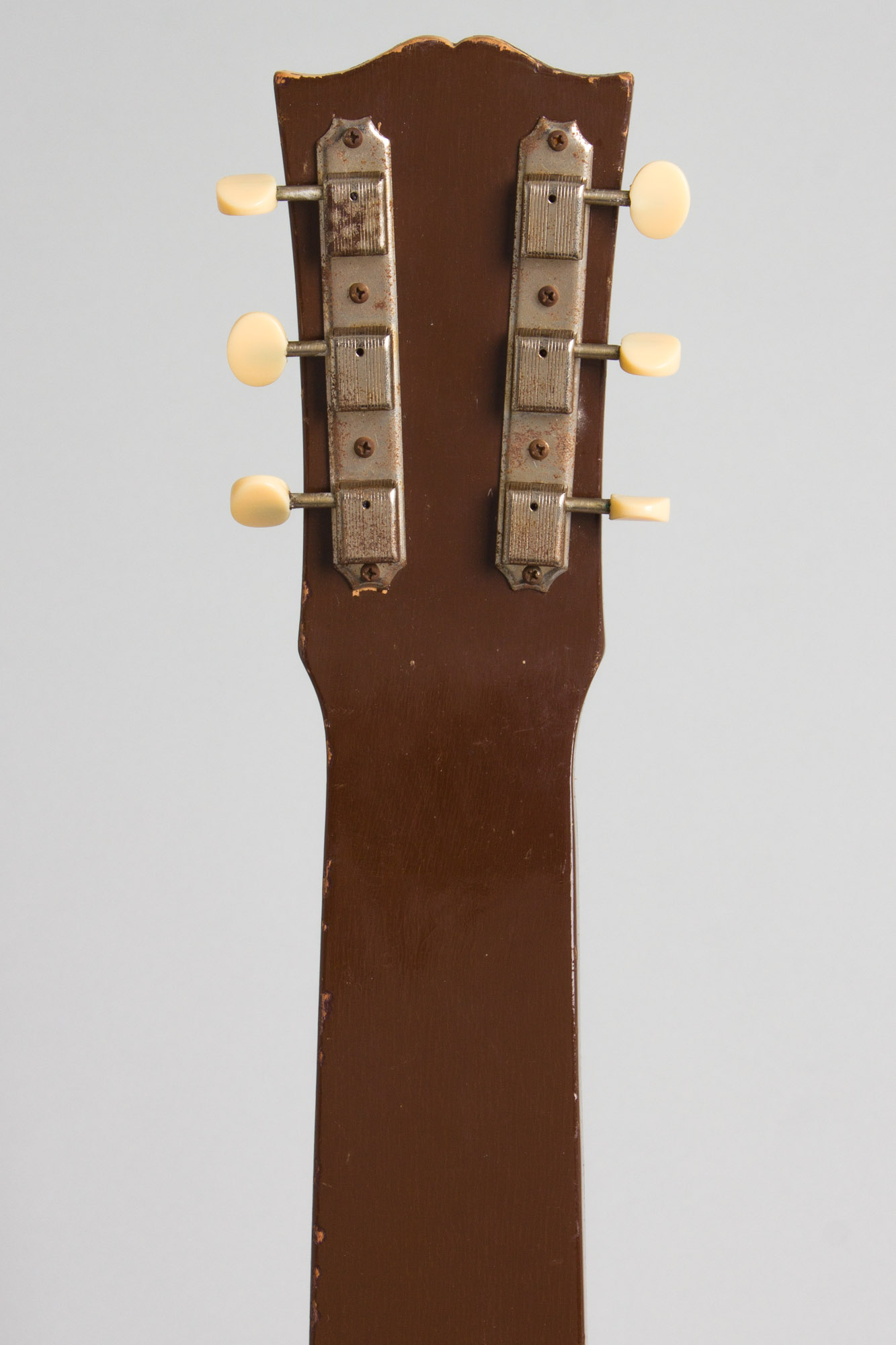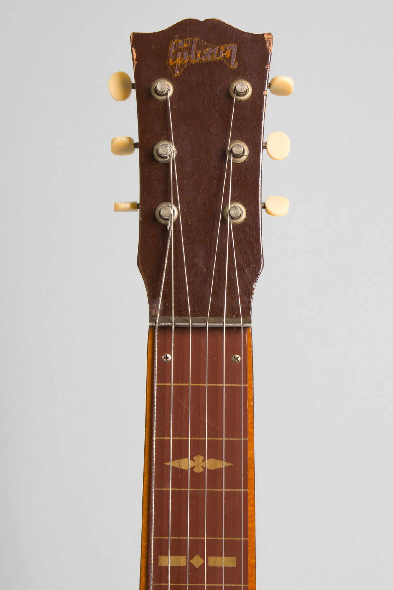 This is a great sounding if somewhat worn-in original example of one of Gibson's most obscure postwar lap steels, the Royaltone. This original version of the model was only built from 1950-52, and only around 600 were ever made. The stepped hardwood body has a nice figured maple cap on the top (prefiguring the Les Paul?) but the back and sides are finished in a non-descript brown. The cool back-painted Lucite bridge cover is a typically Gibson touch in this period. The standard Gibson headstock has a decal logo and mounts the earliest Kluson Deluxe tuners. The Royaltone is equipped with an early P-90 pickup giving a typically "Gibson-esque" character to the tone, not as bright as period fender and Rickenbacker instruments. This is a cool Kalamazoo rarity and still a fun steel to play.
