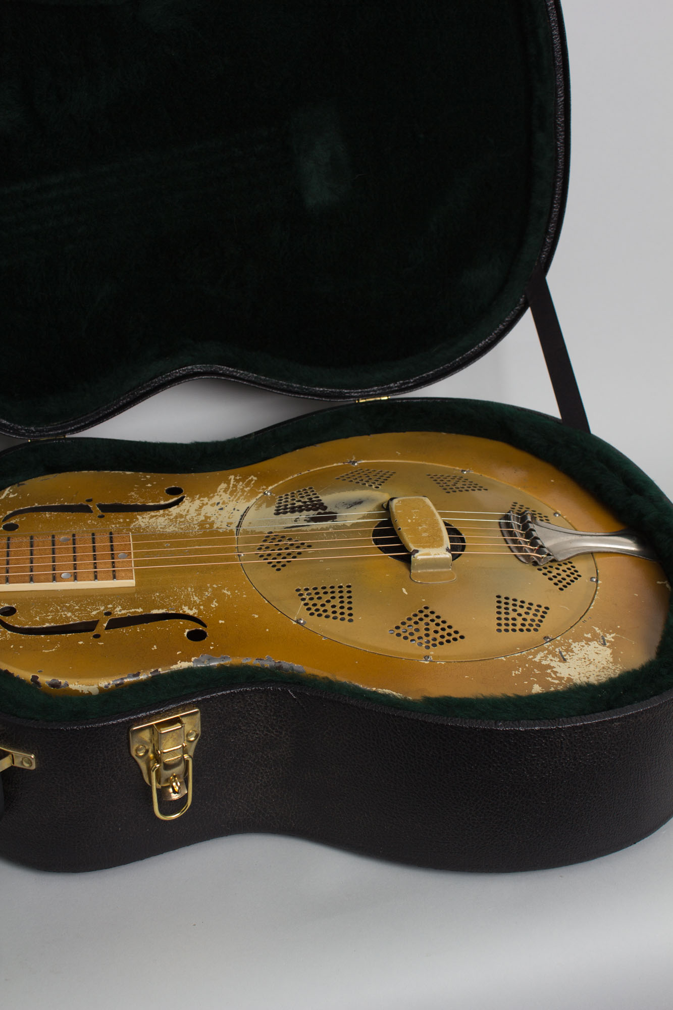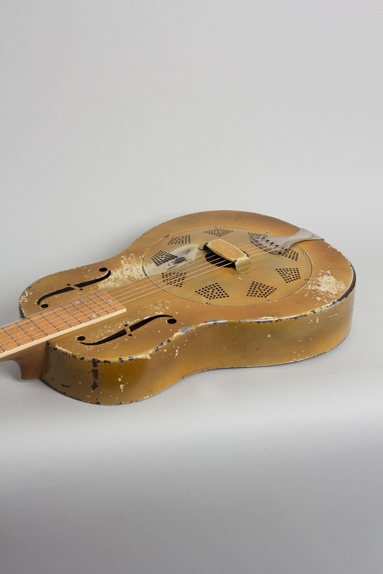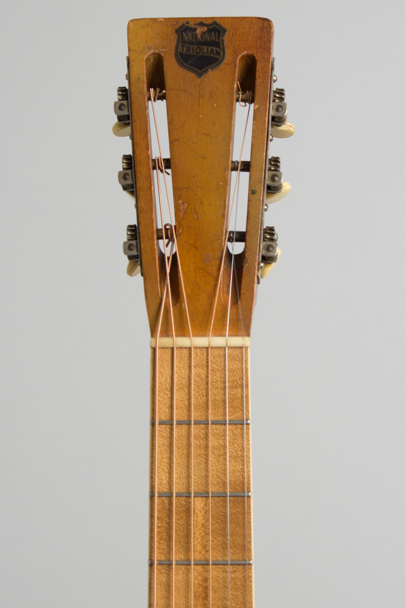 This is a well-worn but good playing example of an original steel-bodied Triolian, National's "bread and butter" guitar during the Depression. Offering great sound and serious volume at the relatively modest price of $45.00, the Triolian was crucial to the company's survival in the 1930s. With National Tricone guitars priced well over $100 and the flashy brass-bodied Style 0 at $62.50, the single-cone Triolian made the National sound available to a much wider range of players. Made of slightly better grade materials than the bottom-of-the-line $32.50 Duolian, the Triolian was extremely popular among blues and hillbilly musicians and is still an excellent choice for many styles of playing.