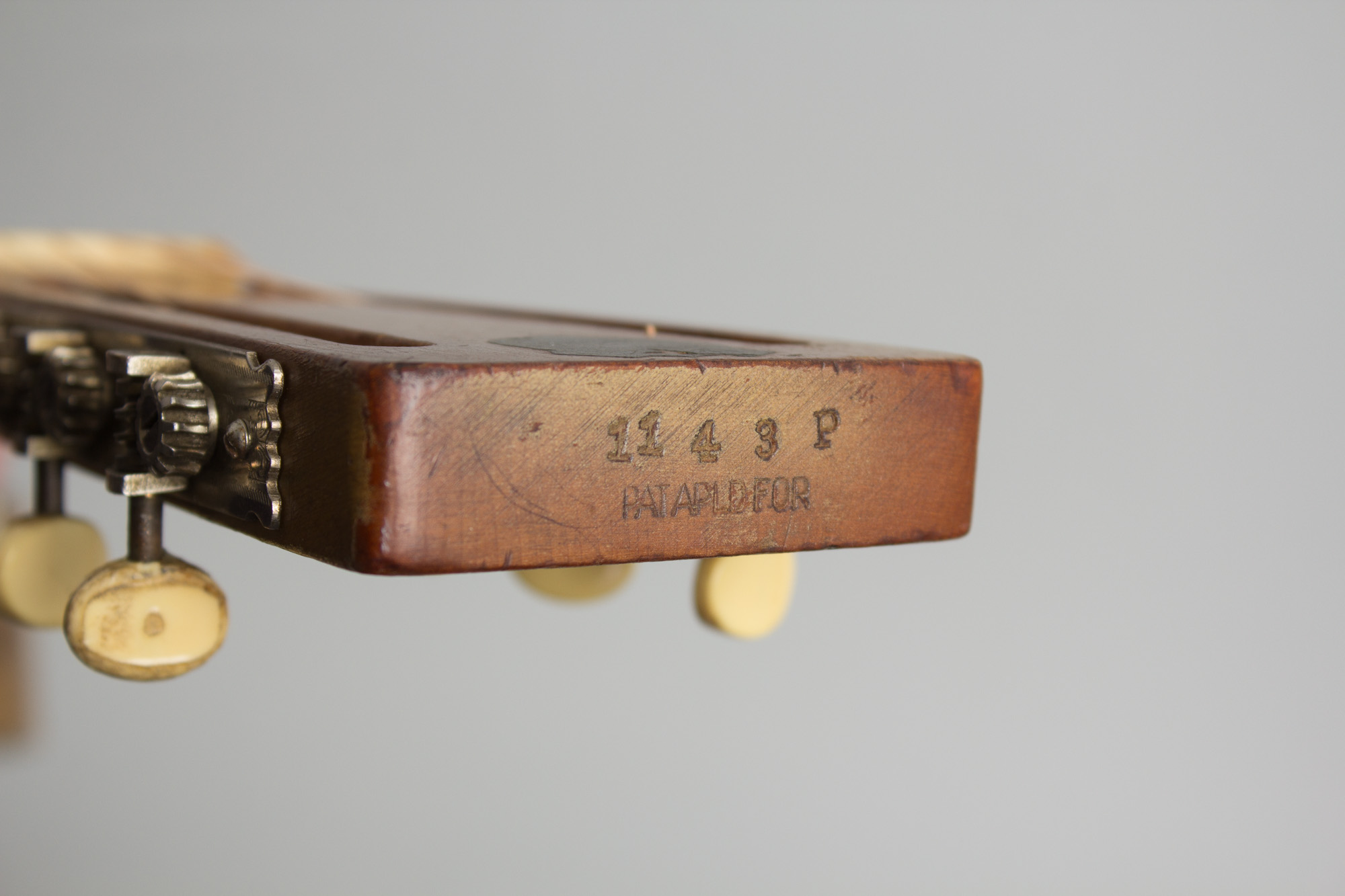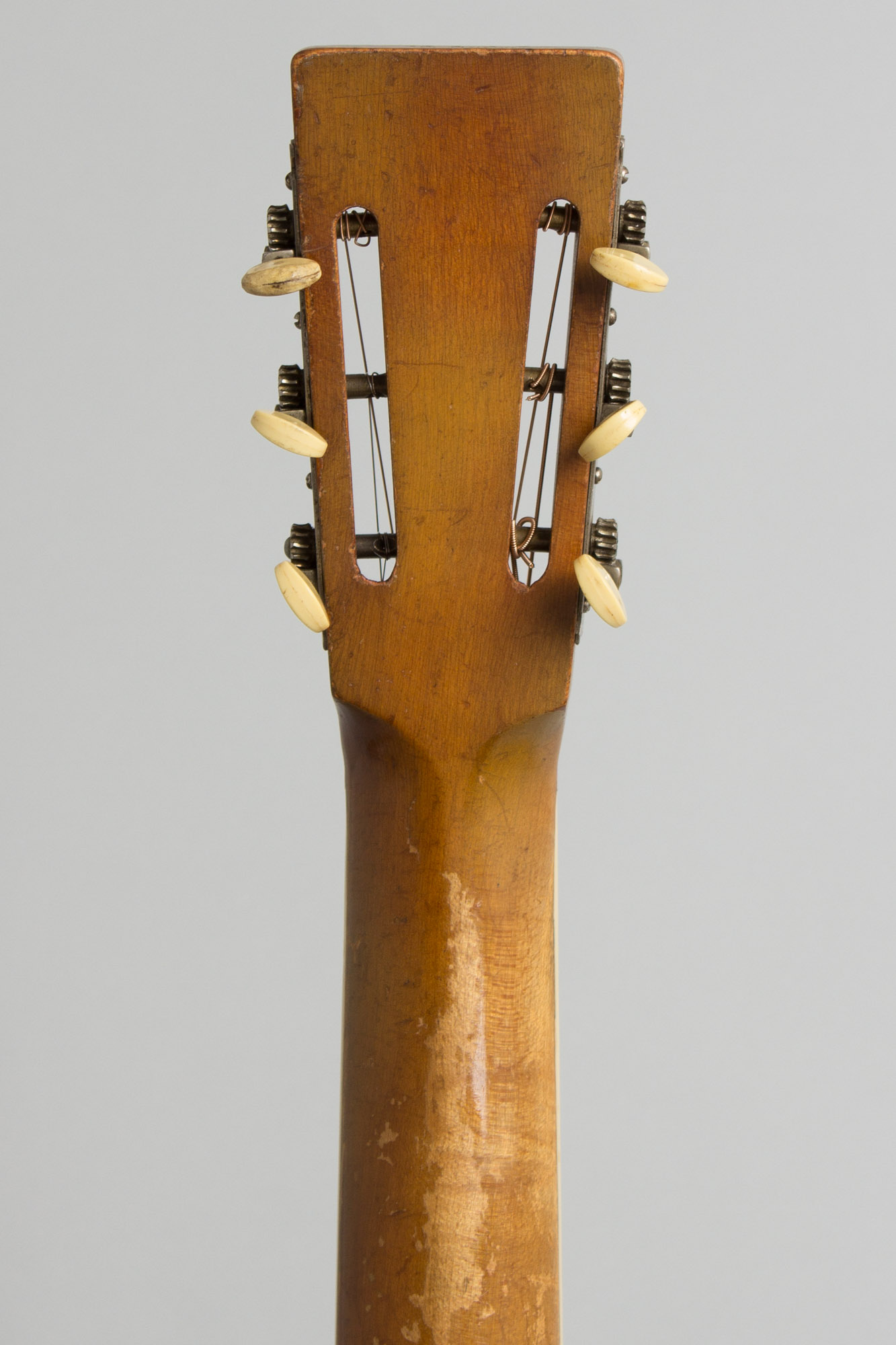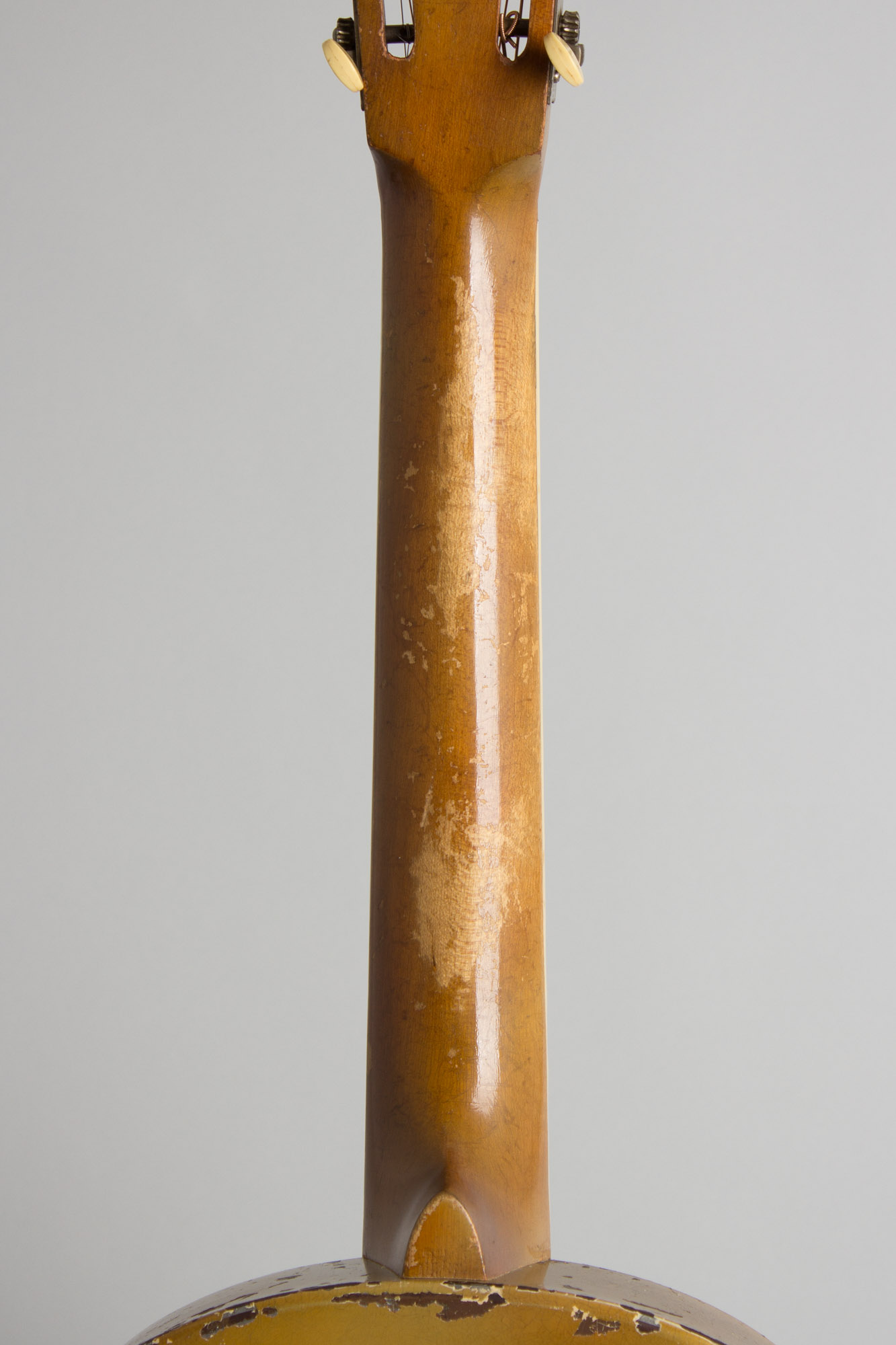 The 12-fret basswood neck has a much thinner profile than some, with a fairly subtle "V" spine. It is fitted with a maple fingerboard; the original dyed wood has been planed and refinished amber natural. This is bound in ivoroid and though not painted as it originally was still harmonizes nicely with the color scheme. The tuner strips on the slotted headstock are the older 1920s cloverleaf-tipped longer-plate style, soon replaced with a cheaper square-end piece. This early-depression era guitar is definitely "Blues Approved", battered but loved and still sounding great well into the 21st century.