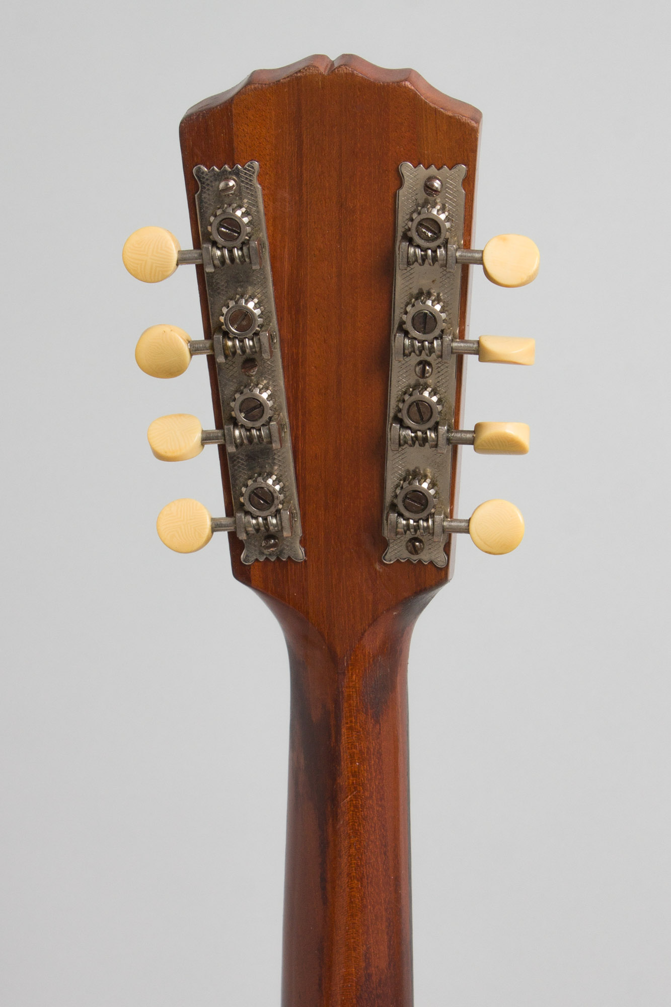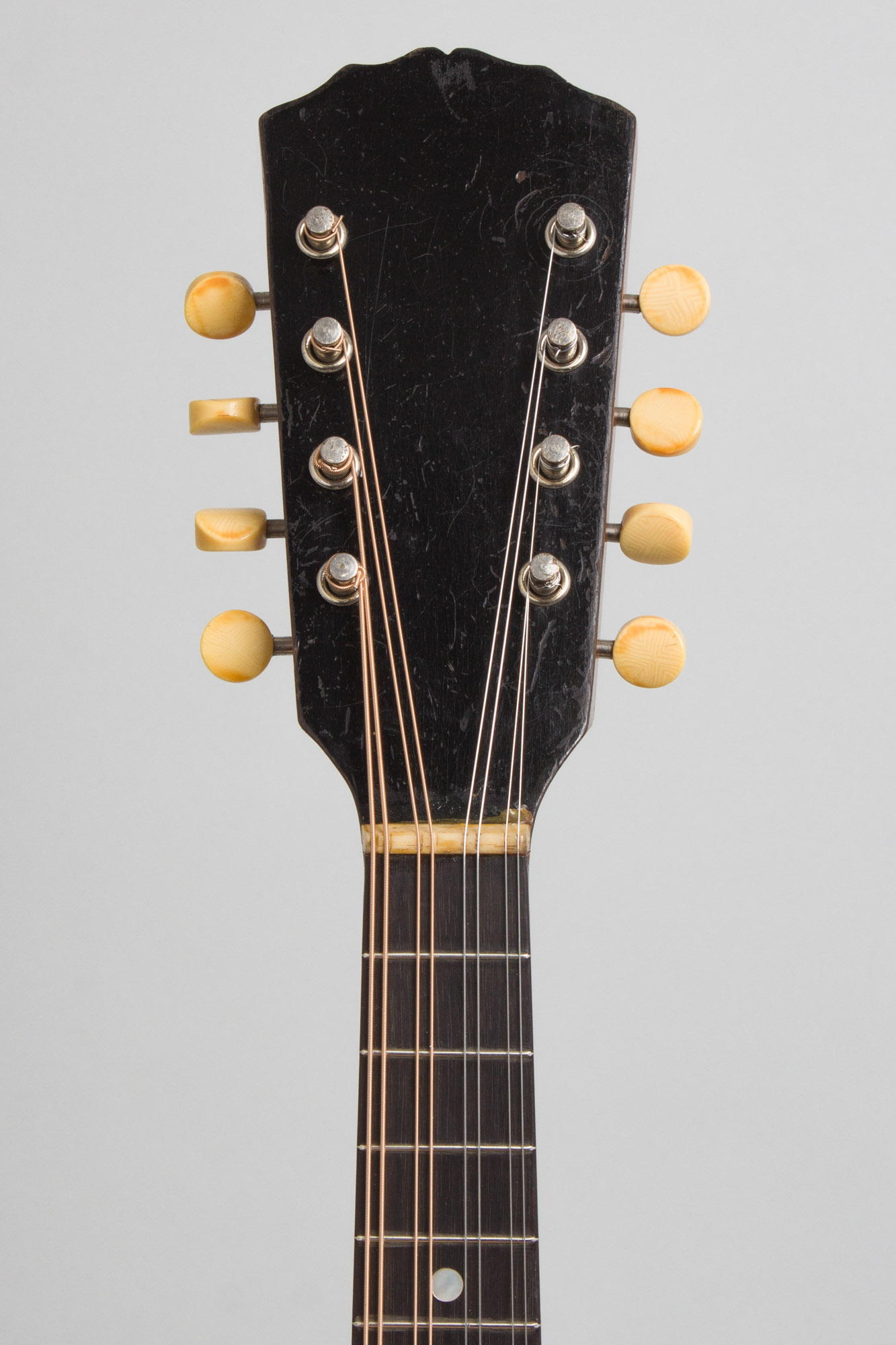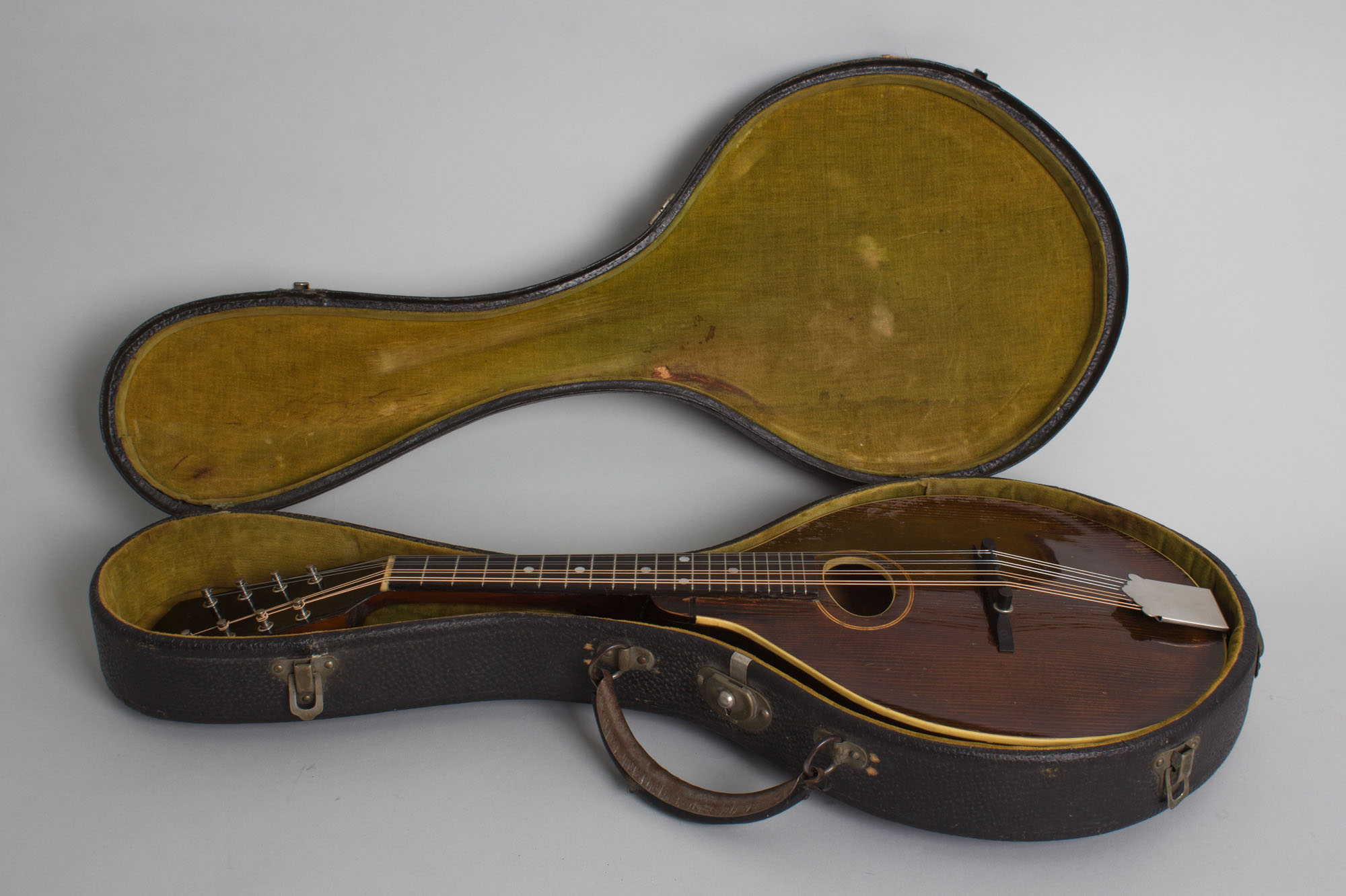 This is a well-worn example of the just pre-Loar era Gibson Style A Mandolin, looking quite used more than a century on but still a fine player. The serial number penciled on the white label indicates this one was shipped out in early 1920, when "Master Loar" was an endorsing artist but not yet fully on staff at Kalamazoo. A typical period feature is the dark but very thin "Sheraton Brown" varnish finish overall. The top is spruce with a fairly bold grain, the back and sides are birch and the neck Honduras mahogany with a heavy unbound ebony fingerboard. The pickguard is long gone, and the bridge and tailpiece covers are replacements