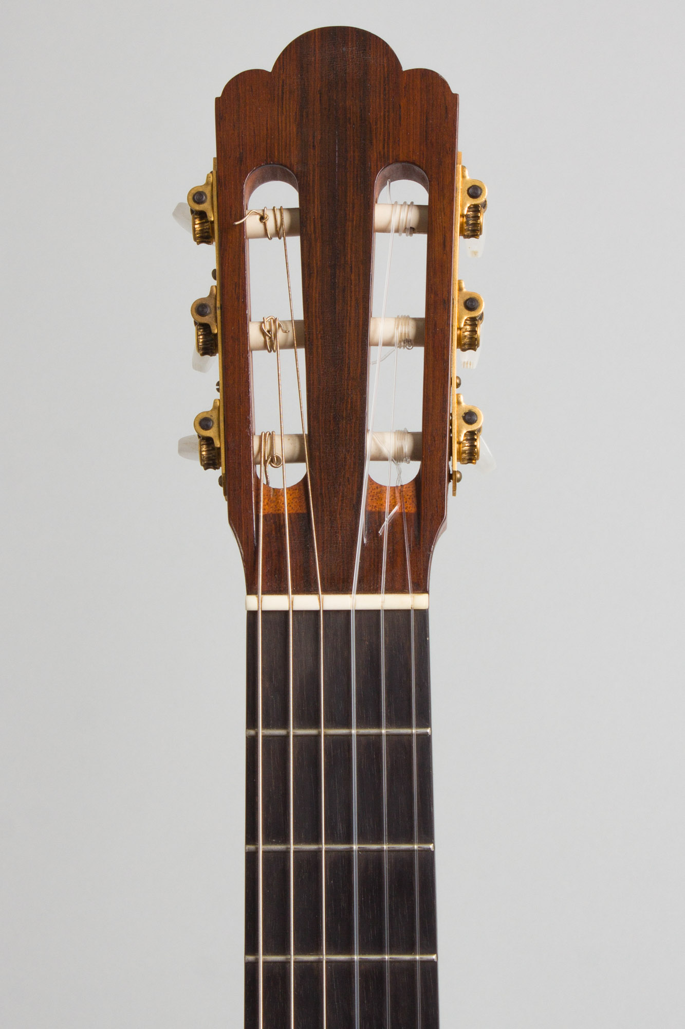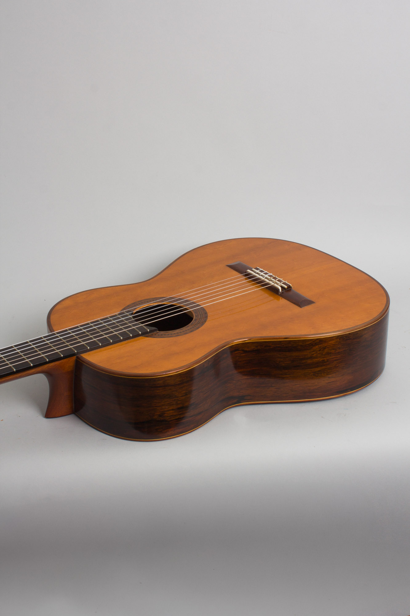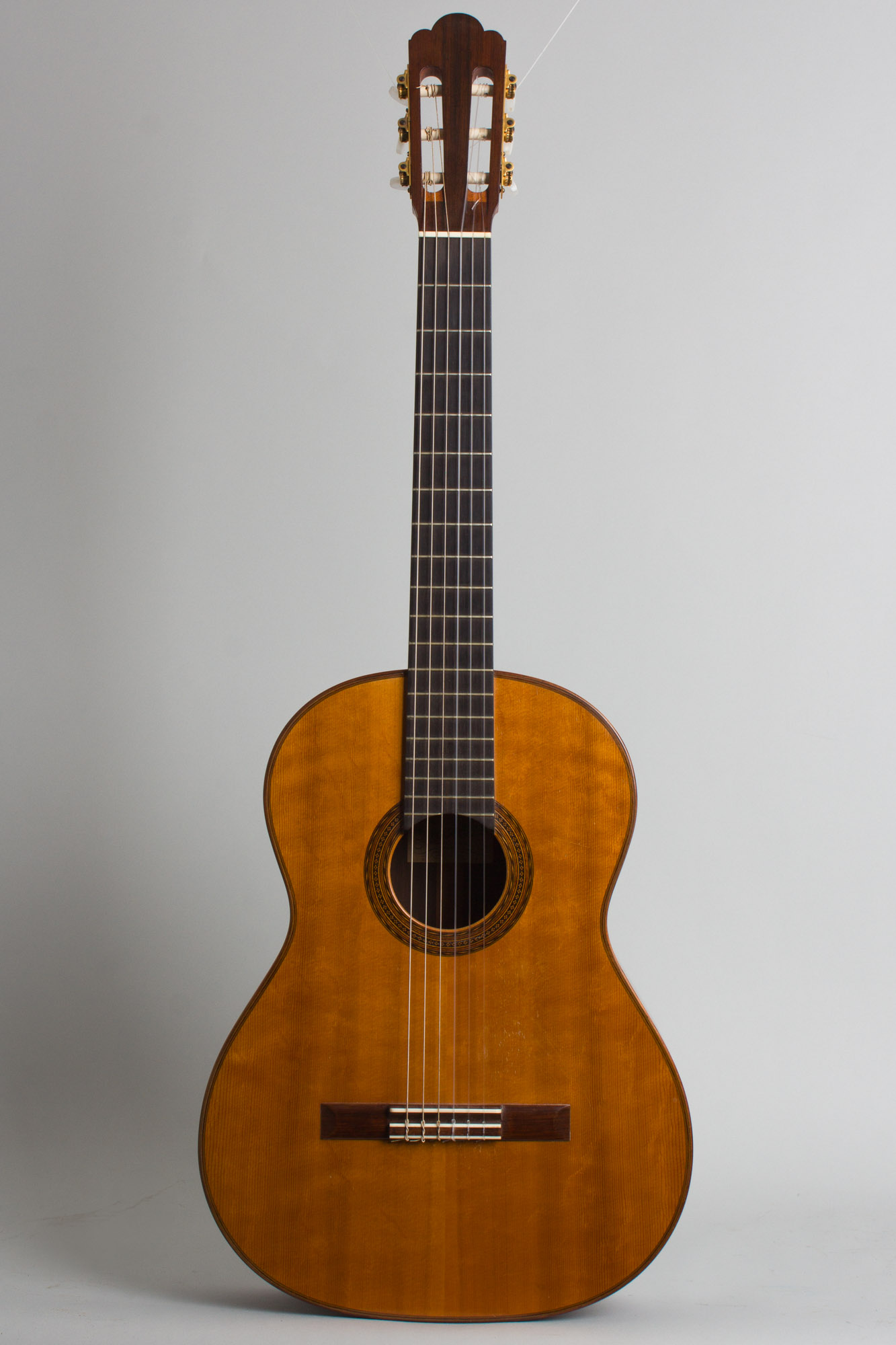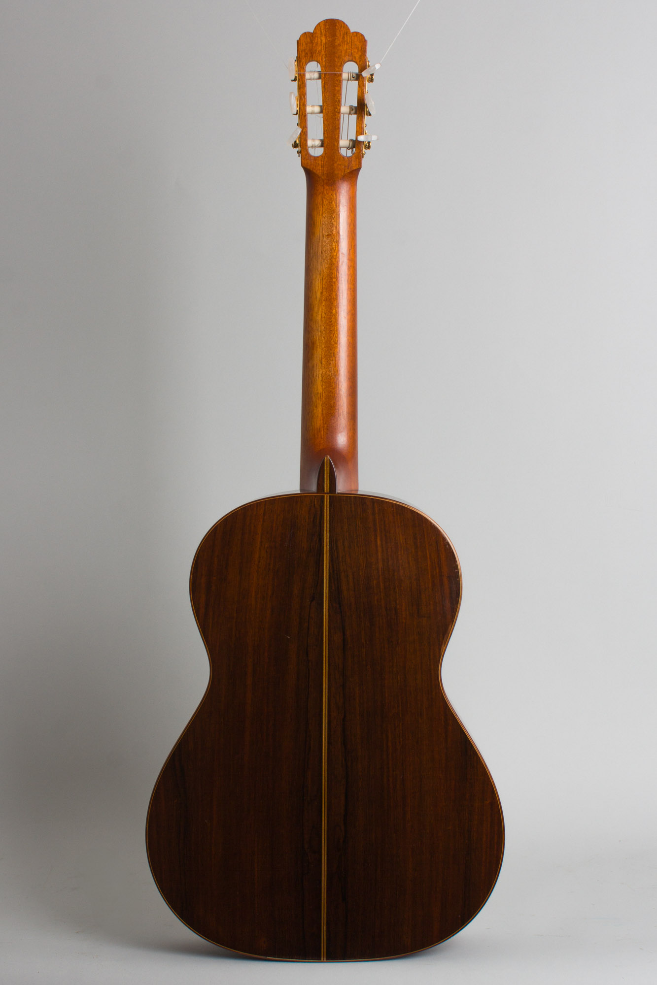 This is a typically elegant Velasquez concert guitar in his traditional Hauser mode. The back and sides are beautifully figured Brazilian rosewood, with all wood bindings and trim. The Spanish cedar neck has a 54mm nut width and a 650mm scale with a fairly typical "D" profile and is very comfortable to play. The rosewood-faced headstock has a simple round-peaked profile and the tuners are gold-plated Van Ghent strips typical of this era. The sound is deep and rich with considerable volume, and responds to a light touch while being capable of a wide dynamic range if forced. This is a particularly nice guitar from one of the later 20th century's most esteemed luthiers, a worthy instrument for the master player.