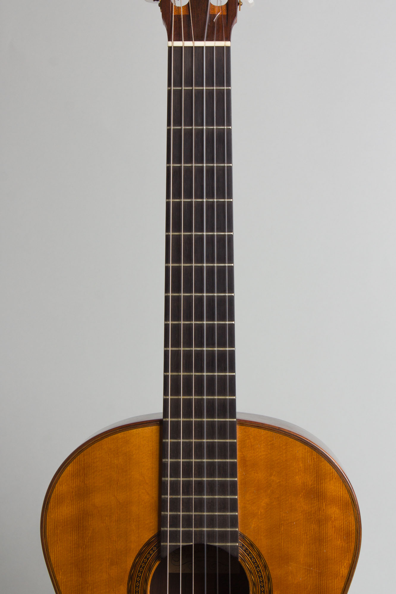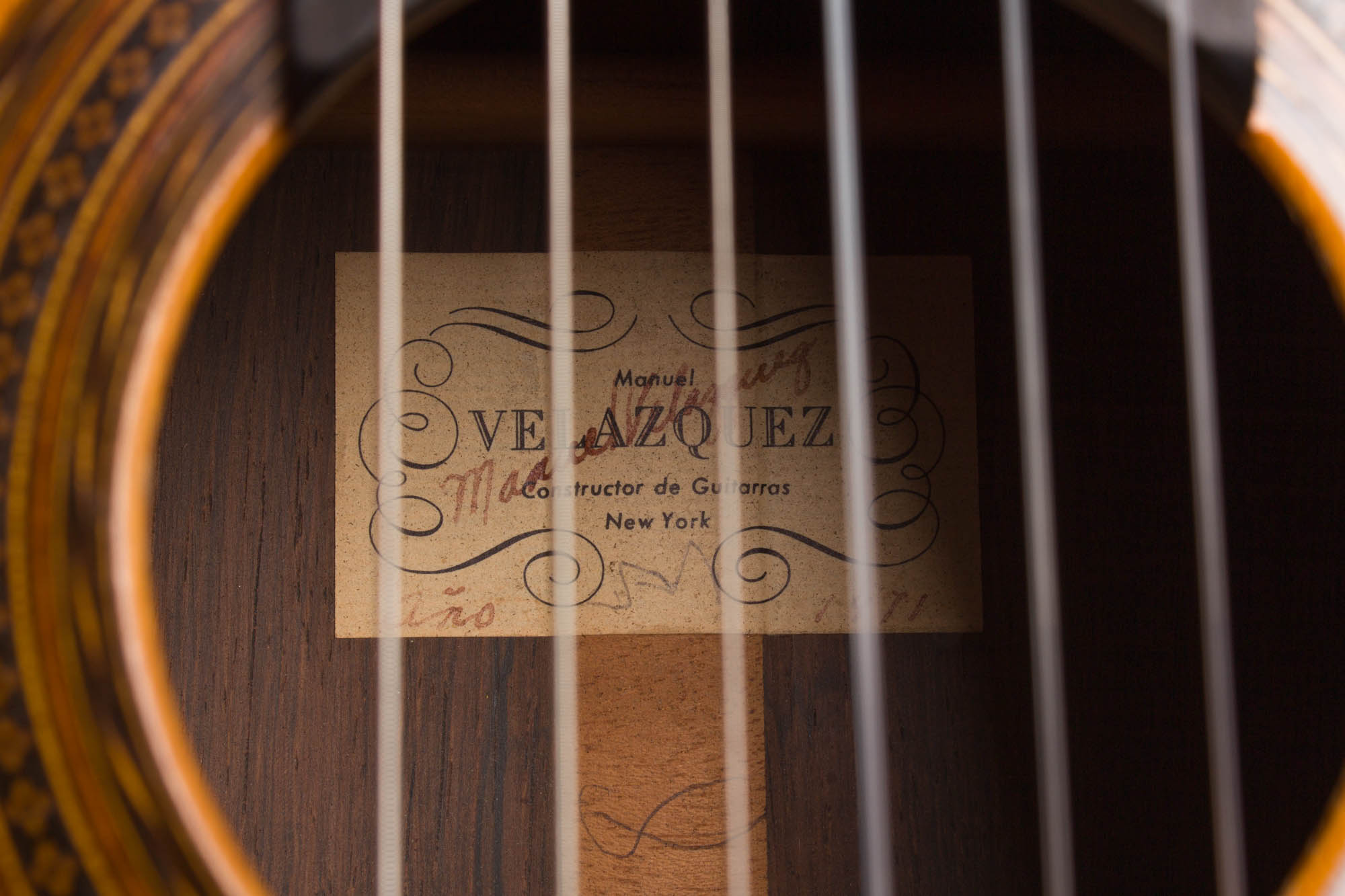 This truly superb classical guitar is the work of one of 20th century New York's most renowned luthiers, Manuel Velazquez. It was made in 1971, labeled "Manuel Velazquez, Constructor de Guitarras, New York." The elegantly simple label is hand signed by Velazquez and also has the date, "ano 1971", written by hand in brown ink. The guitar also has hidden signatures on the underside of the top, off each side of the fingerboard extension.