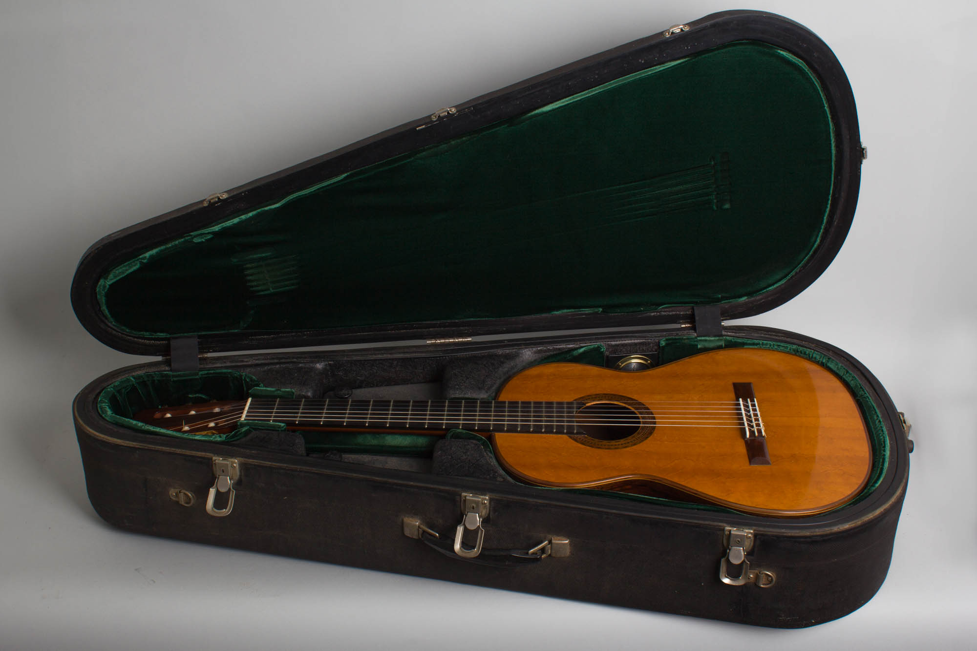 This guitar shows some general wear overall from use over the decades but remains a superb instrument to play. There are picking marks into the top finish below the strings, extending under the fingerboard extension and small impact marks from numerous re-stringings behind the bridge. The back of the neck is partially worn to the wood with one light ding between the first and second frets. The guitar has survived nearly 55 years with no cracks or notable repairs. Overall, this is a well played but finely cared for instrument, a really super example of Sr. Velazquez's best work. A wonderful instrument to play, hear or appreciate it also stands as an important piece of guitar history, particularly as related to the traditions of both Puerto Rico and New York. The guitar resides in a large deluxe Mark Leaf case with built in humidity monitoring. Overall Excellent - Condition.
