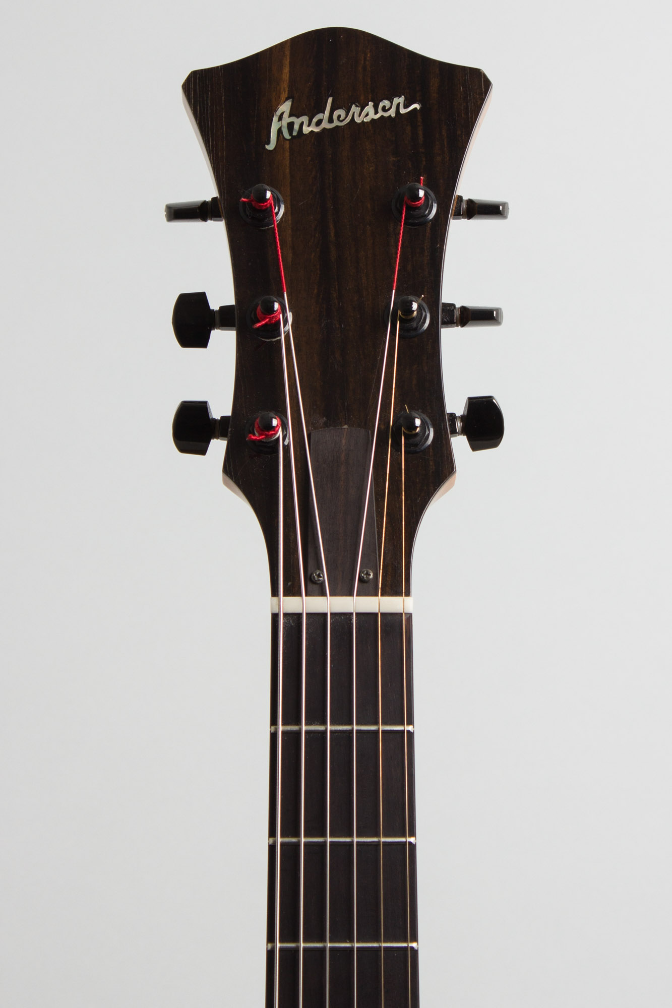 The instrument itself is a traditional 16 3/4" wide carved top guitar, built with beautiful flame maple for the back, sides and neck and lovely even-grained spruce for the top. The fingerboard, bridge and tailpiece are high-grade ebony and all bindings are wood. The delicately carved top is X-braced, the one-piece neck is a lovely shallow "C" profile that feels effortless to play. A floating pickup/pickguard assembly is fitted, wired to an output jack in the side. A strap button is fitted to the side on the upper bout.