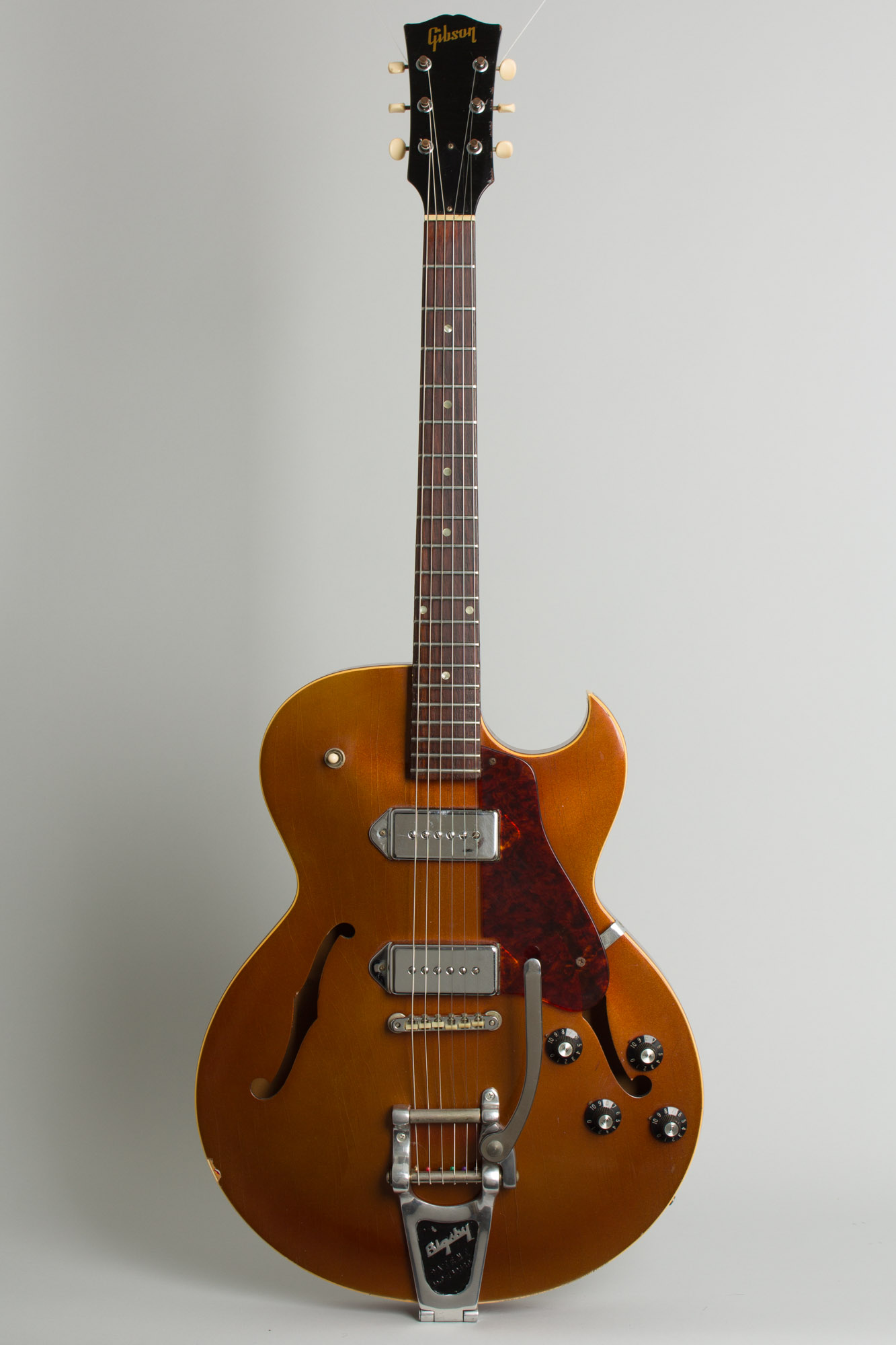 An unusual feature of this later guitar is a Tune-O-Matic bridge mounted directly to the top on posts like an ES-330. Earlier examples used a floating wooden bridge making them less adaptable to lighter gauge strings and comparatively difficult to intonate correctly. The Bigsby/Tune-O-Matic combination help give this one a sharper tone than earlier wooden-bridge examples. This extra-flashy hot rod ES-125TDC is quite a versatile instrument suitable for a wide range of sounds as long as you leave that 100-watt Marshall at home!