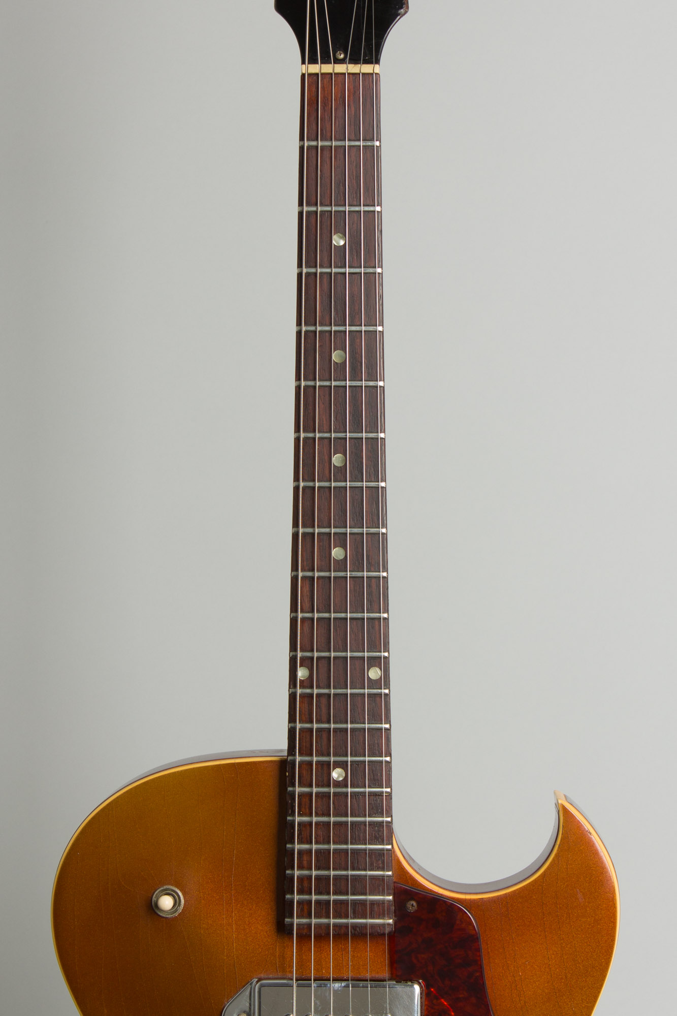 This is a largely original guitar overall, showing some general wear but no damage or major repair. The all-original finish has faded a decent amount, the deep red "Burgundy" color muted to an attractive reddish/gold shade particularly on the top and upper side. It shows some fairly heavy checking overall (common to this multi-coated metallic lacquer) with noticeable dings, scratches and chips over the entire instrument but no large areas of finish worn away. The checking on the back of the neck is heavy enough to be feelable when playing.
