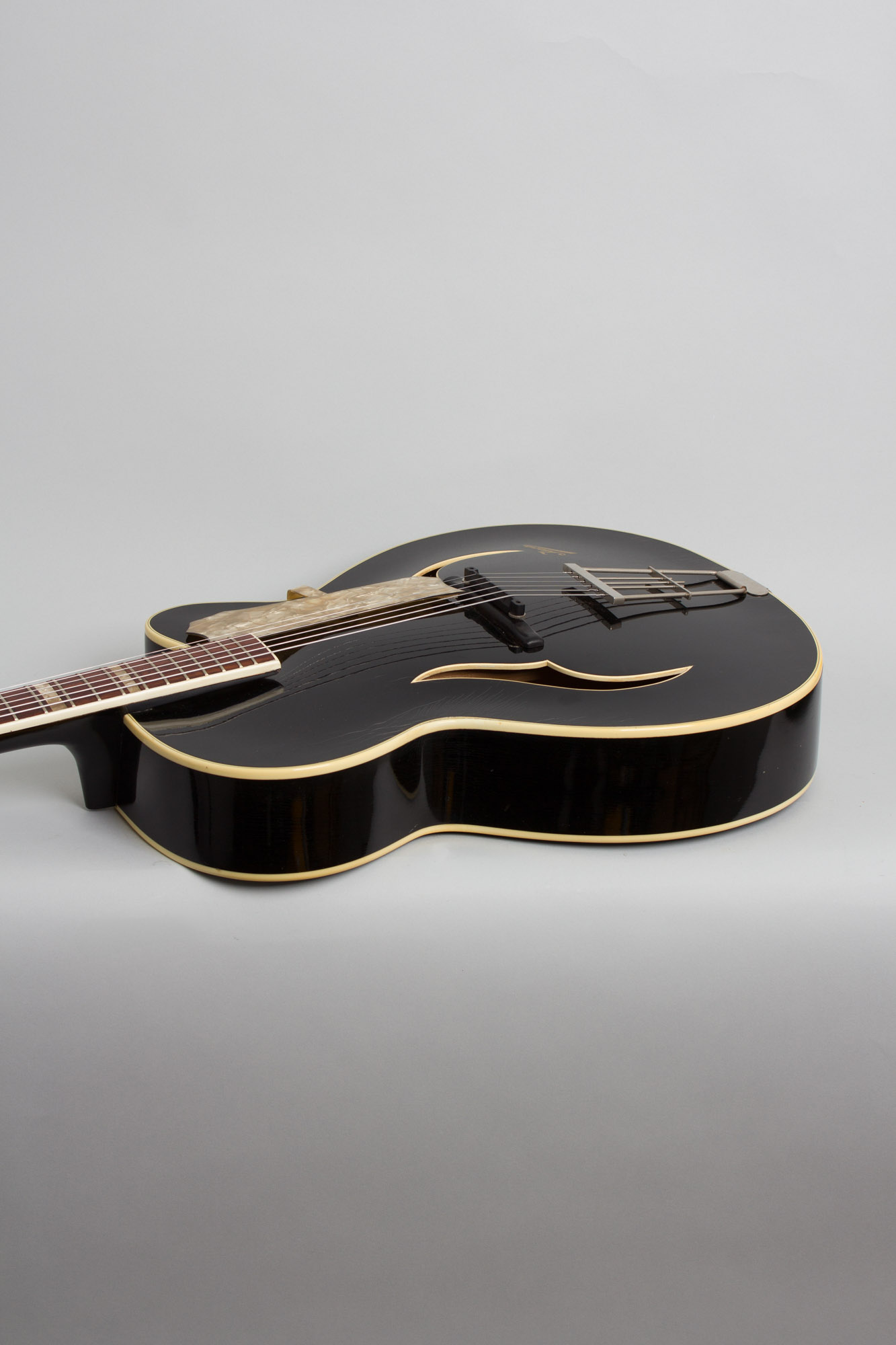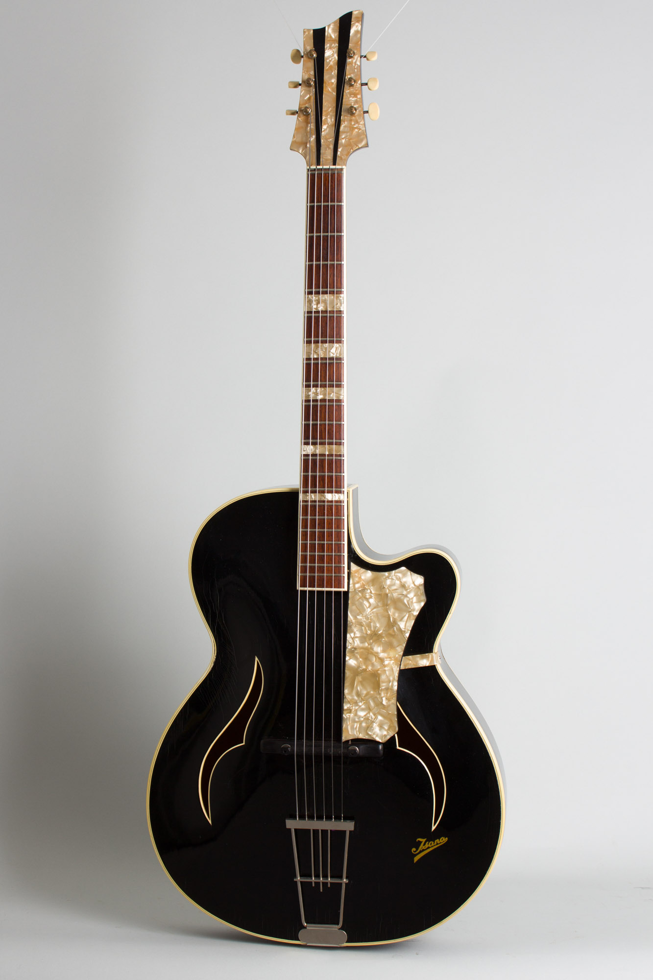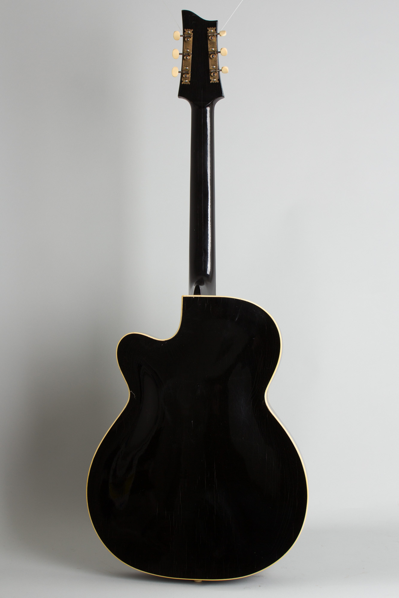 Isana Black Pearl Model Arch Top Acoustic Guitar (1959), made in Nauheim, Germany, black lacquer finish, maple back, sides and neck, spruce top, rosewood fingerboard, molded fiberglass hard shell case.