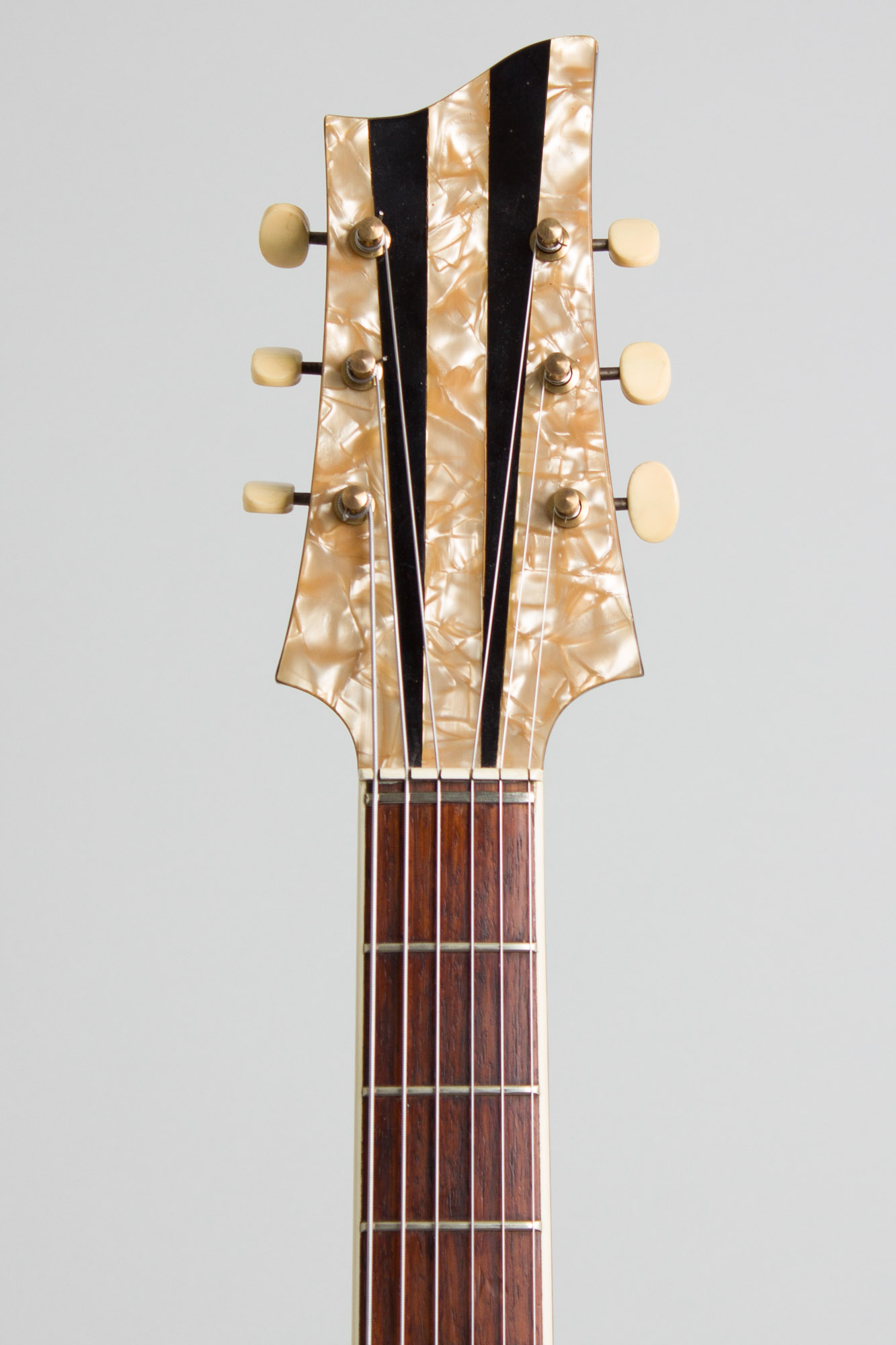 The "Black Pearl" is a very elegant looking instrument in this "tuxedo" livery; perhaps Elvis picked it specifically for the look; he was always a stylish cat! Construction is typical of German archtops from this period. The single-cutaway body is made of laminated maple, triple bound on top and single bound on the back. The abstract "slash' soundholes are another typically German feature; the pickguard is made of the same dramatically grained pearloid material Hofner often used but is in a shape unique to Isana, with the bracket made of the same material.