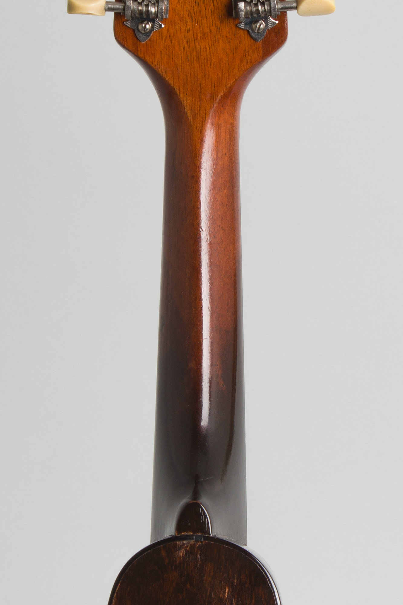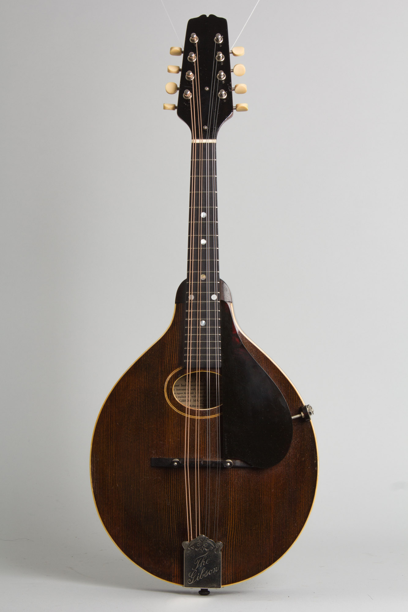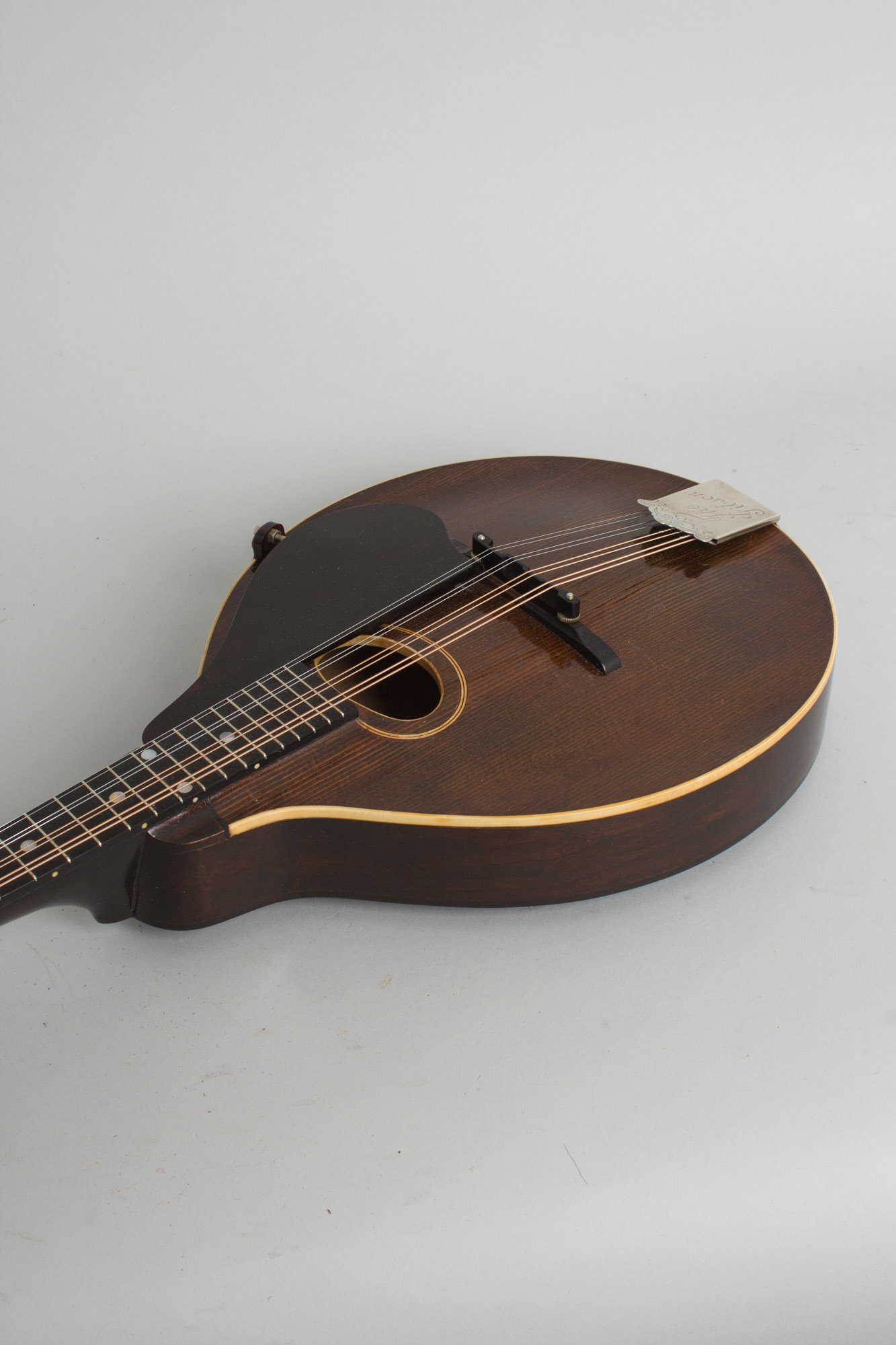 The top on this Style A bears the older "Sheraton Brown" top finish, which was about to be discontinued in favor of basic black. The top is bound in white celluloid with a thin 5-ply inlaid soundhole ring. The back is bound in tortoise Celluloid, an unusual feature for a style A found only right around this time. The tailpiece has the engraved "The Gibson" cover plate and the tuners are pointed-end Waverly strips. The plain headstock does not bear a Gibson logo and the pickguard clamp is one of the last of the old 1910s pieces mated to the new metal shaft, a leftover fitting soon replaced with a simple screwed-on bracket.